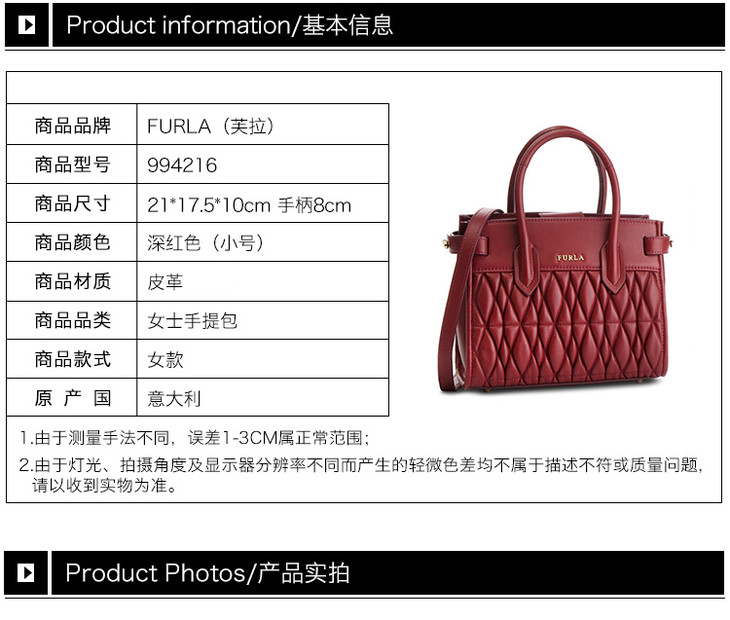 【香港直邮】QH Furla 芙拉 女士深红色皮革手提包 994216