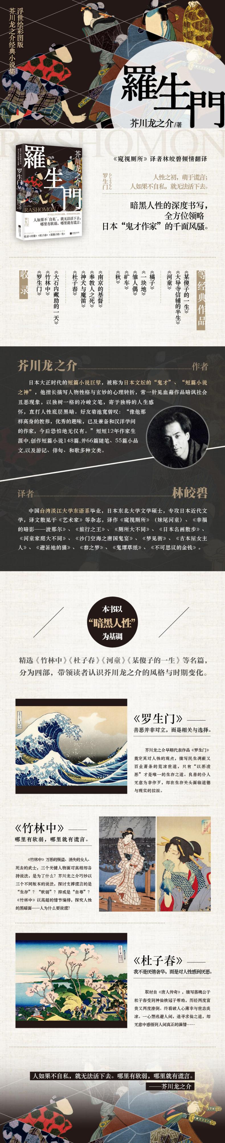 芥川作品内容诡谲多变,他擅长描写人物性格及其玄妙的心理转折,洞悉人性很深层的丑恶与黑暗。并将自身对现实困境的不安、内在精神的痛苦、对人性的透彻,全倾注为文学艺术的魔化与很好之美。《地狱变》是他极具代表作的作品,透过特别化的人间悲剧,描写权力与艺术对峙的主角良秀,也彷彿就是他的化身,真实表现出他“艺术至上主义”的创作态度。《鼻子》初发表,即受到夏目漱石赞赏,正式登上日本文坛一席之地。《芋粥》描写的是人性欲望渴求背后的矛盾心理。《蜘蛛之丝》乃芥川本以童话为创作形式的小说,曾多次收入日本及台湾地区之教科书选文。《秋山图》巧妙揉合元代画家黄公望之同名画作,虚虚实实,假假真真。《点鬼簿》带有浓厚的自传成份,描述芥川与家族之间的过往回忆。《玄鹤山房》透过人物间的互动,充分展现芥川阴暗绝望又悲观的写作手法。《齿轮》为芥川遗作,被许多评论家视为芥川的优选杰作。从文章中可看出芥川陷入的困......