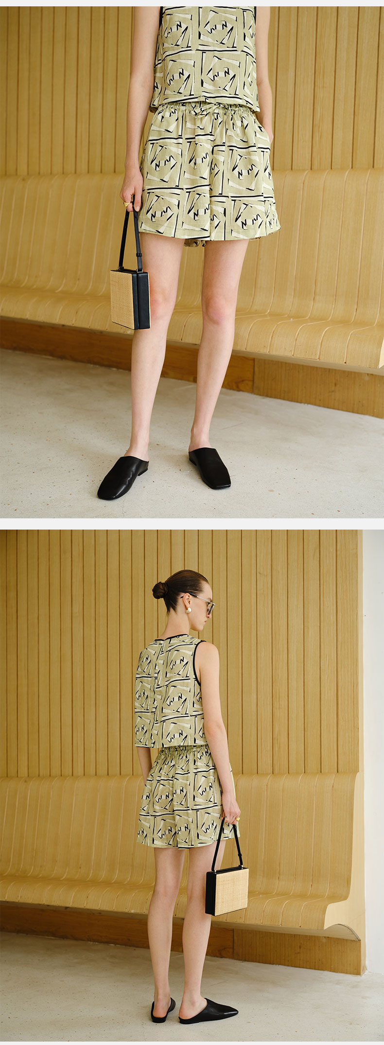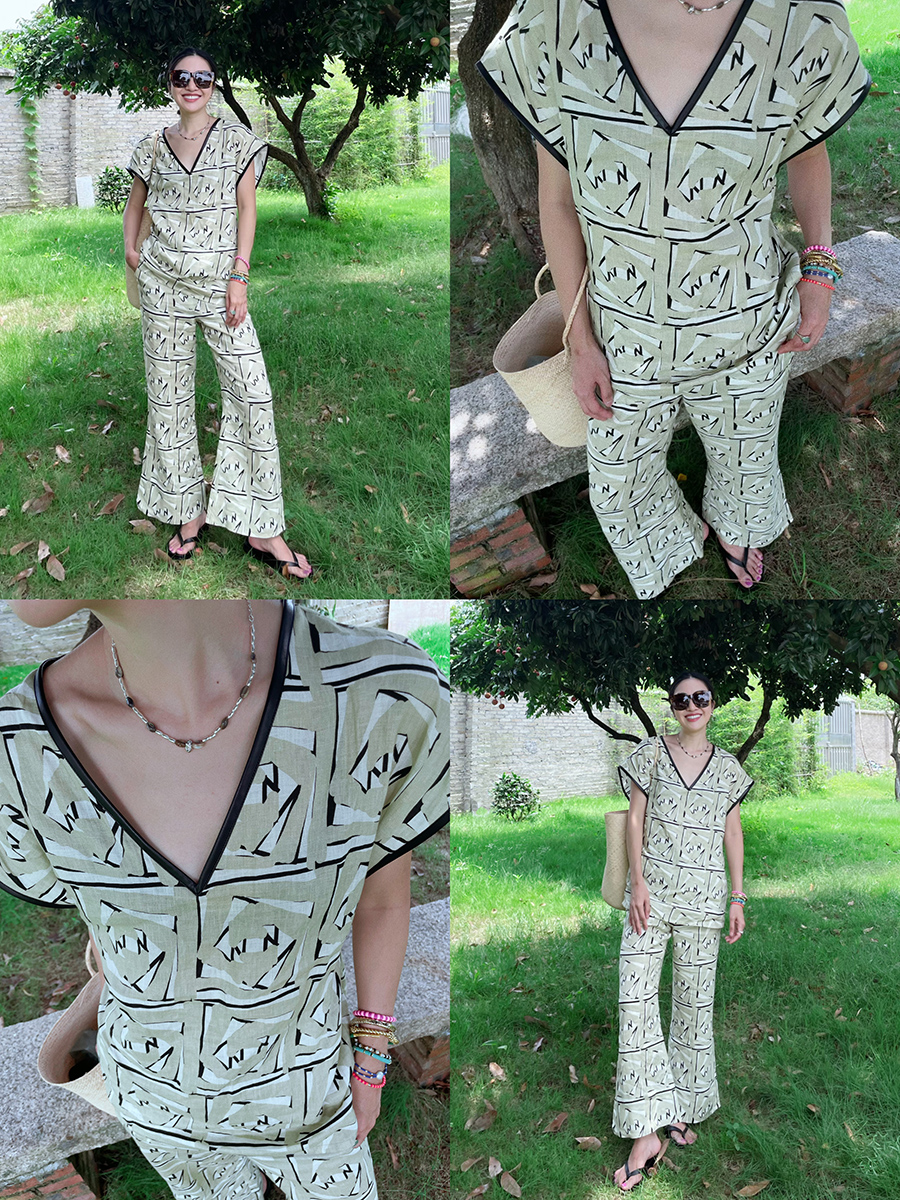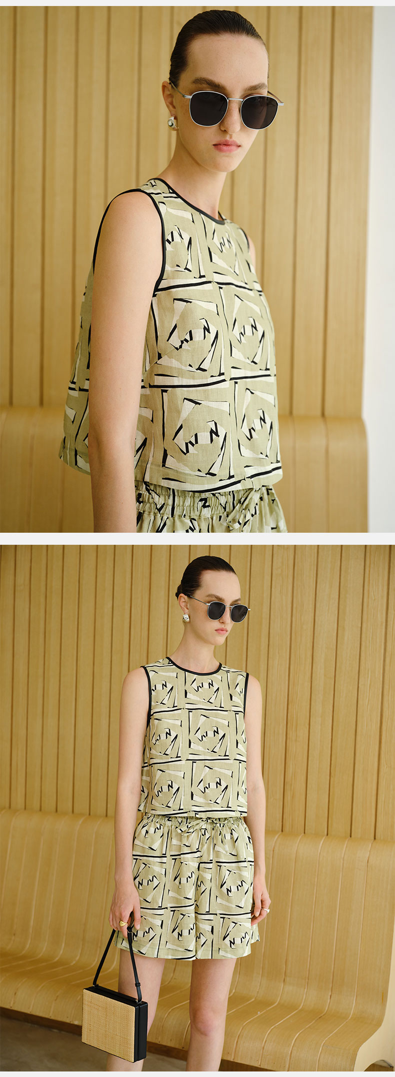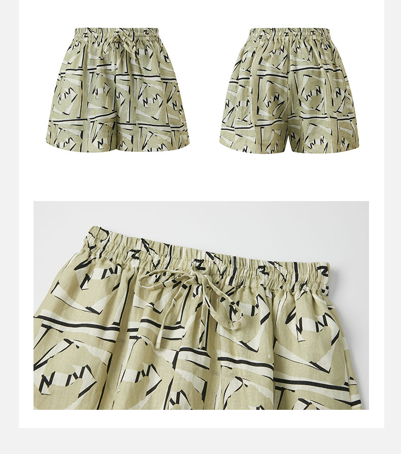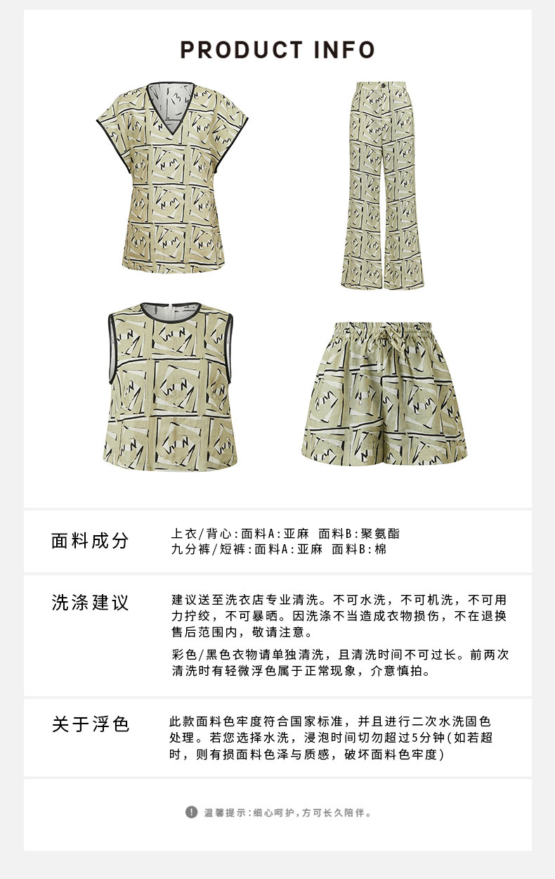 HIDEMI 度假系列水洗亚麻手绘印花手工包皮边四件套 v领上衣/九分裤/短裤/背心