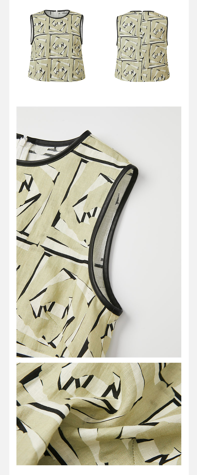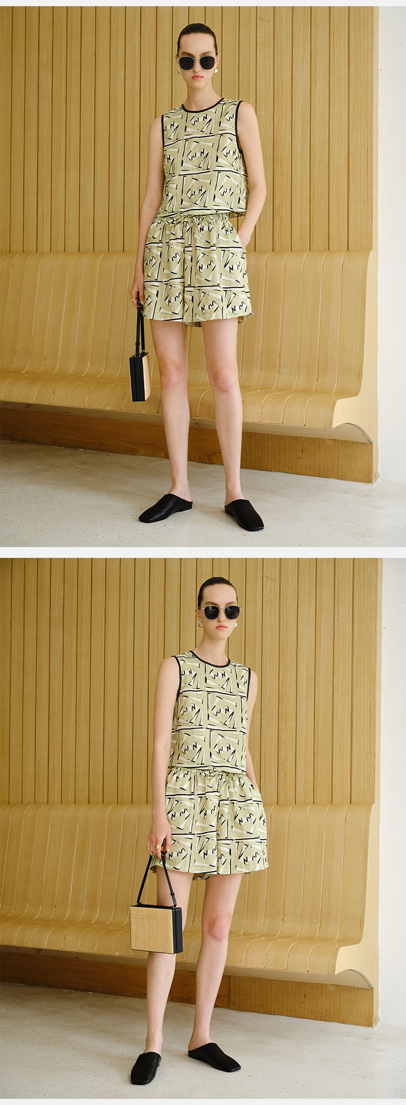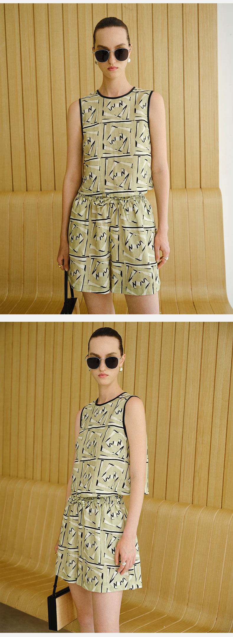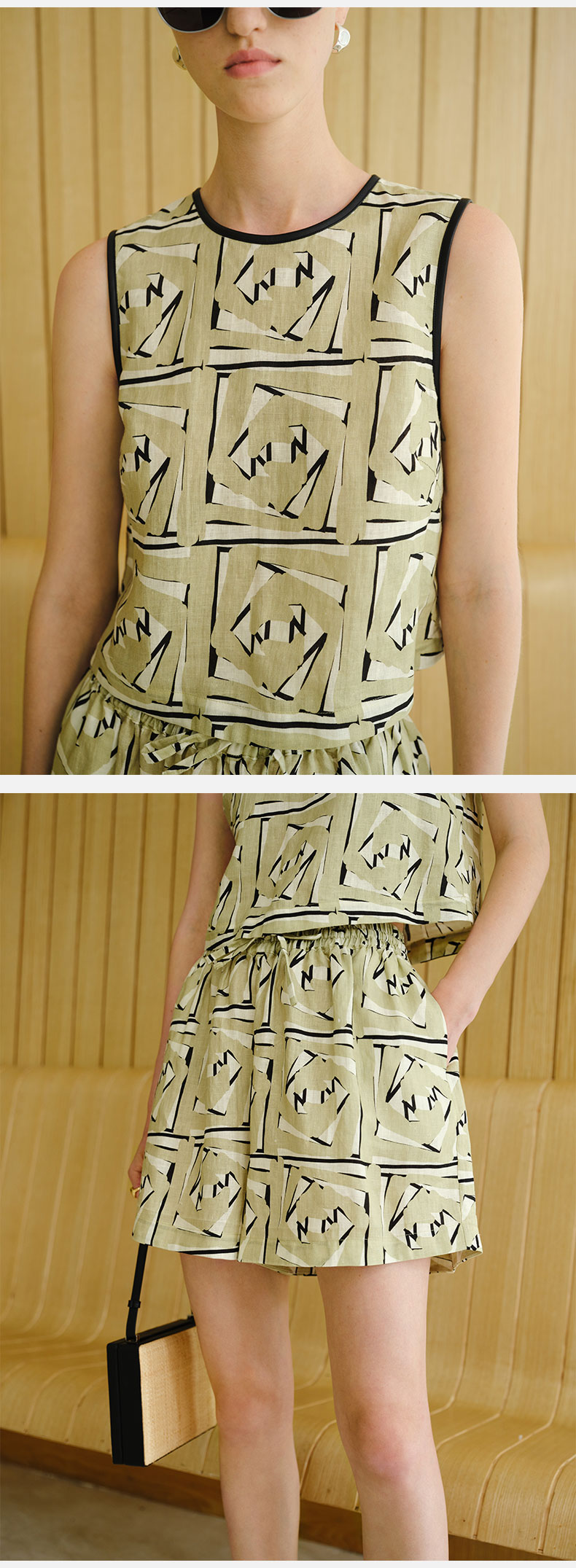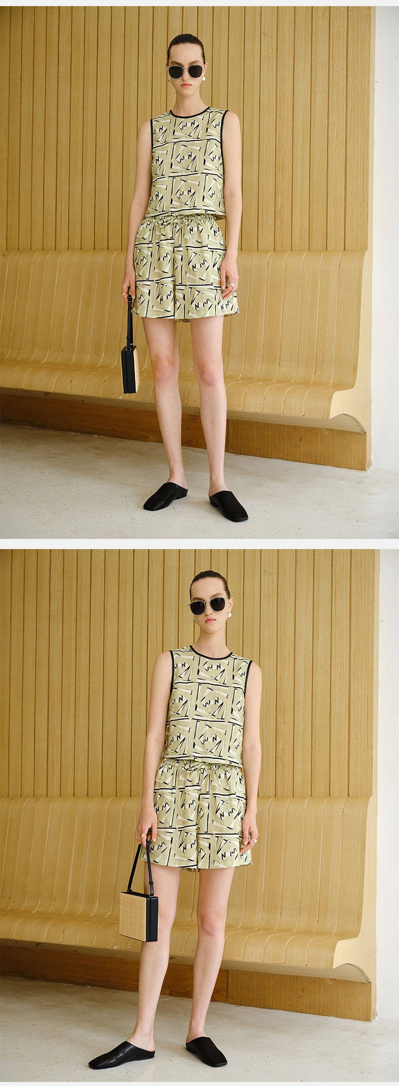 HIDEMI 度假系列水洗亚麻手绘印花手工包皮边四件套 v领上衣/九分裤/短裤/背心