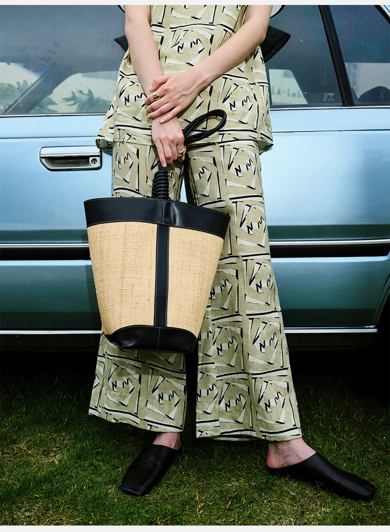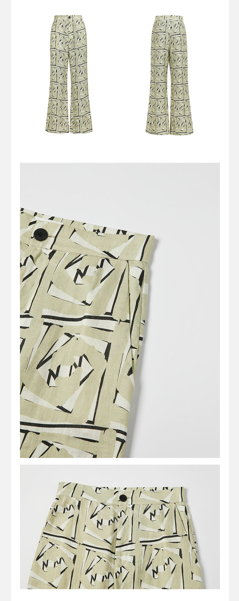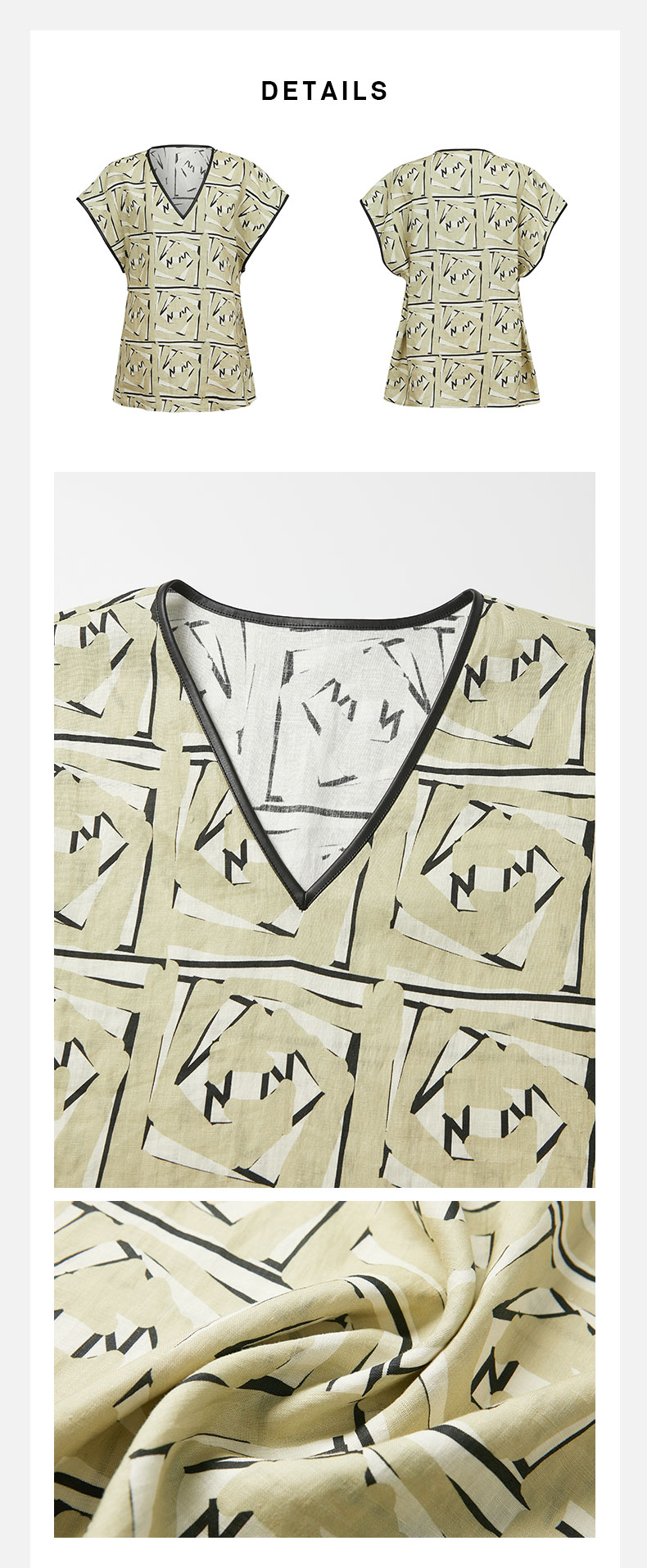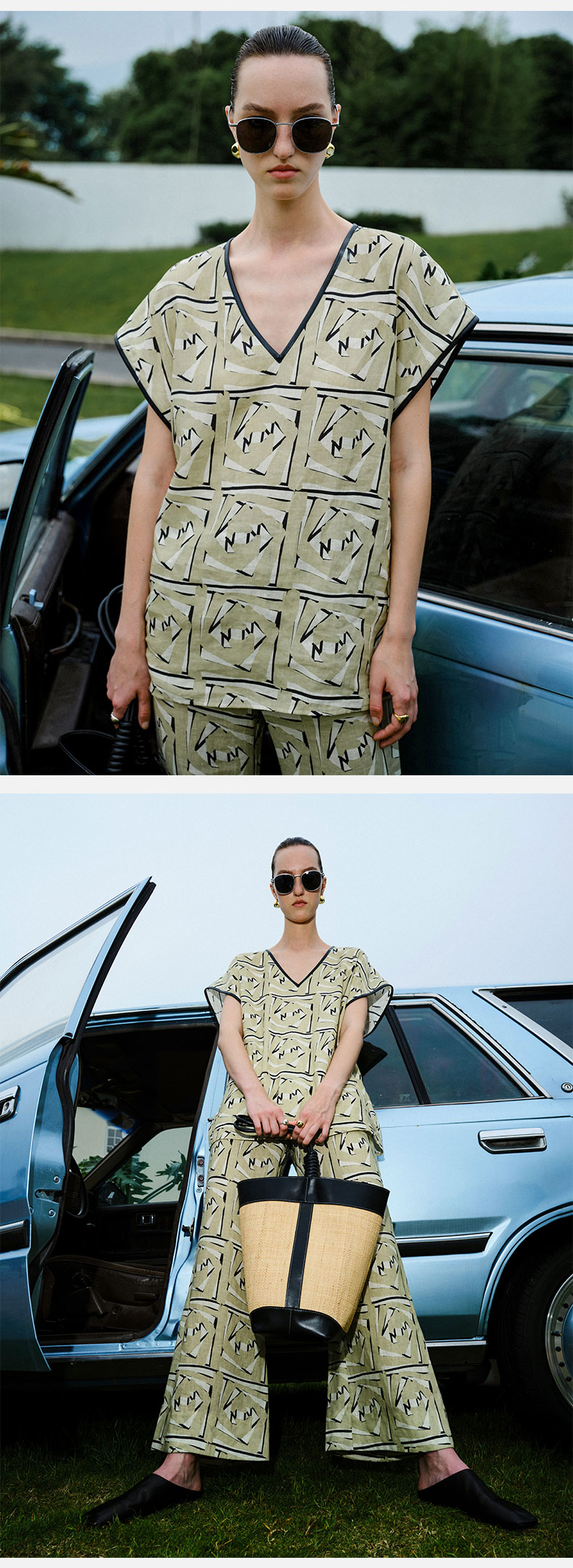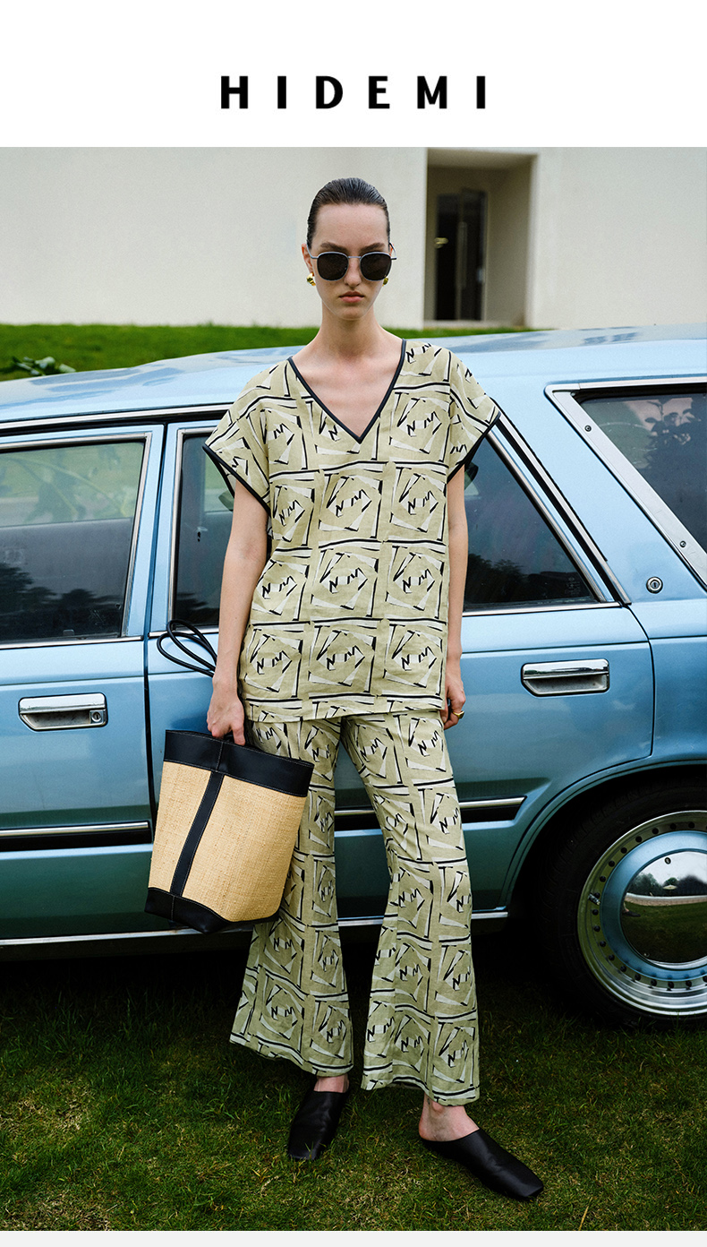 HIDEMI 度假系列水洗亚麻手绘印花手工包皮边四件套 v领上衣/九分裤/短裤/背心