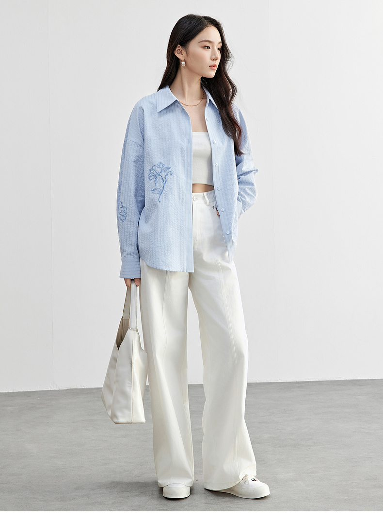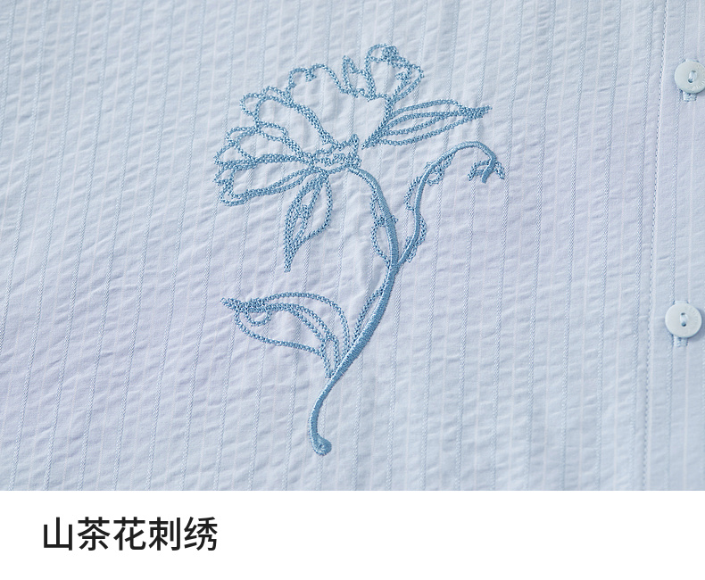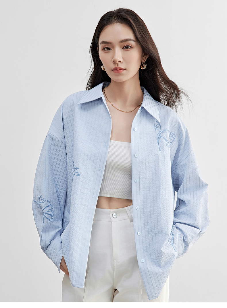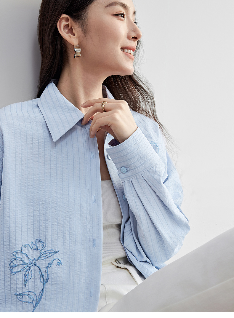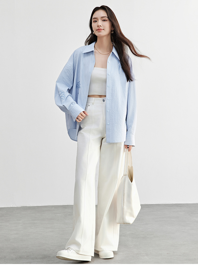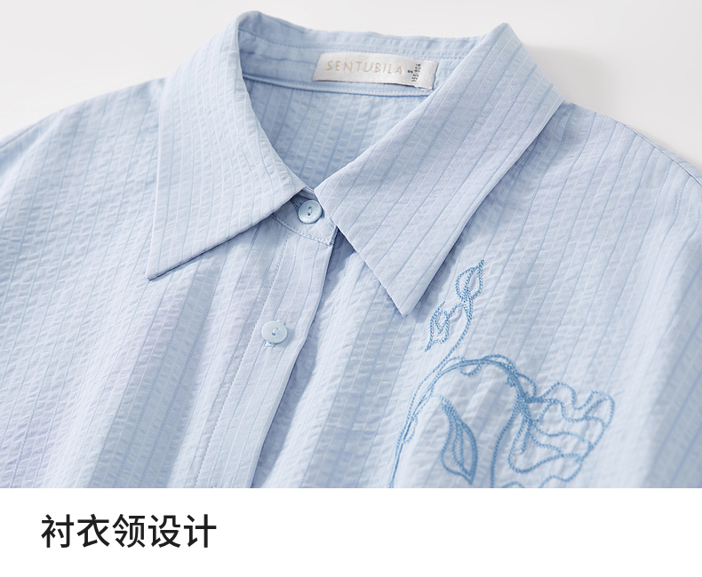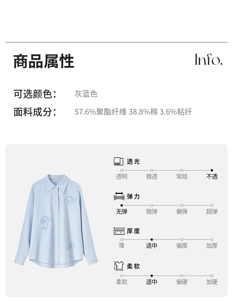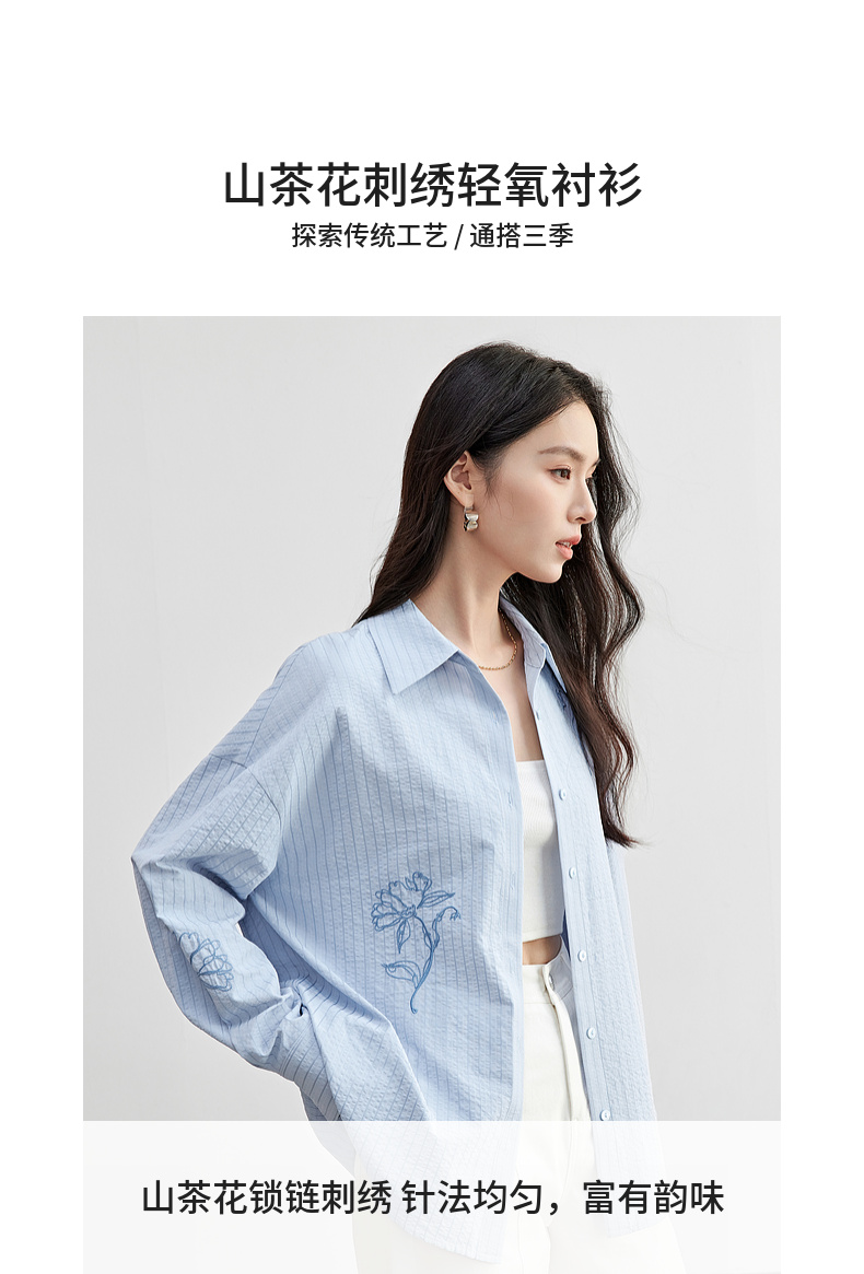 【内购】通勤简约翻领前短后长弧形下摆暗条纹宽松轻氧衬衫-151C58138