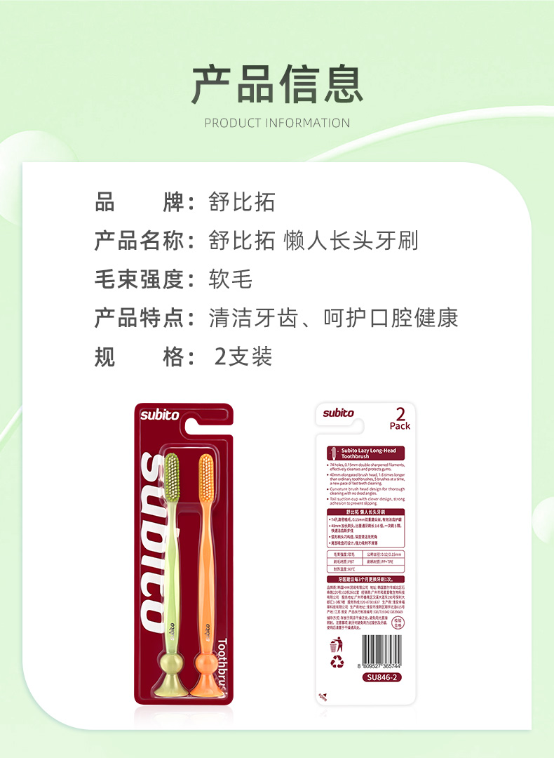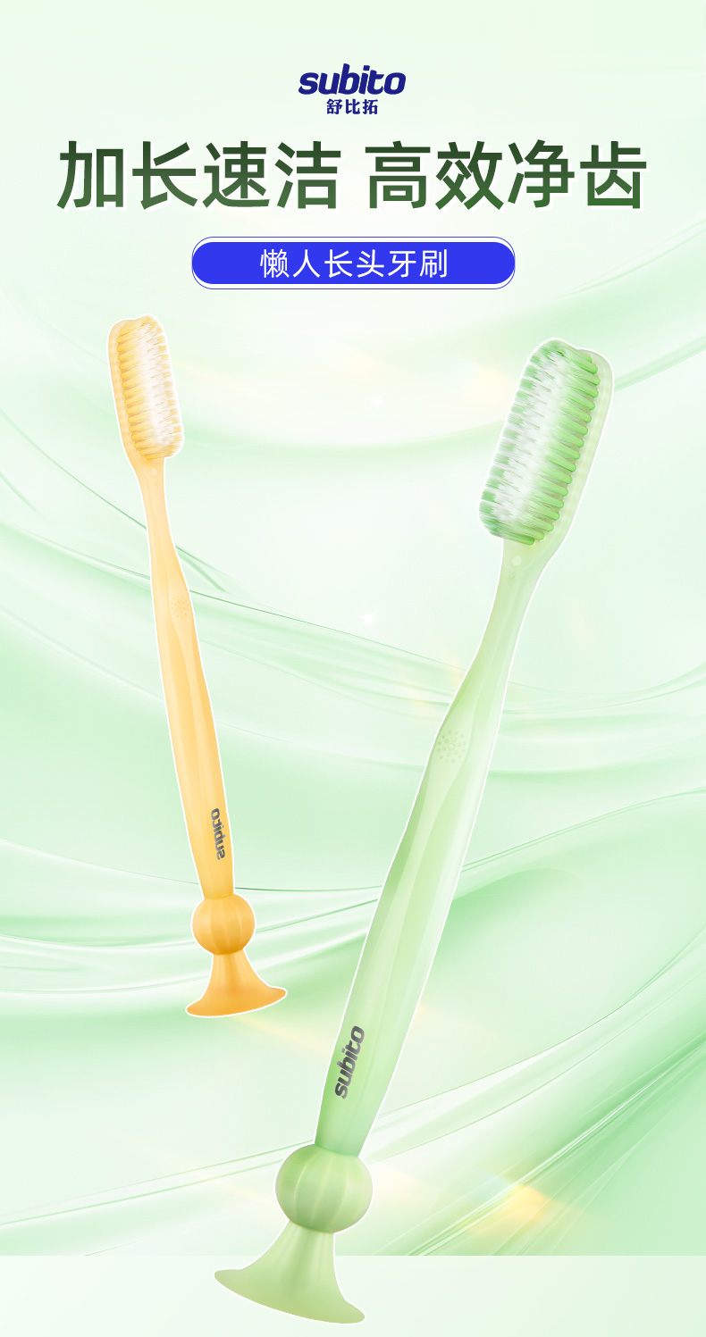 舒比拓懒人长头牙刷2支装软毛-5744 自带吸盘 加速沥干水分