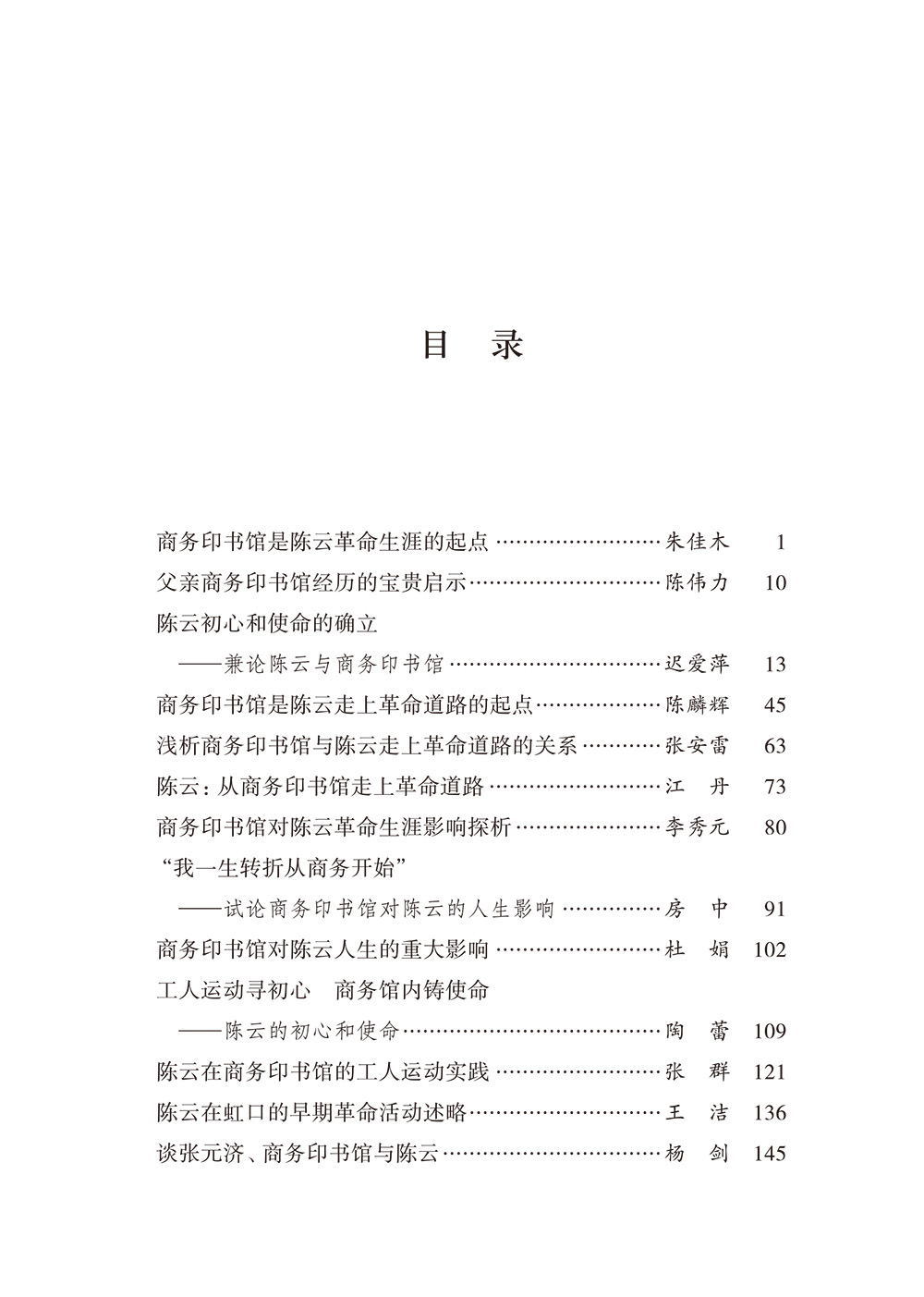 商务印书馆是陈云同志当过学徒,也进行过阶级斗争的地方,是陈云走上革命道路的起点。中国中共文献研究会陈云思想生平研究分会、陈云纪念馆、商务印书馆于2019年11月20日在北京联合举办了“陈云与商务印书馆――纪念陈云走上革命道路100周年”学术研讨会,本文集为会议成果汇编,收入与会的朱佳木、陈伟力、迟爱萍等专家学者论文共19篇,回顾了陈云同志在商务印书馆的学习成长历程和革命实践活动,探讨了这段经历对陈云同志的重要影响,总结了陈云同志非凡的人格风范与革命精神。