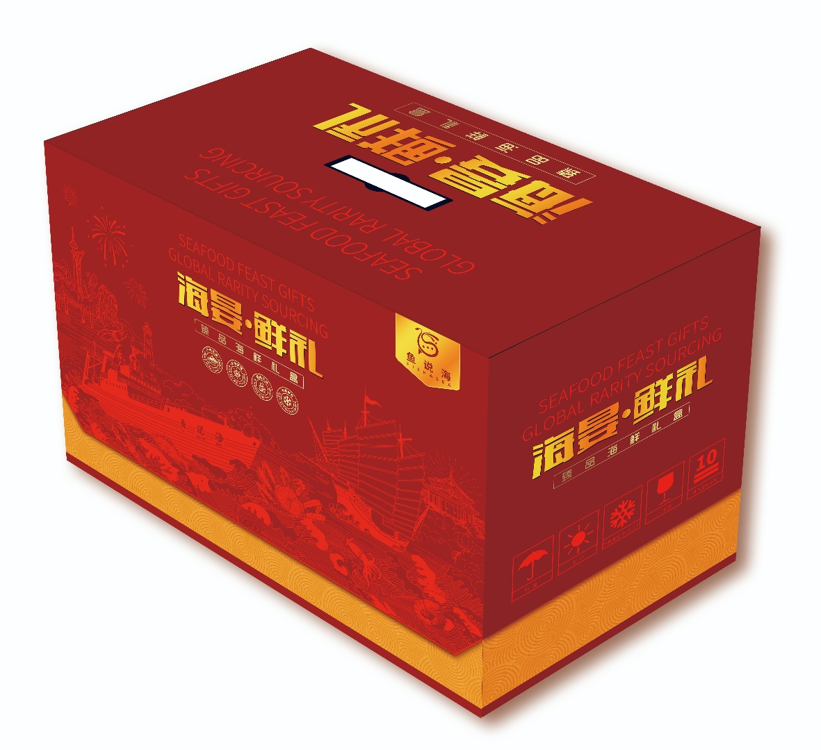 该礼盒设计的主题颜色为深红色,配合金色的细节和红色的海鲜元素插画,同时制作工艺也采用了烫金和uv工艺,不仅增强了视觉效果,还增强了用户的触觉体验,使整体增添了奢华感和高级感,新年的烟花及国风圆形元素的点缀映衬新年氛围,更加让您走亲送礼不失牌面。