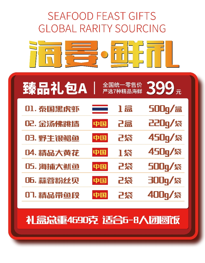 内含7件单品(分别有泰国黑虎虾、金汤佛跳墙、野生银鲳鱼、精品大黄花、海布大鱿鱼、蒜蓉粉丝贝、精品带鱼段)。
