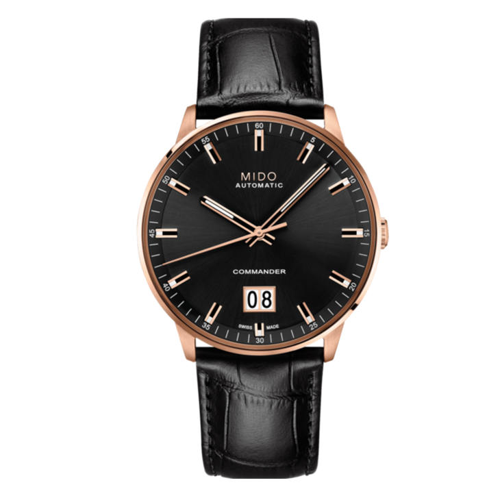 镜面 材质 | 蓝宝石水晶玻璃 | 表盘 | PVD镀玫瑰金精钢表壳 黑色丝光打磨太阳纹表盘 镶贴时标 大三针 大型日期视窗 透底 |