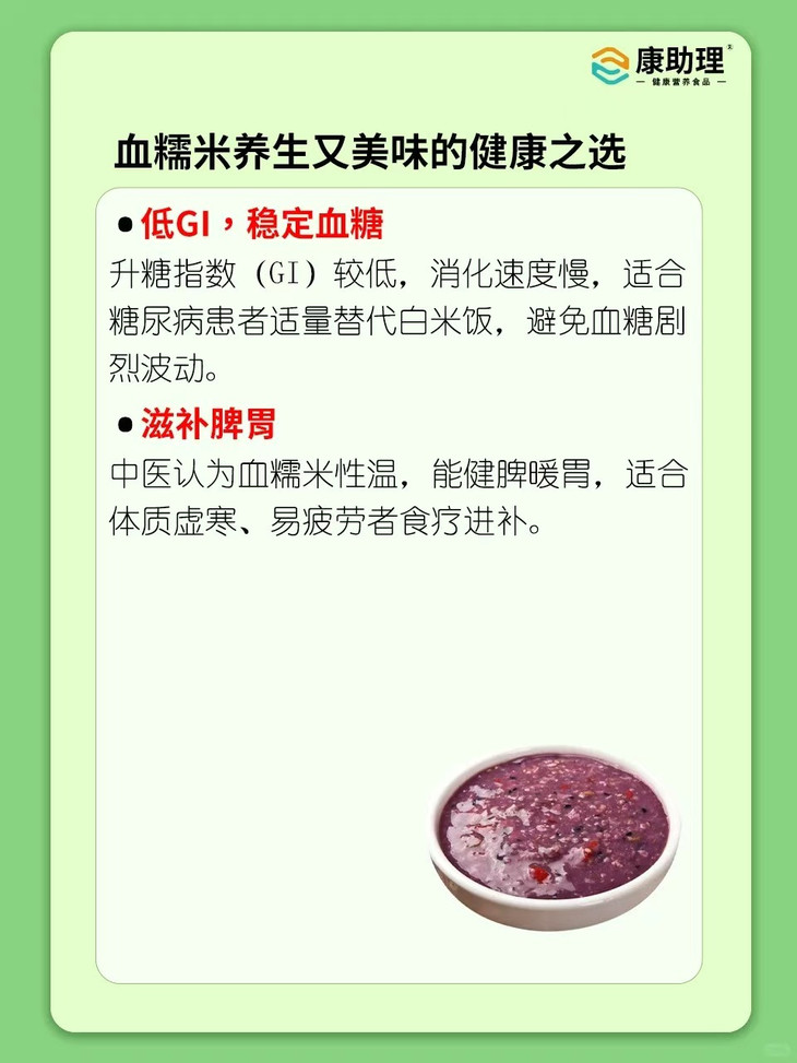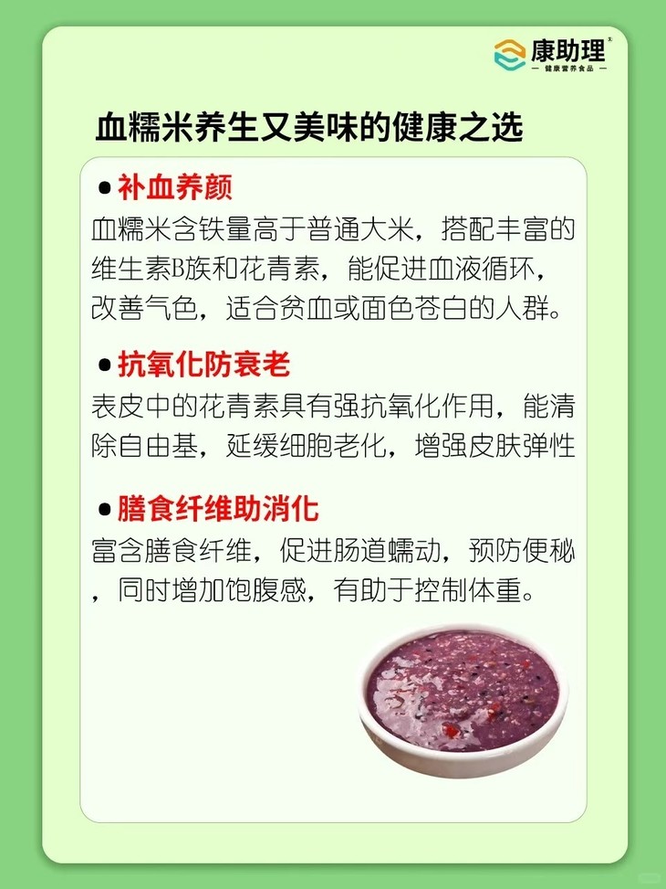 血糯米的营养和功效: ✅富含花青素,强力抗氧化 ✅补血养血,改善气色 ✅滋补身体,健脾暖胃 ✅膳食纤维丰富,助消化促排便 ✅营养全面,提供能量