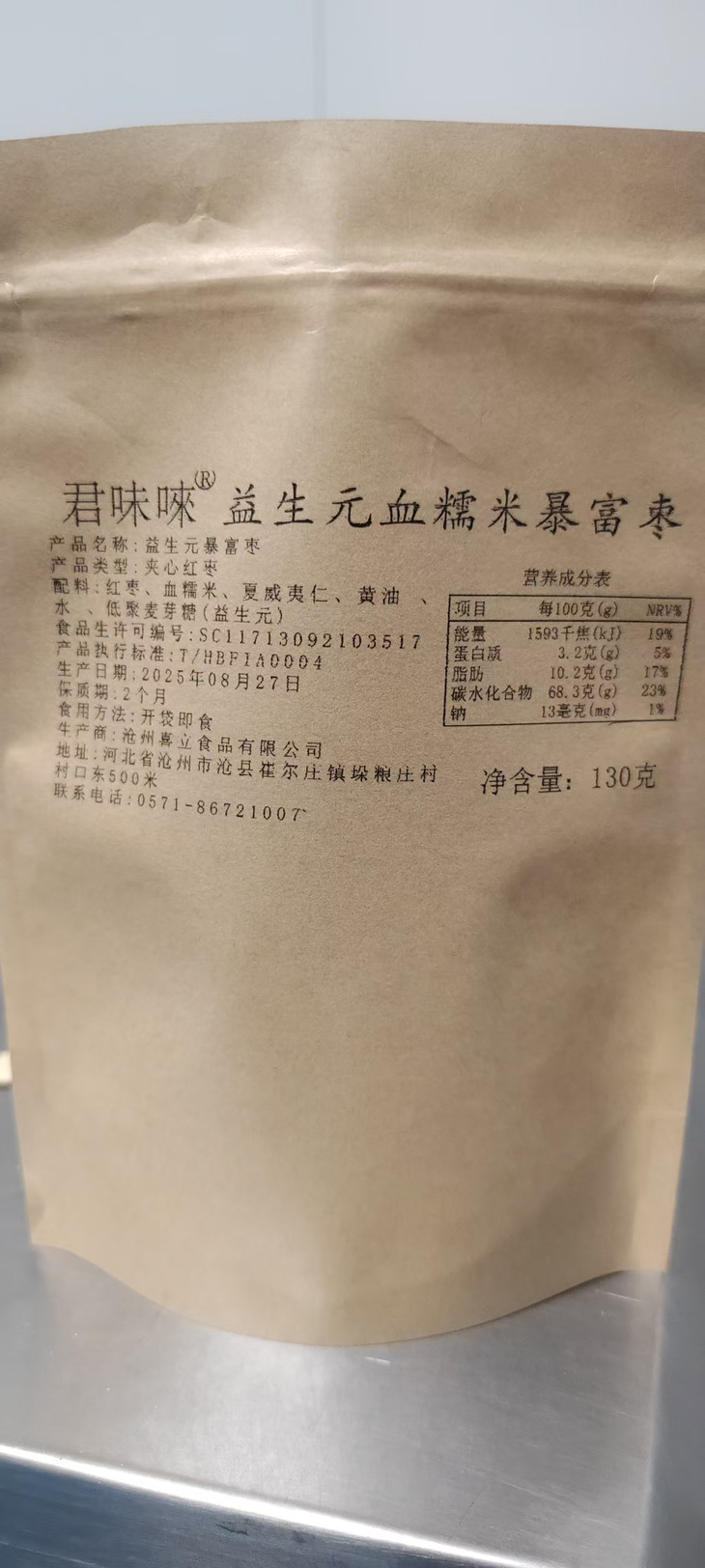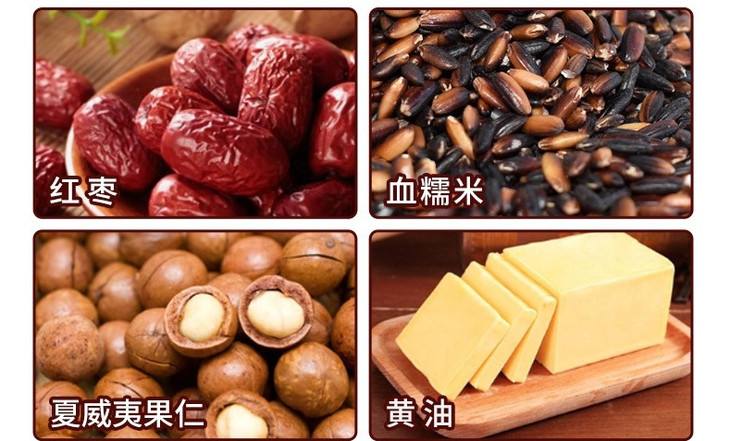 配料表干干净净 只有红枣、血糯米、夏威夷果 不需要添加剂去改善口味 老师傅纯手工制作 不会很甜也很健康 都是健康营养的食料 口感超级丰富!