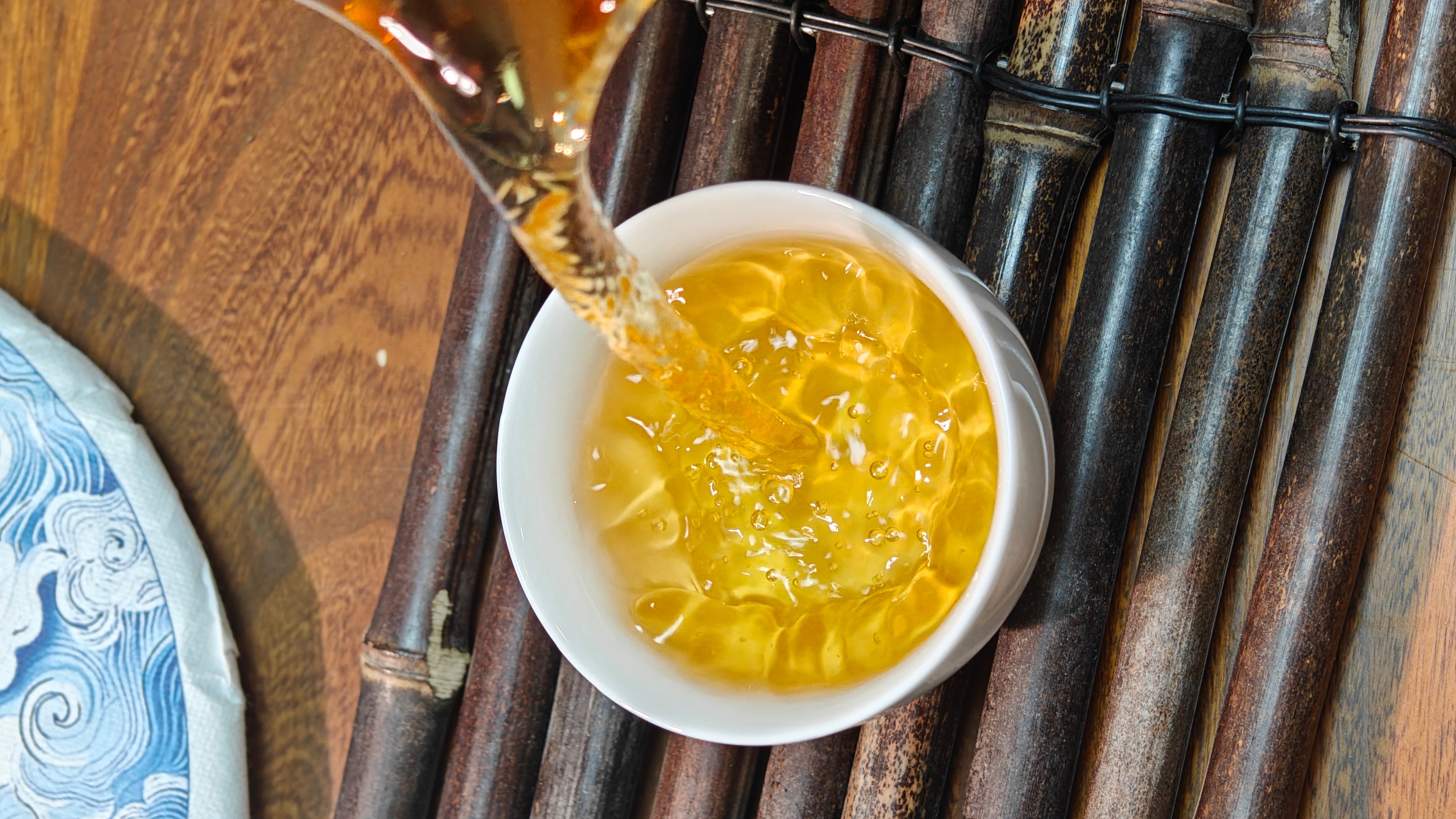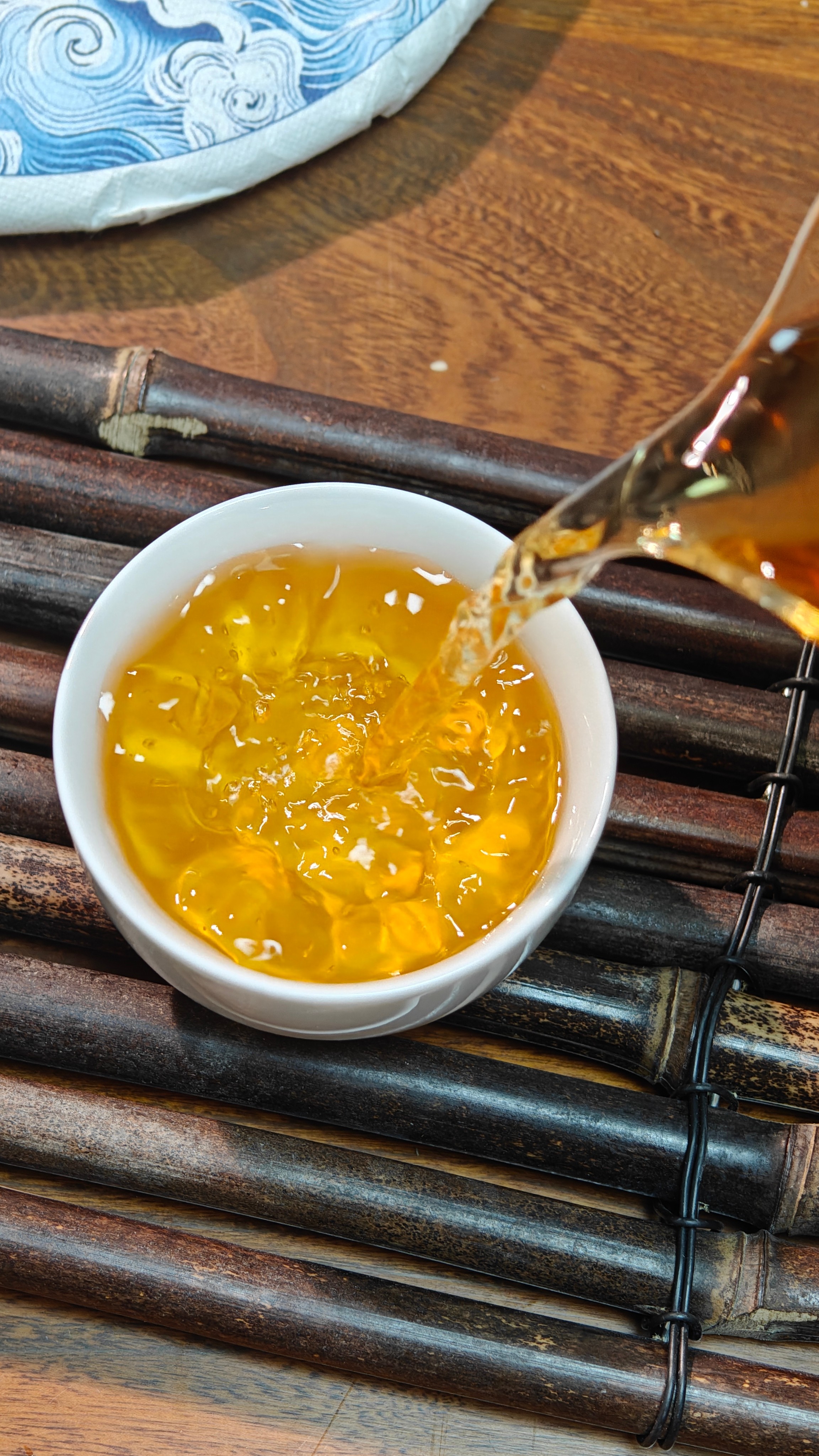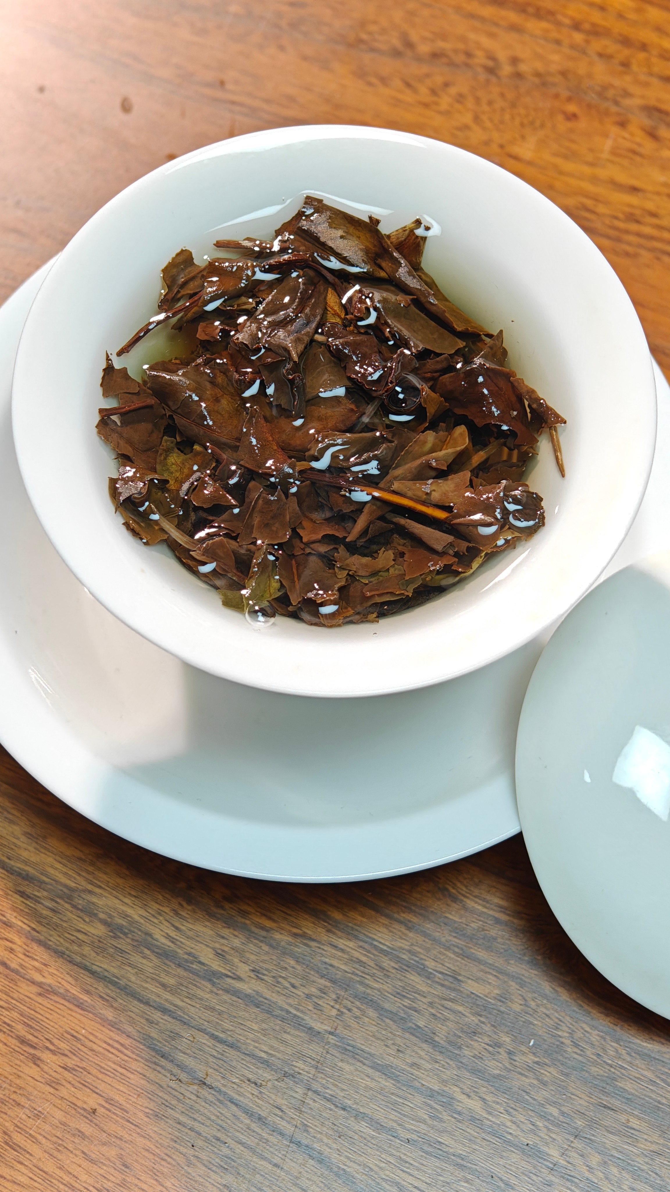 经过7年陈化,口感温润,香气委婉持久,果香枣香、药香,富有胶质感,汤色橙红,茶汤更加厚重绵柔,茶性温和。
