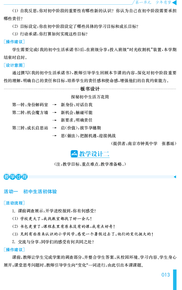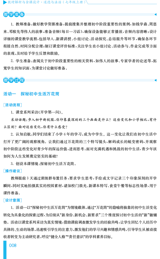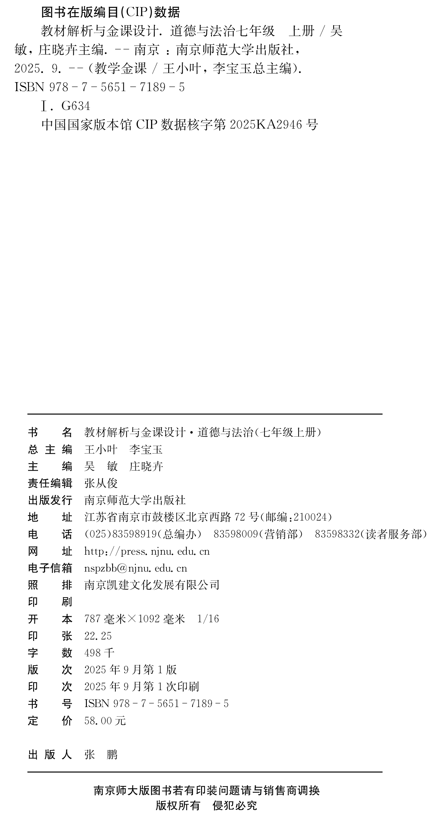 教材解析与金课设计·道德与法治(七年级 上) 总主编:王小叶、李宝玉,主编:吴敏、庄晓卉 南京师范大学出版社 正版书籍