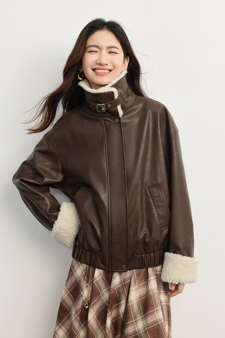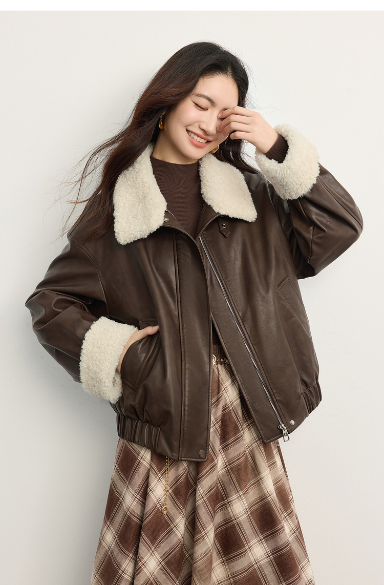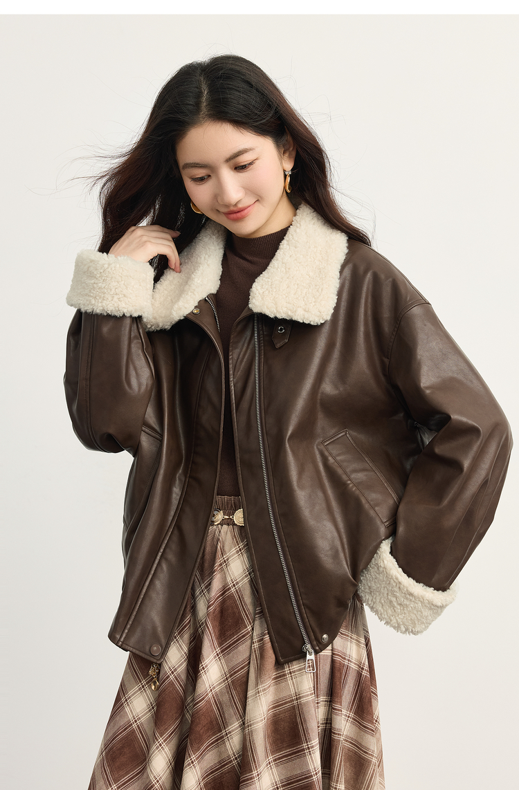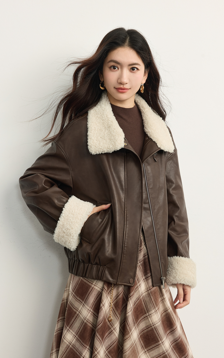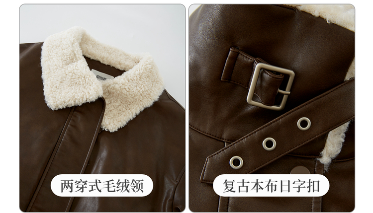 【11/14新品】熙世界雅丹风毛绒翻领花苞皮衣短外套女保暖夹棉PU夹克2025冬新款
