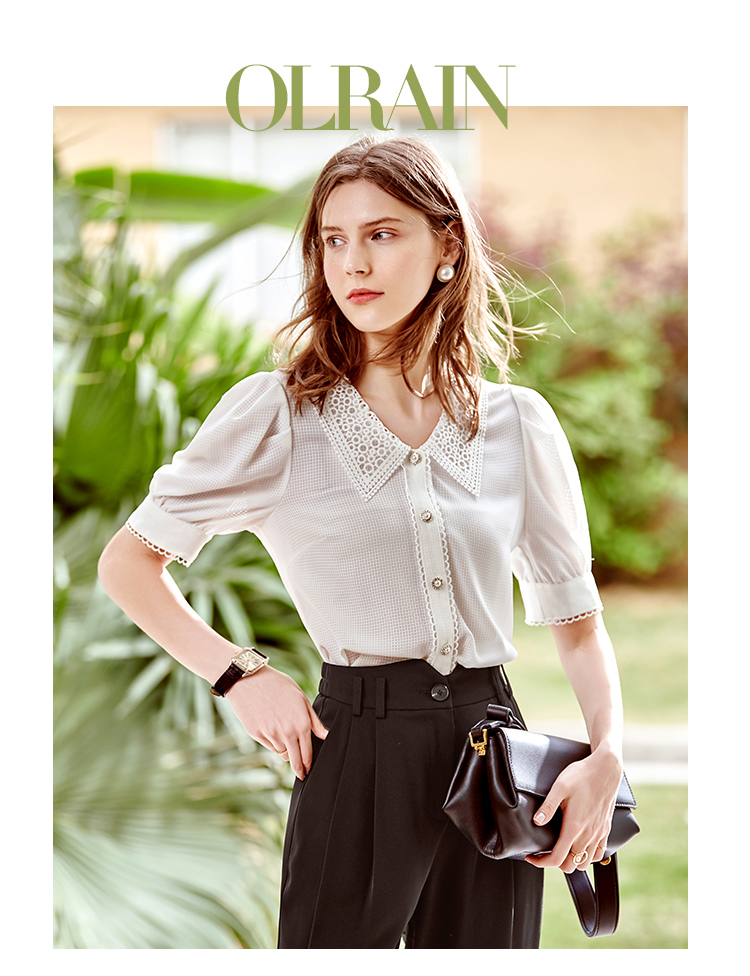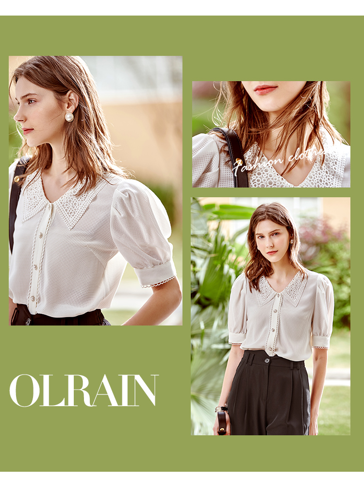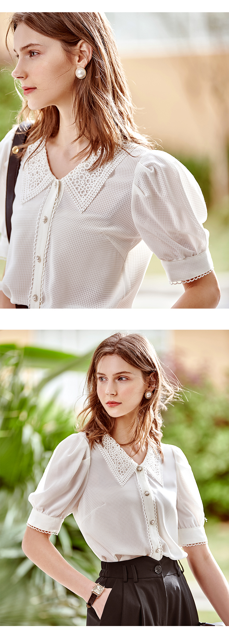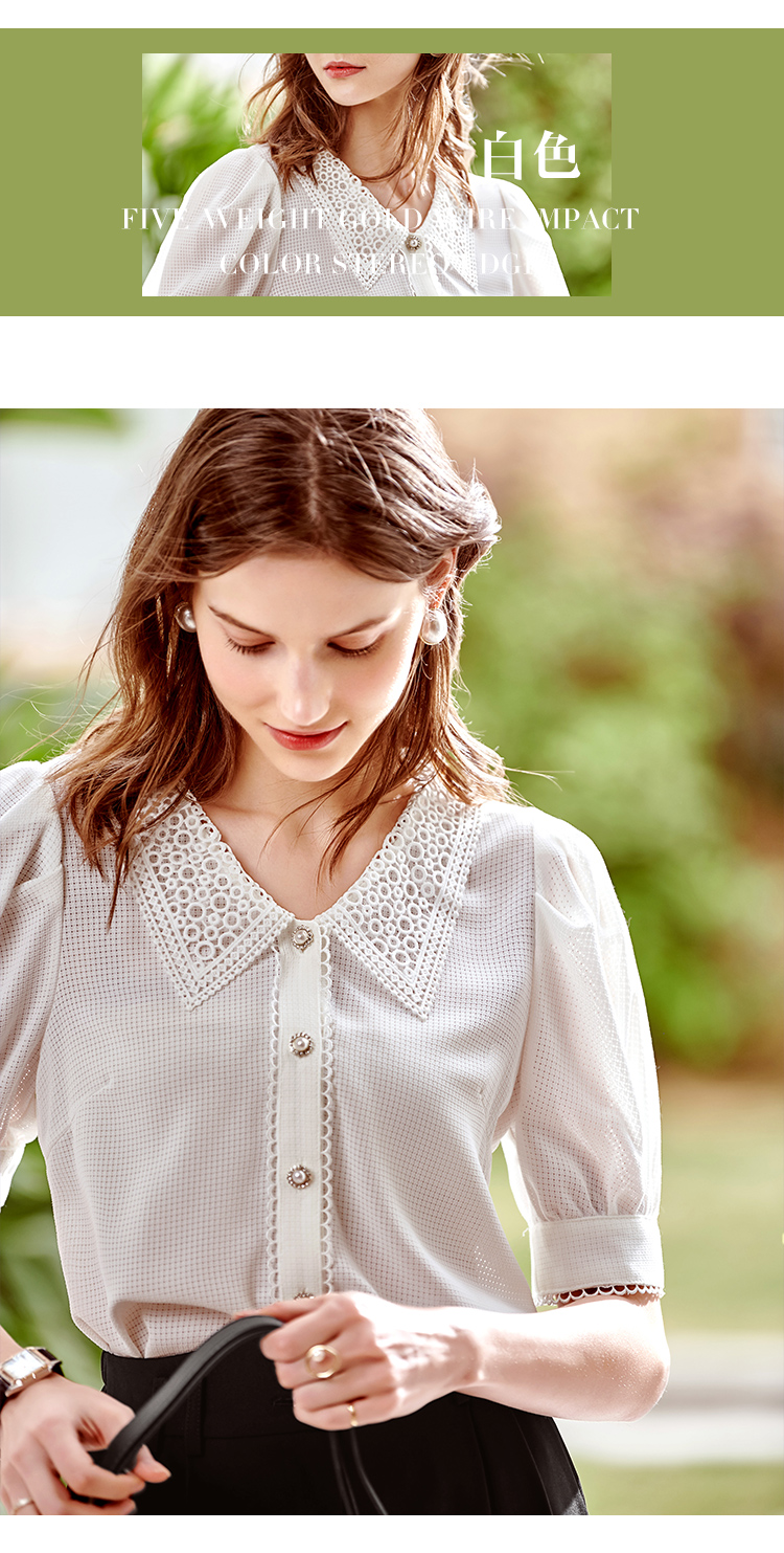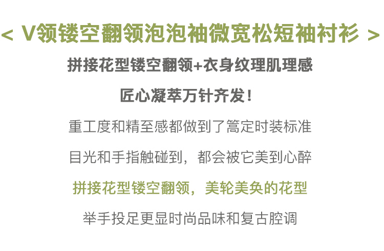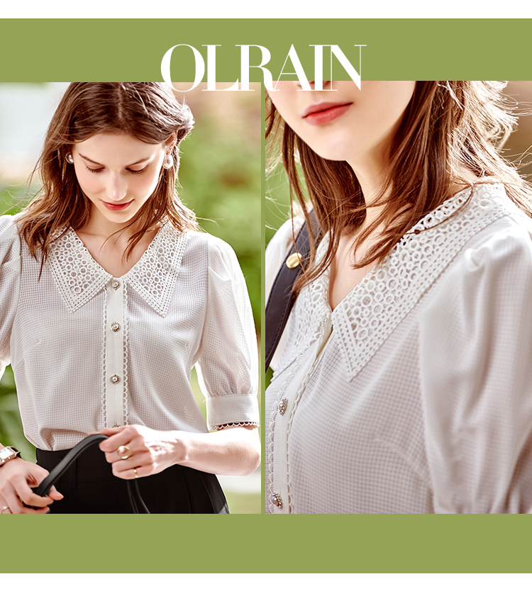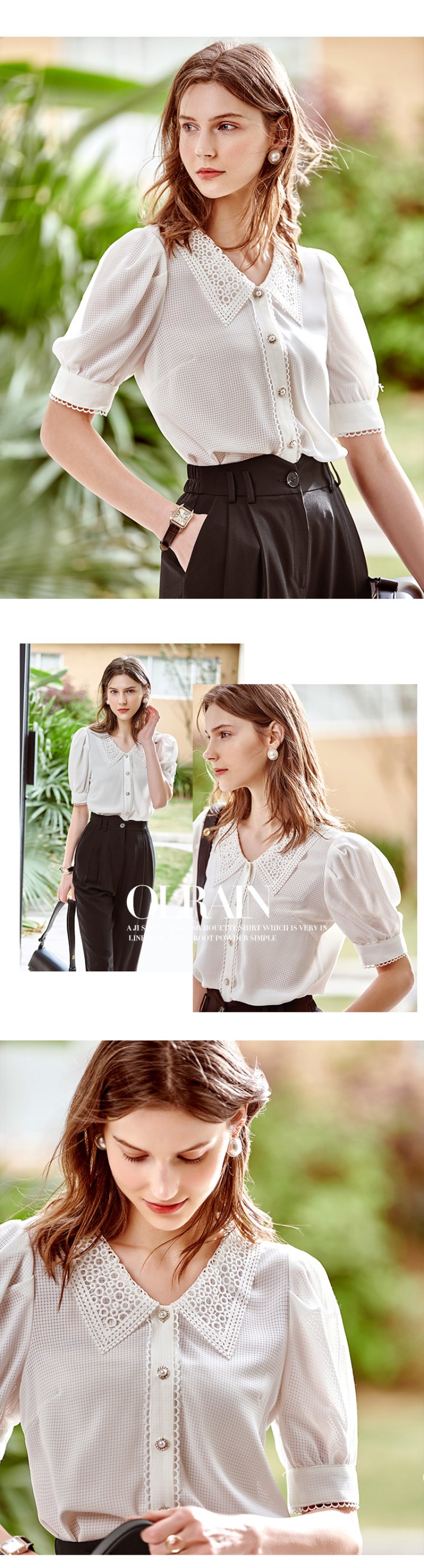 欧芮儿V领衬衫女2021春夏款泡泡袖重工镂空拼接气质时髦短袖衬衣
