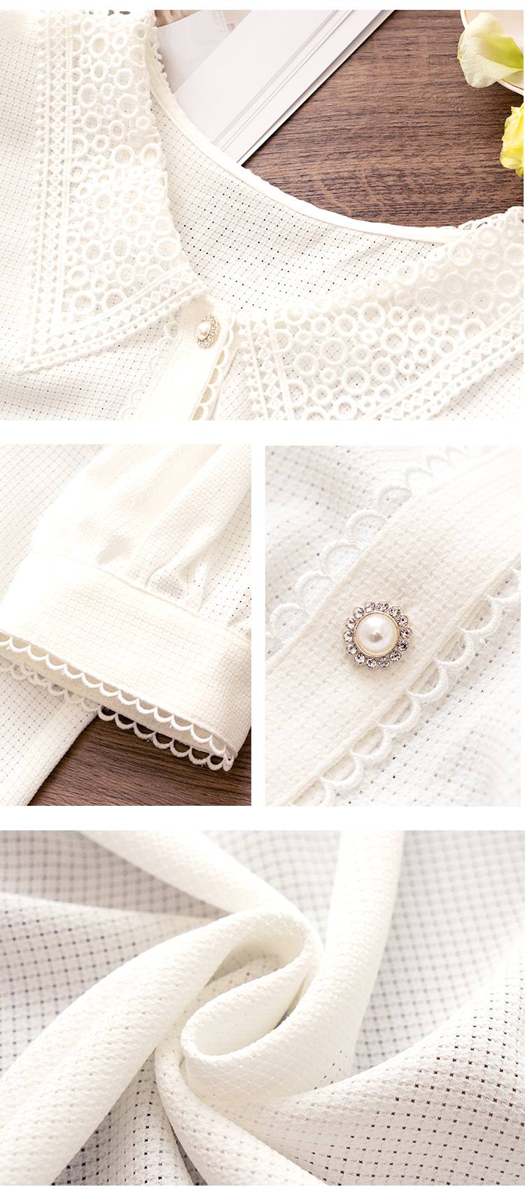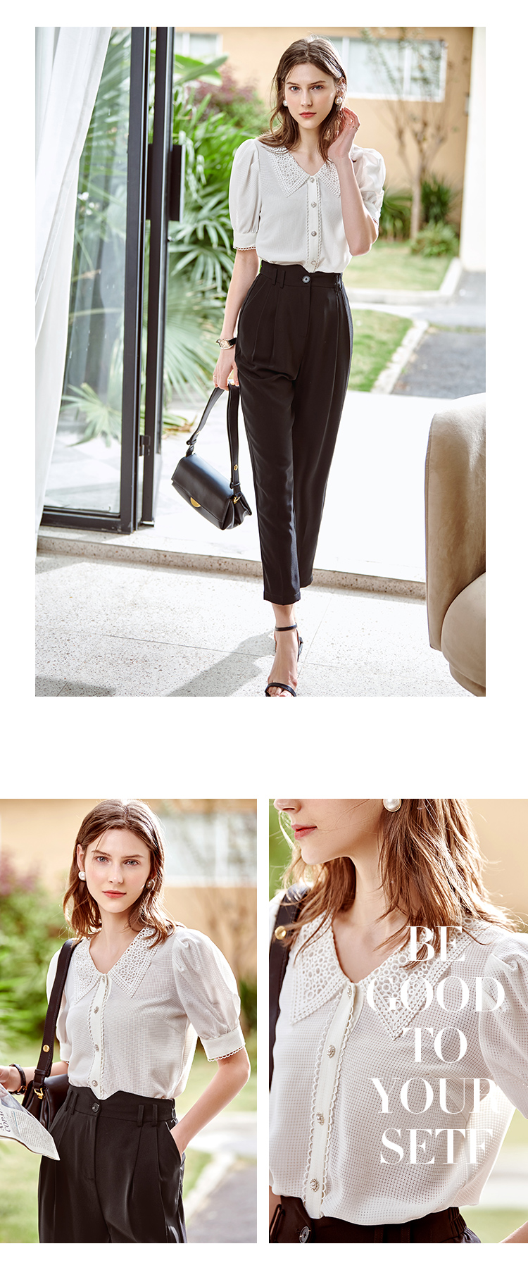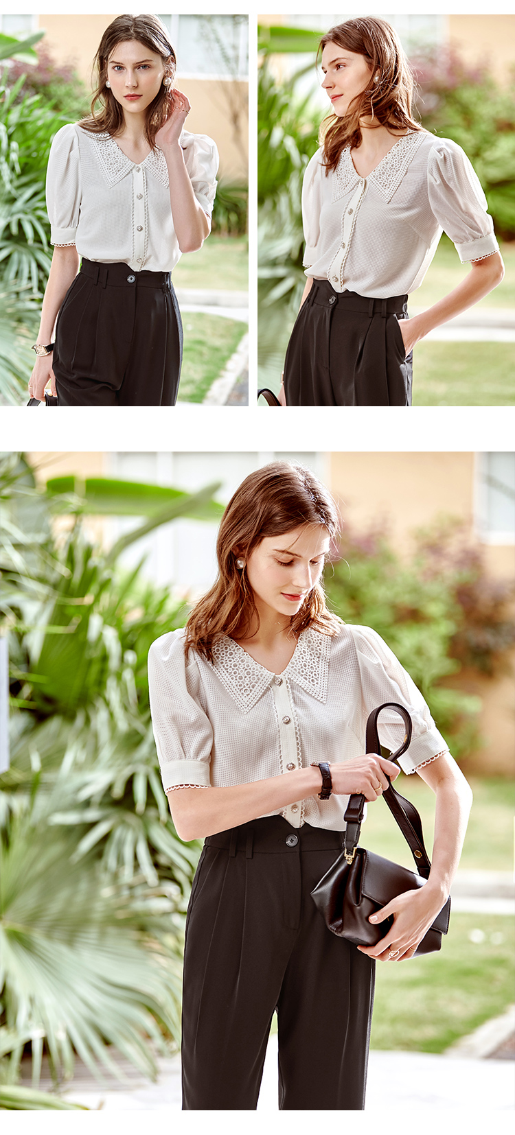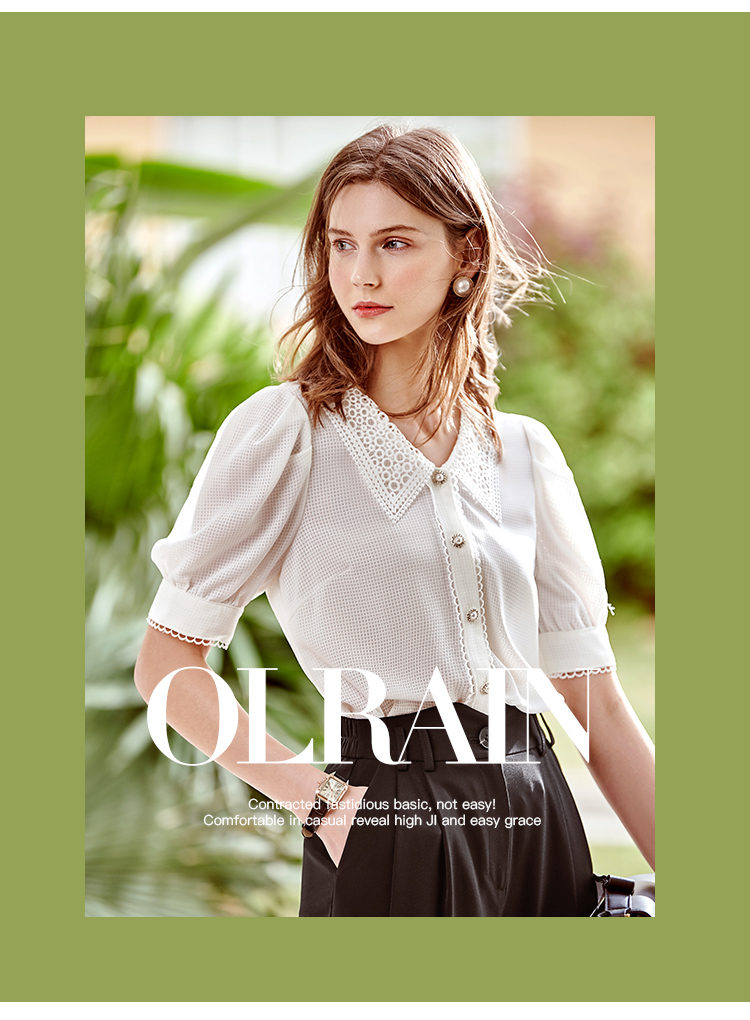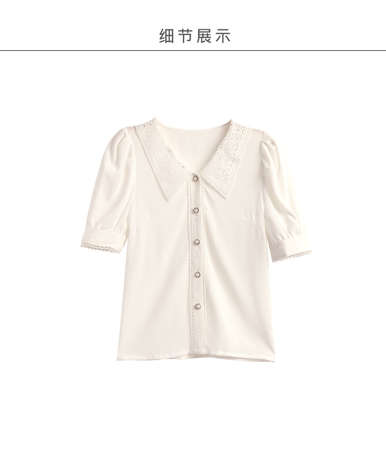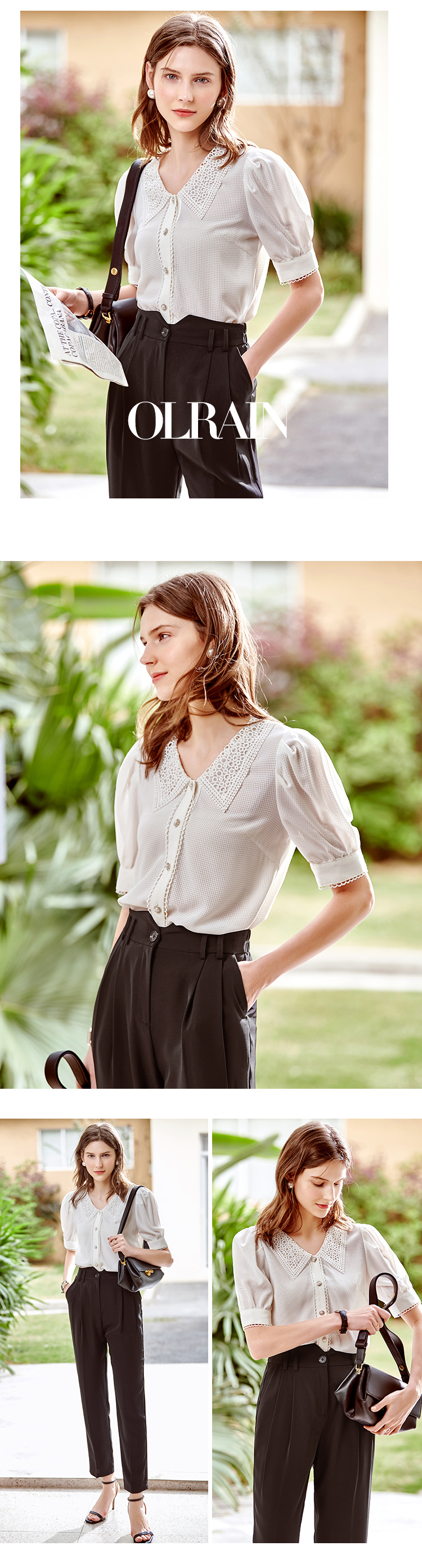 欧芮儿V领衬衫女2021春夏款泡泡袖重工镂空拼接气质时髦短袖衬衣