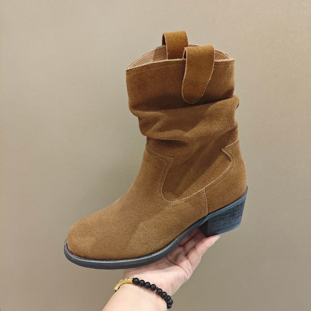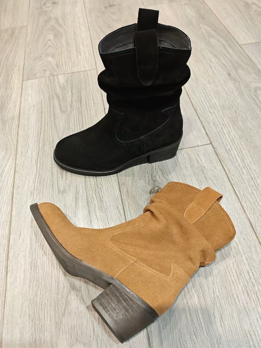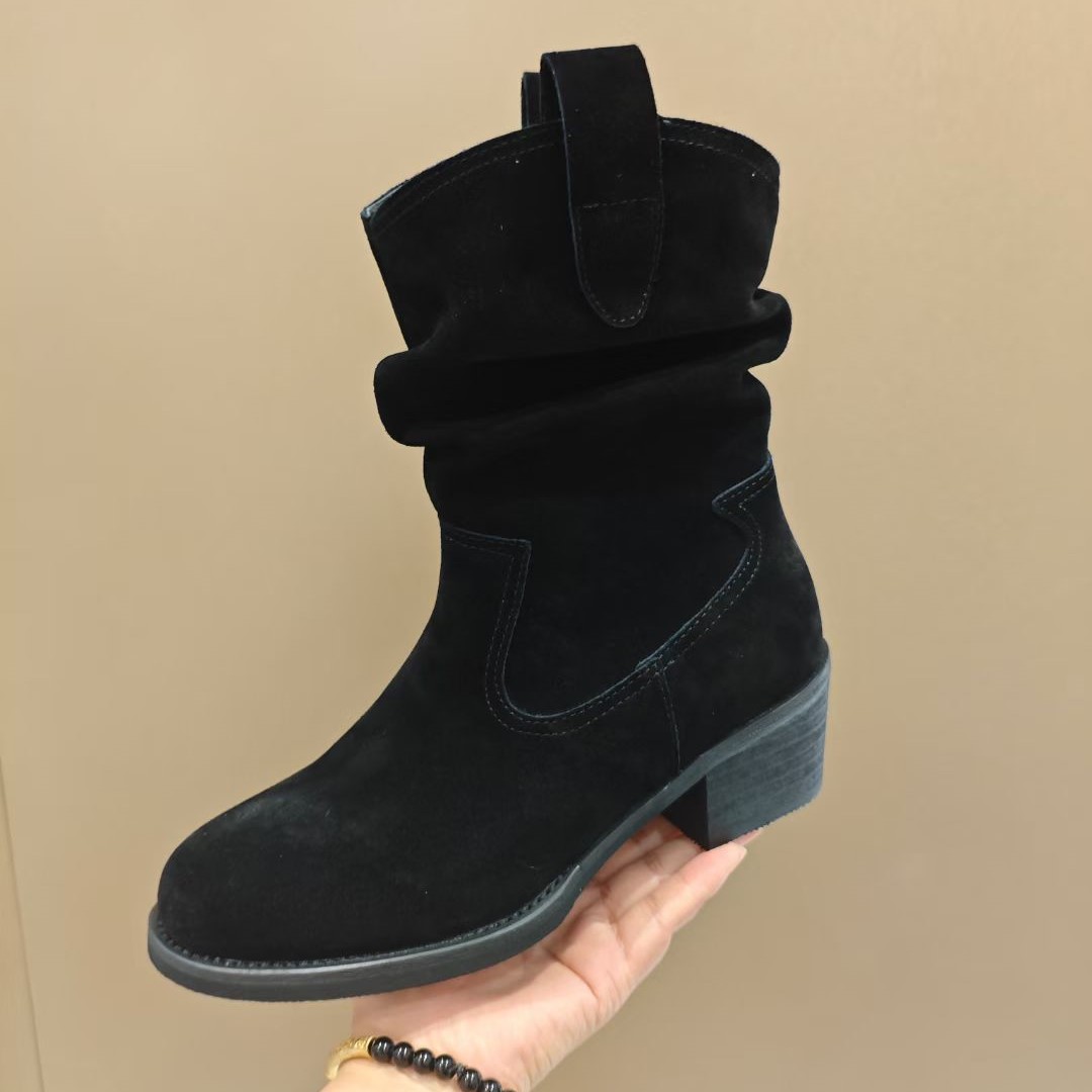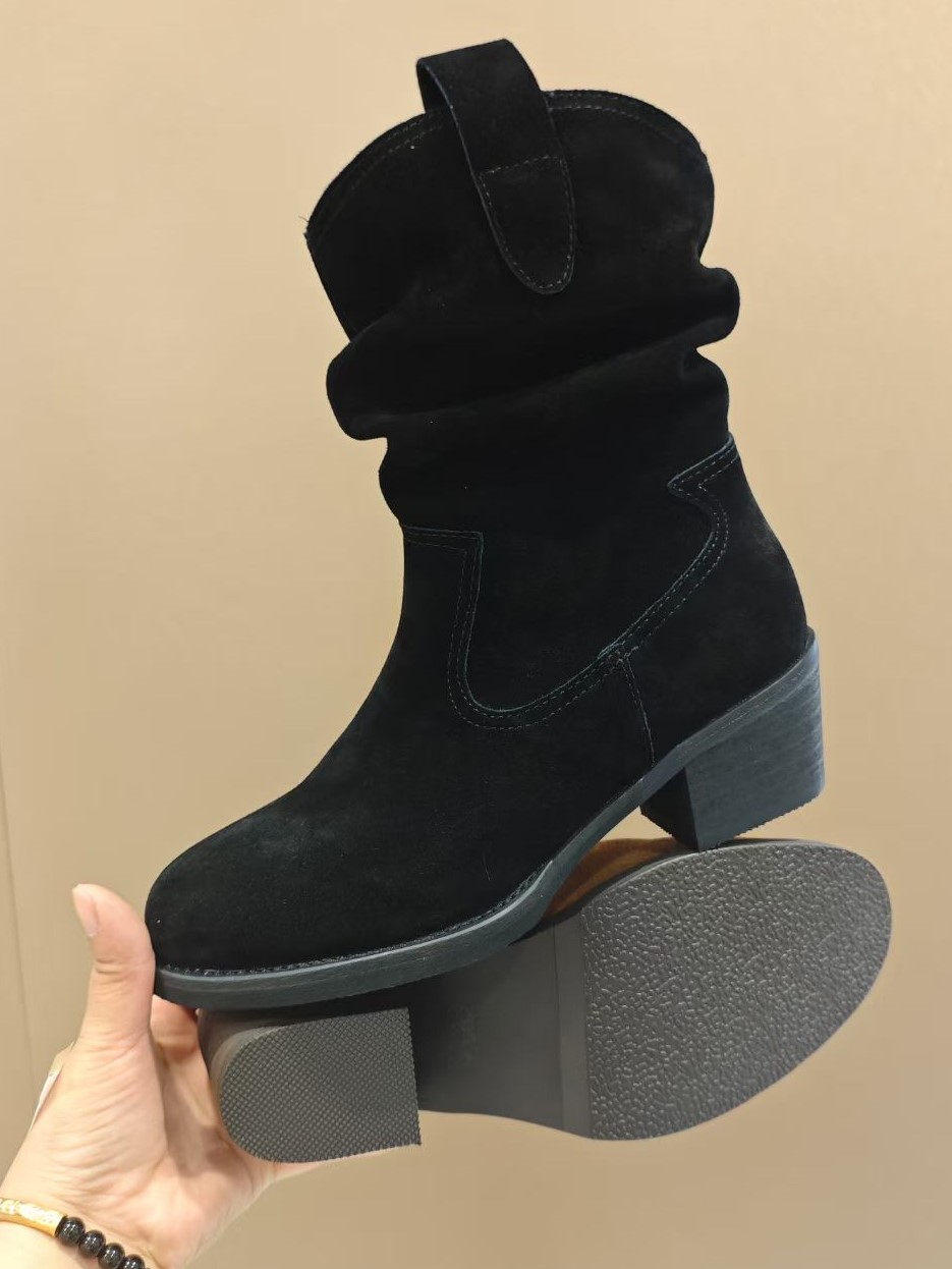 西村名物2025年冬季新款舒适中跟粗跟绒面弹力短靴时装靴U25DS49701