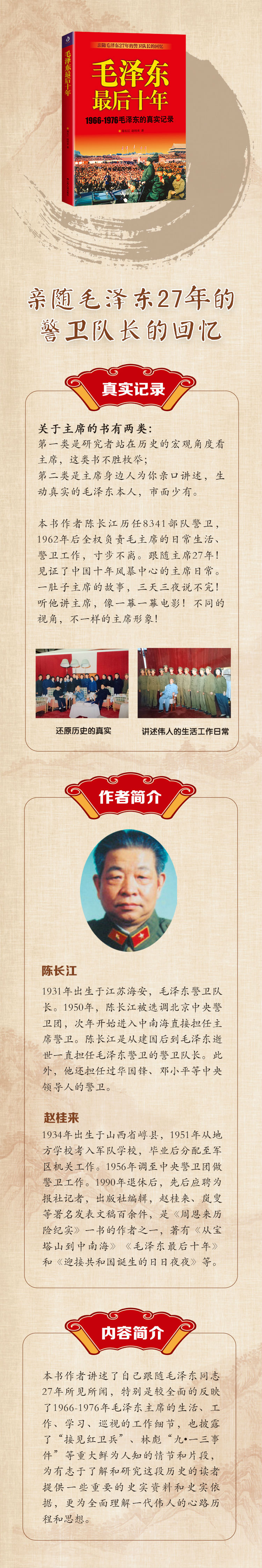 世纪伟人毛泽东生前并没有留下任何他自己亲笔写就的个人传记或回忆录,这对于许多渴望了解毛泽东的人来说,不无遗憾。毛泽东一生中的每一个时期,都充满了传奇,他的晚年亦不例外。如今很多描写毛泽东晚年事迹的书,往往是根据史料写就的,难免对毛泽东在生活上的点点滴滴无法真实记录,对有些历史事件背后的真实故事也无法阐述。通常,我们只有通过毛泽东身边的工作人员的回忆录,才能弥补这个遗憾。《毛泽东最后十年》就是这样的一本好书。 《毛泽东最后十年》一书是为纪念毛主席诞辰一百周年而写的,它完成于1993年夏,后因诸多因素未能出版。之后的几年里,作者对书稿所涉及的史实又进行了一些核实订正,在内容上做了一些补充,在一些章节上也有了适当的调整。到了1998年,适逢毛主席诞辰105周年之际,这本书终于有幸付梓,与读者见面。此书也是作者对毛泽东同志的缅怀与纪念。 书中所述,大部分是曾担任毛主席警卫队长的陈长江同志的亲身经历与所见所闻,其真实性自不待说。由于他独有的经历,使得本书不仅较好地反映了那段历史的某些片段,为有志于研究这段历史者提供了一些重要资料,而且也可以使广大读者从更多的方面去了解一个真实的毛泽东。 时光匆匆,转眼又到了毛泽东同志诞辰115周年了。自从这本书第一版出版后,得到了很多读者的喜爱。为了满足更多热爱毛泽东同志的读者的要求,同时也为了纪念毛泽东同志,特将此书再版。 此次修订再版,笔者订正了原书中的舛讹之处,并在原书的基础上,补充增加了一些内容,使内容更加充分,人物更加丰满。读者从中可以读到一个晚年时期真实的毛泽东,以及在毛泽东同志人生最后十年里,发生在他老人家身边的许多不为人知的真实故事。 2008年10月
