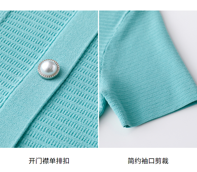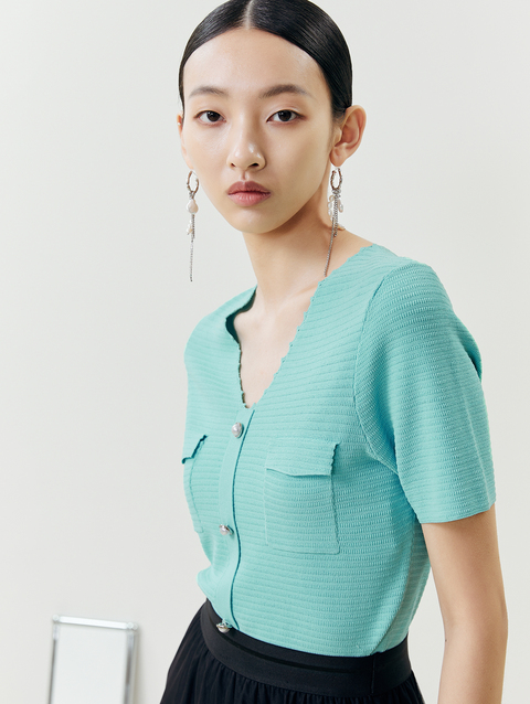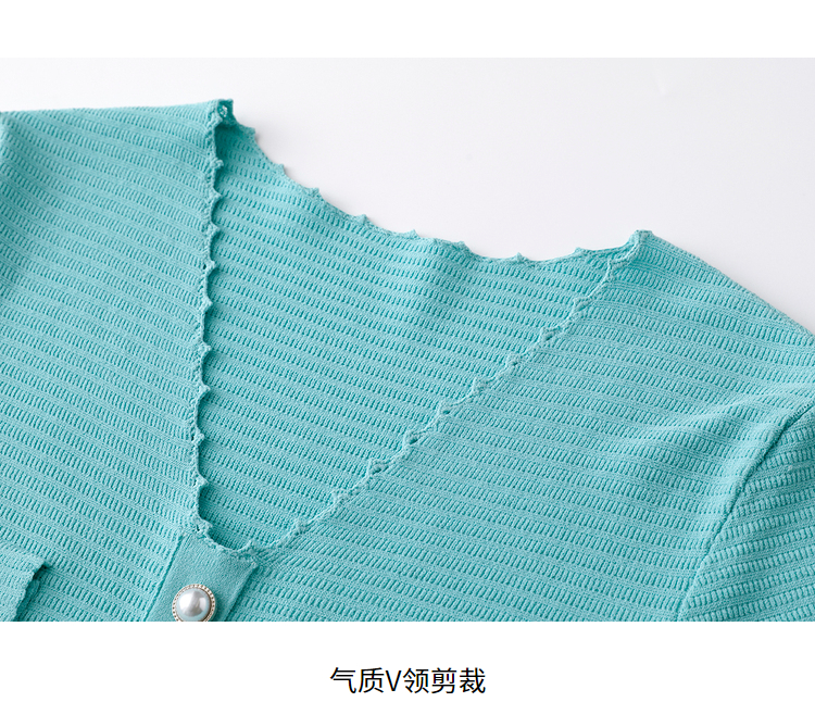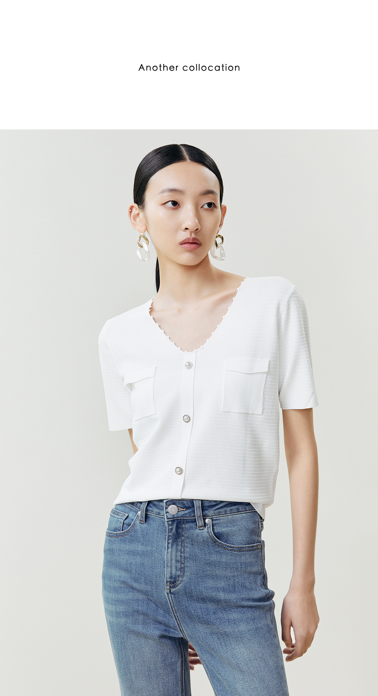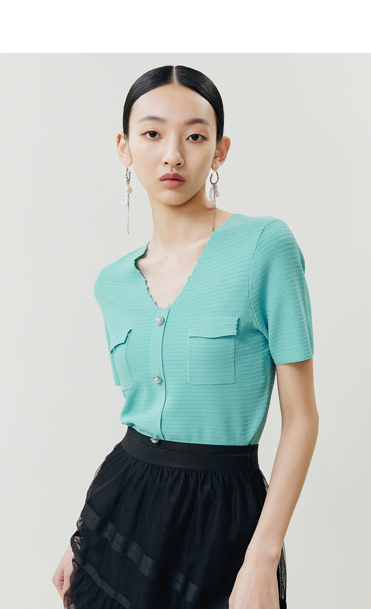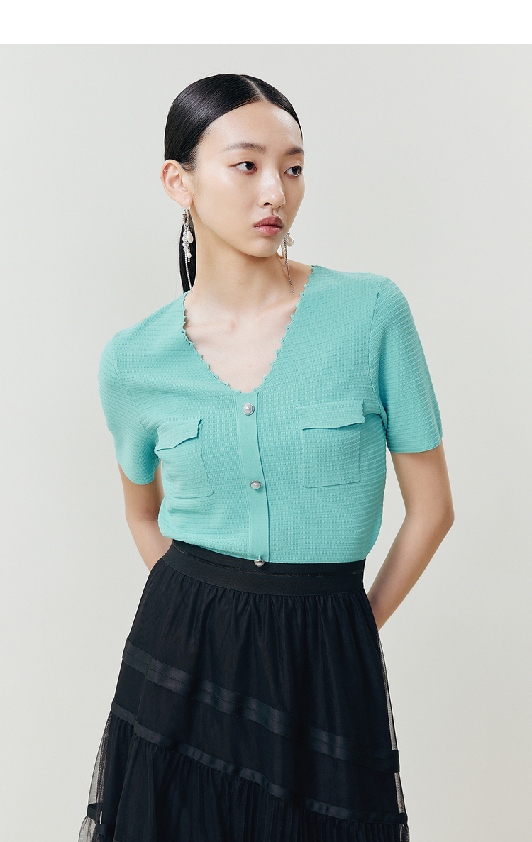 NEELLY纳俪商场同款气质波浪V领针织衫女珍珠扣修身上衣夏季新款N22041A01004
