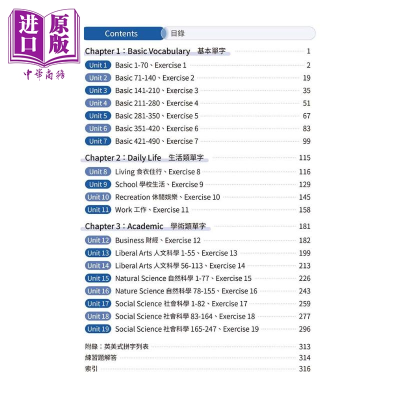 依雅思测验*常出现的 9 大主题分类,共 19 单元,整理出*重要的高频单字,主单加上补充字彙总数超过3,000字,重点精闢、字字珠玑。