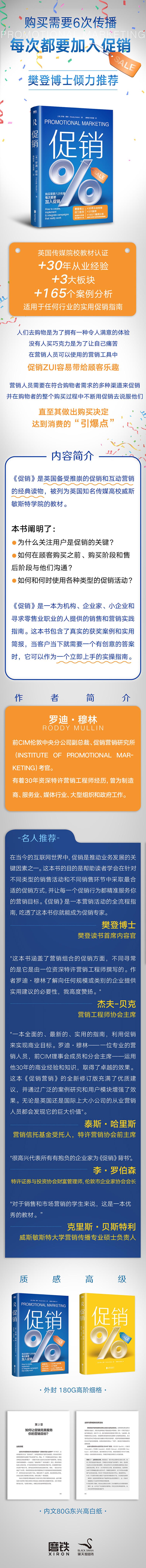 人们去购物是为了拥有一种令人满意的体验,没有人买巧克力是为了让自己痛苦,在营销人员可以使用的营销工具中,促销zui容易带给顾客乐趣。营销人员需要在符合购物者需求的多种渠道来促销,并在购物者的整个购买过程中不断用促销去说服他们,直至其做出购买决定,达到消费的“引爆点”。《促销》是英国备受推崇的促销和互动营销的经典读物,被列为英国知名传媒高校威斯敏斯特学院的教材。本书阐明了:1.为什么关注用户是促销的关键?2.如何在顾客购买之前、购买阶段和售后阶段与他们沟通?3.如何和何时使用各种类型的促销活动?《促销》是一本为机构、企业家、小企业和寻求零售业职业的人提供的销售和营销实践指南。这本书包含了真实的获奖案例和实用简报,当客户当下就需要一个有创意的答案时,它可以作为一个立即上手的实操指南。