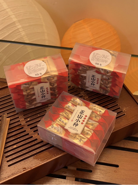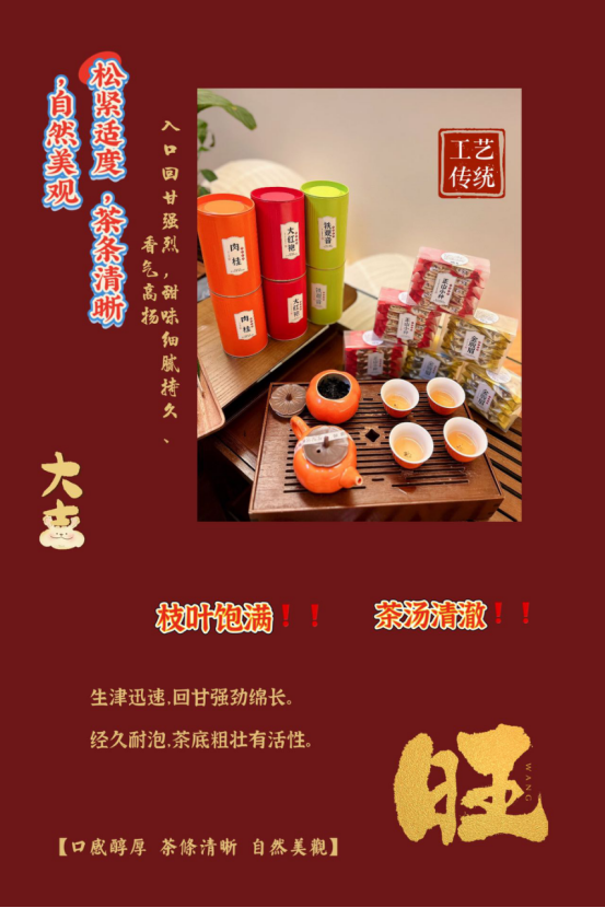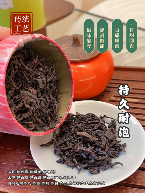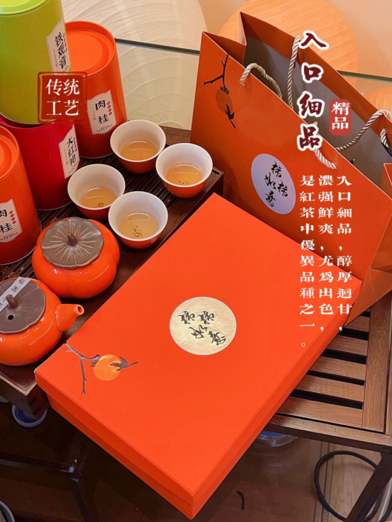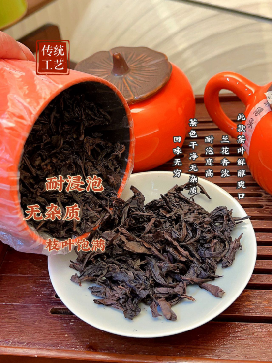 冲泡后汤色呈琥珀金骏眉色, 具淡而甜的蜜香,品之甘甜润滑。 品质最突出之处是 香气馥郁 含邮蜜香韵味 岩韵" 明显 香高而持久