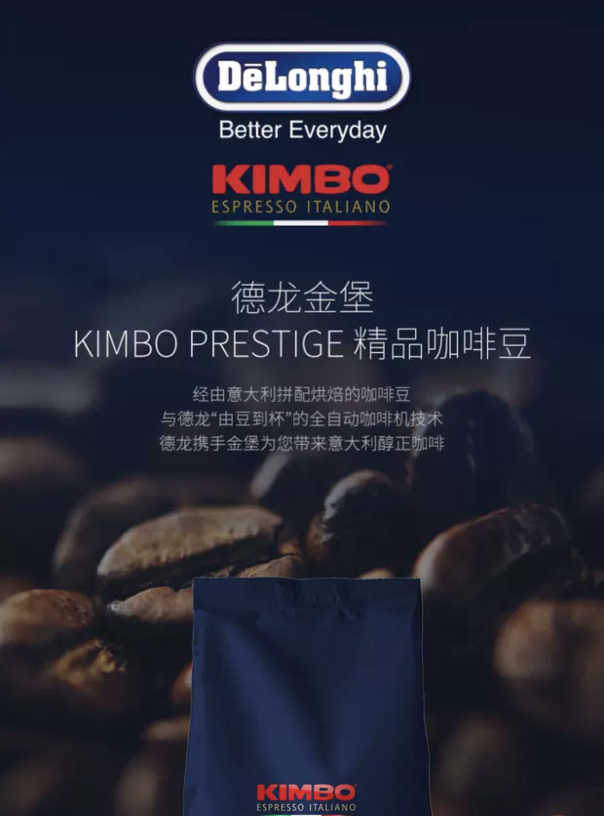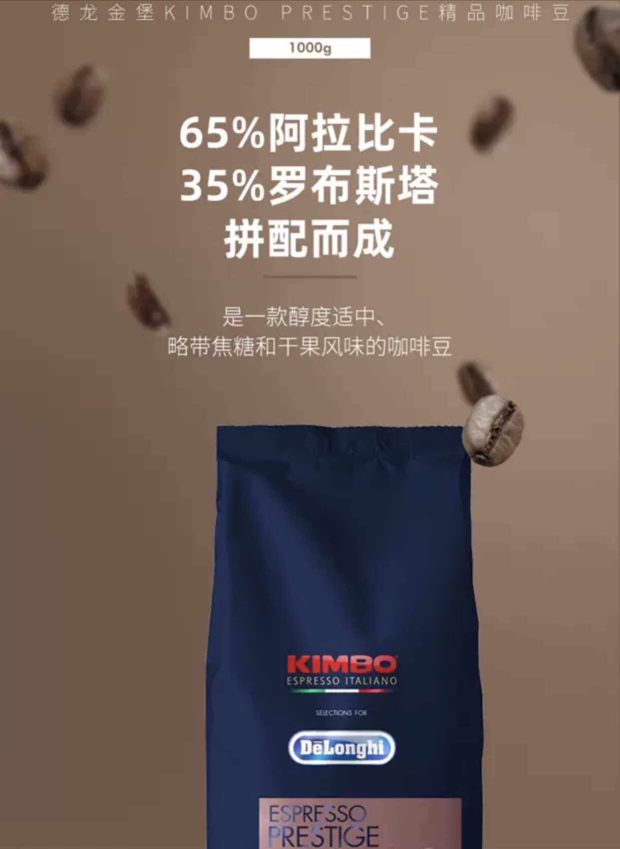 Delonghi/德龙 金堡KIMBO 精品进口咖啡豆中深度意式现磨1000g 精品咖啡豆 保质期27.3.