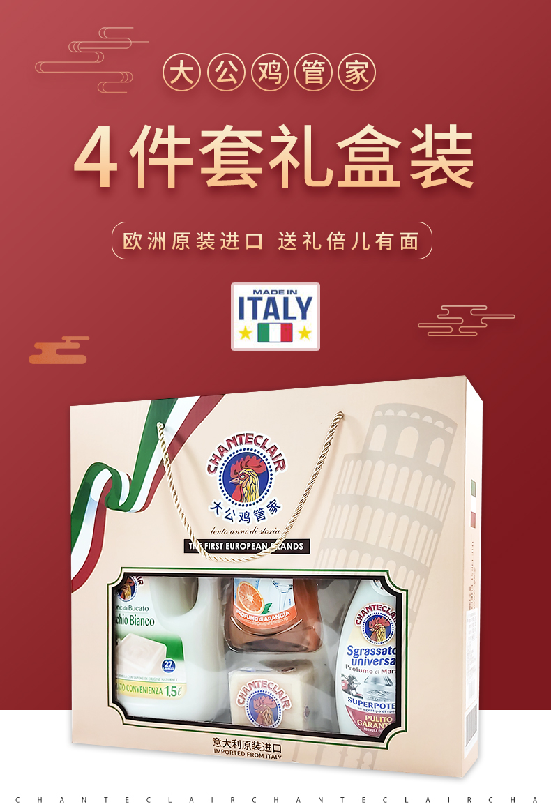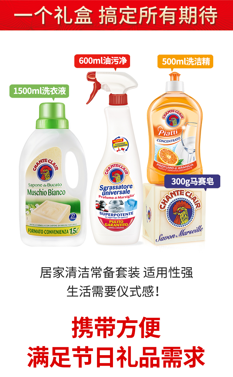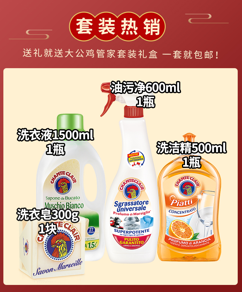 大公鸡管家四件套礼盒套装去油污清洁剂马赛皂洗洁精白苔香洗衣液