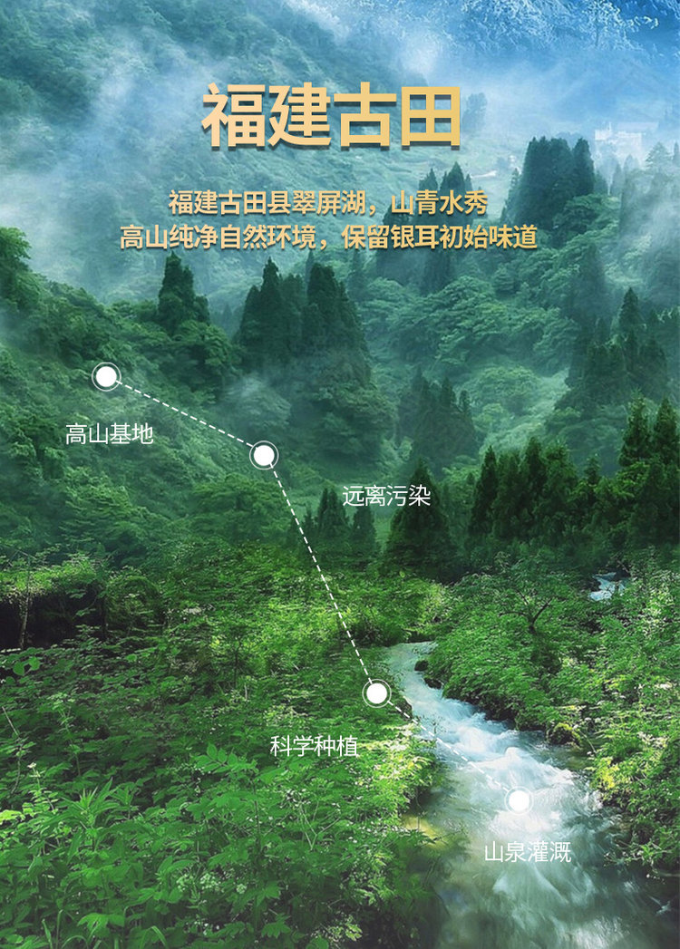 虫草花来自于古田县,而古田县作为“中国食用菌之都”,是我国食用菌主产区,具有得天独厚的农产品优势。古田县境内山峦起伏,蕴存着丰富的水能资源,冬短夏长,夏无酷暑,冬无严寒,气候温和,土地蕴含巨大的能量,是菌类生长的天堂