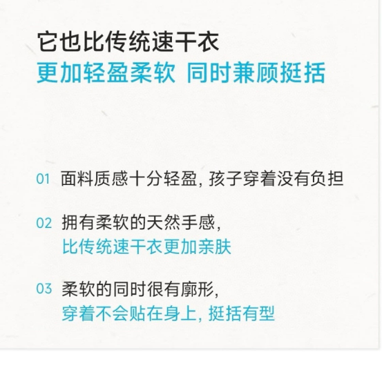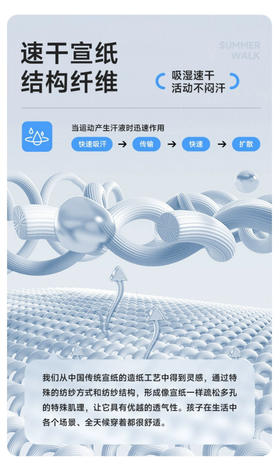 这款上衣的特别之处,就在于它的面料运用了独特的技术,模仿宣纸疏松多孔的特性,透气性竟然超过了国标180%! 这意味着孩子穿上它,无论是在户外奔跑玩耍,还是在室内活动,都能时刻保持清爽,不会被闷热和汗水困扰。 当孩子出汗时,面料就像宣纸晕染水墨一样,快速扩散水汽,让汗水迅速蒸发,始终保持体表干爽 ,给孩子最舒适的穿着体验。