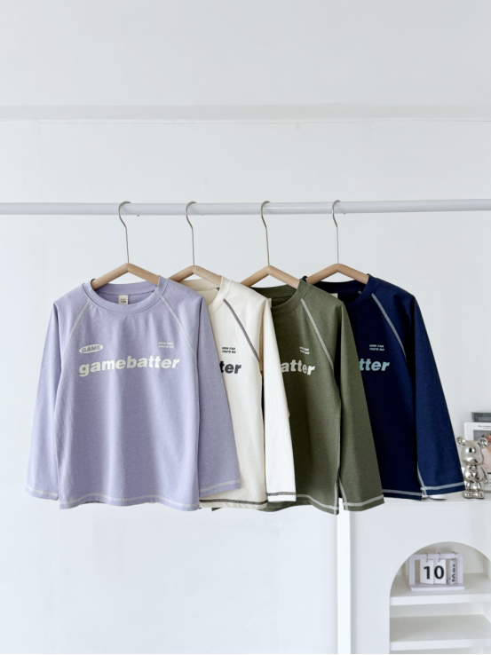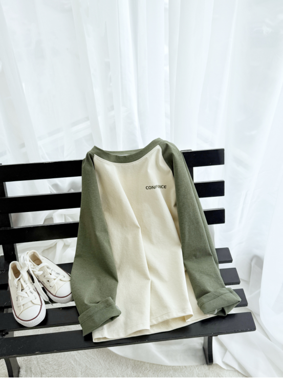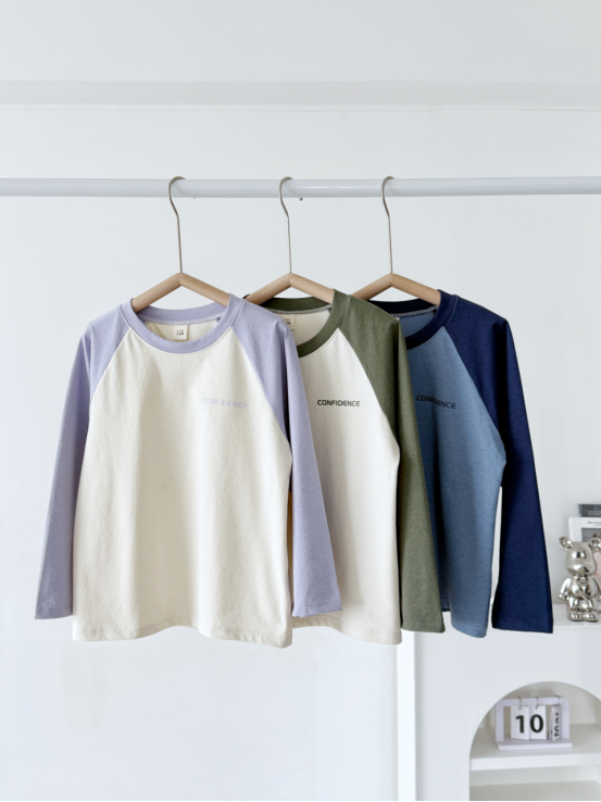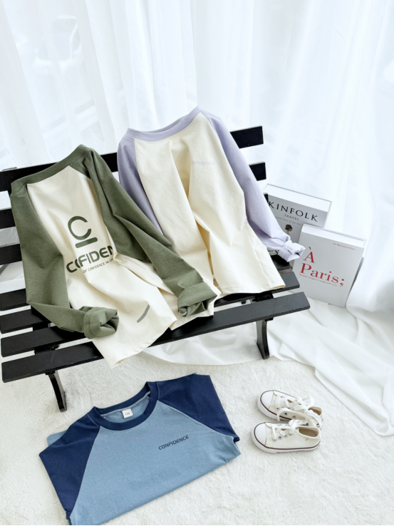 从款式设计上看,这款上衣简约又不失童趣 纯色的设计,搭配精致的小印花,清新自然又百搭~不管是搭配牛仔裤、运动裤还是小裙子,都能轻松拿捏时尚感 ① 撞色字母长T恤(深绿、紫色、藏青)