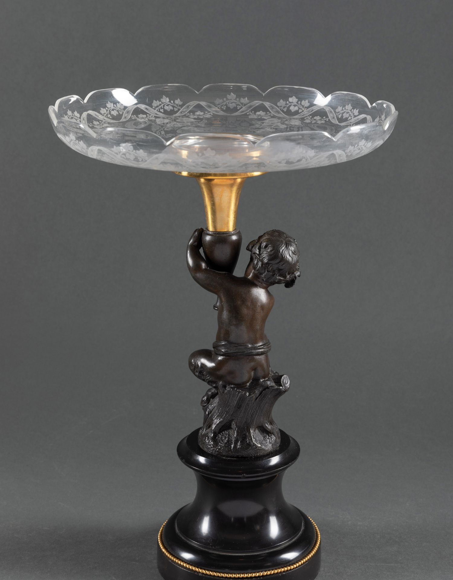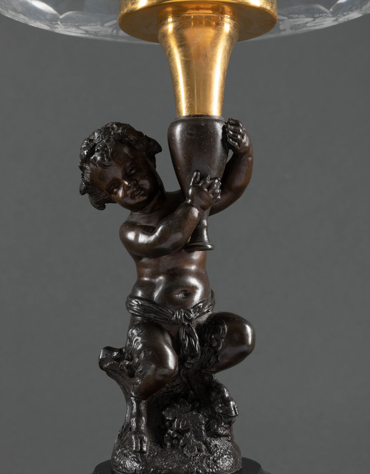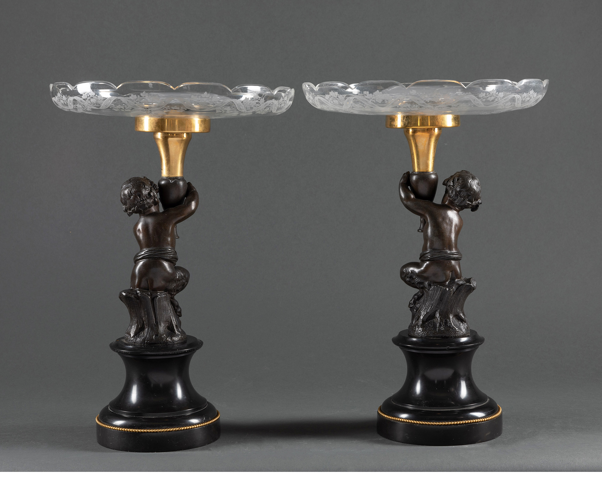 独角鹿西洋古董大理石底座小天使主题青铜雕像修饰水晶果盘一对