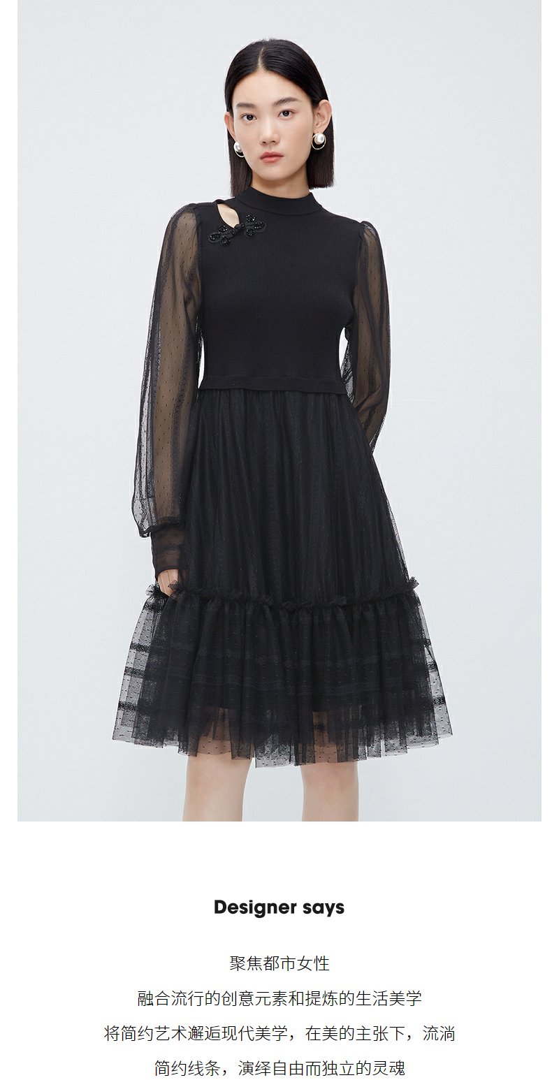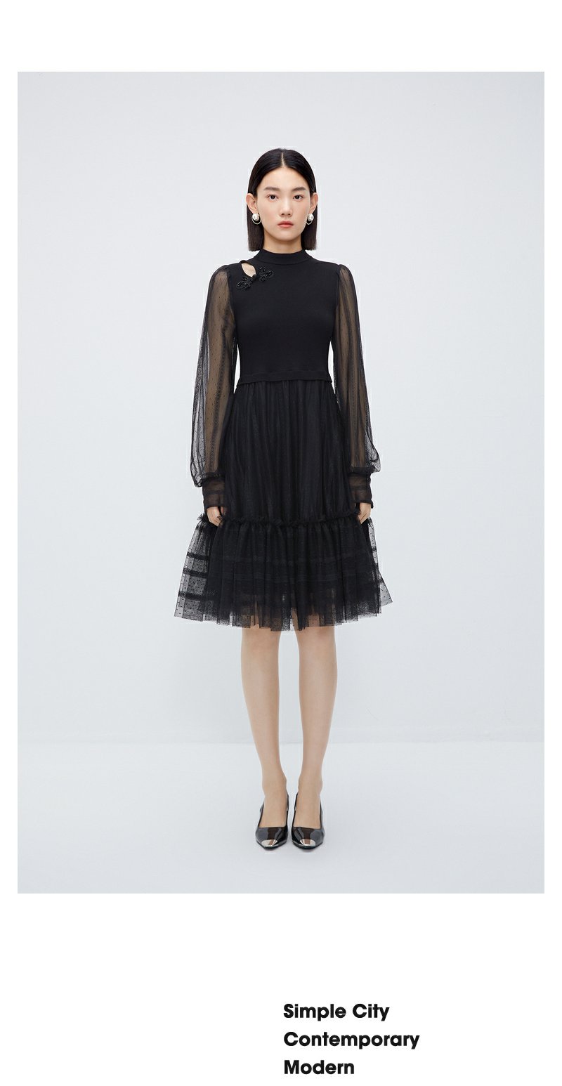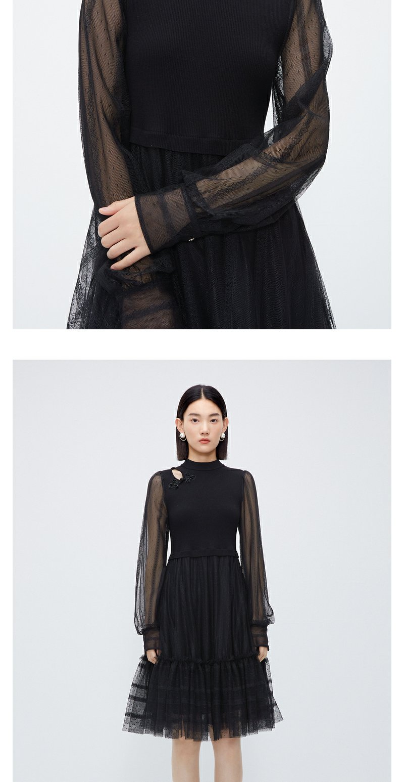 NEELLY纳俪商场同款新中式盘扣连衣裙女黑色中长款针织网纱拼接裙N24104Y04560