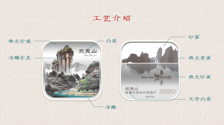 武夷山银章由上海新世纪纪念币制造有限公司铸造,采用999纯银精工铸造,浮雕彩色工艺相辅相成,并采用先进的激光影像工艺,使银章精致典雅,美不胜收。