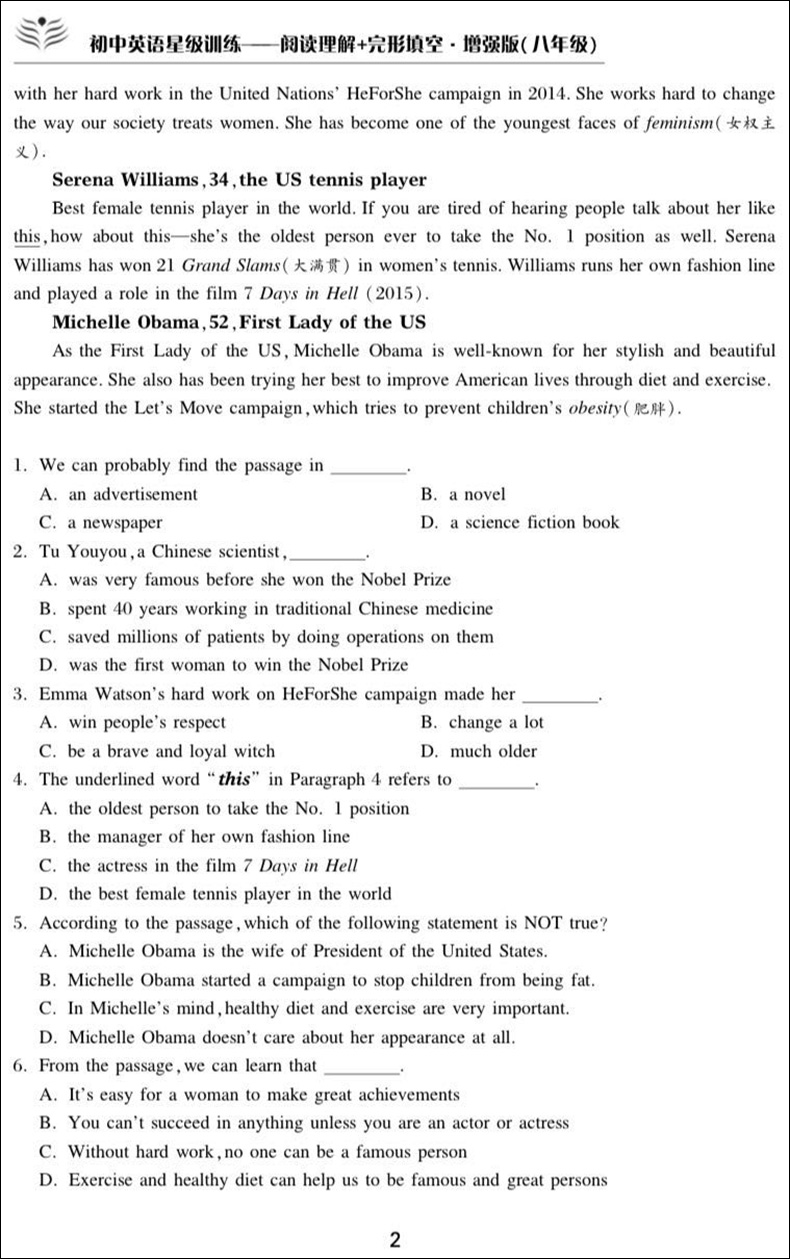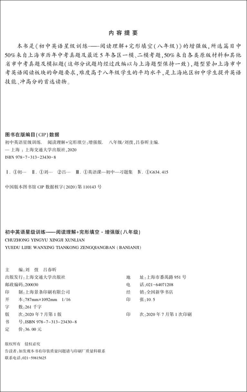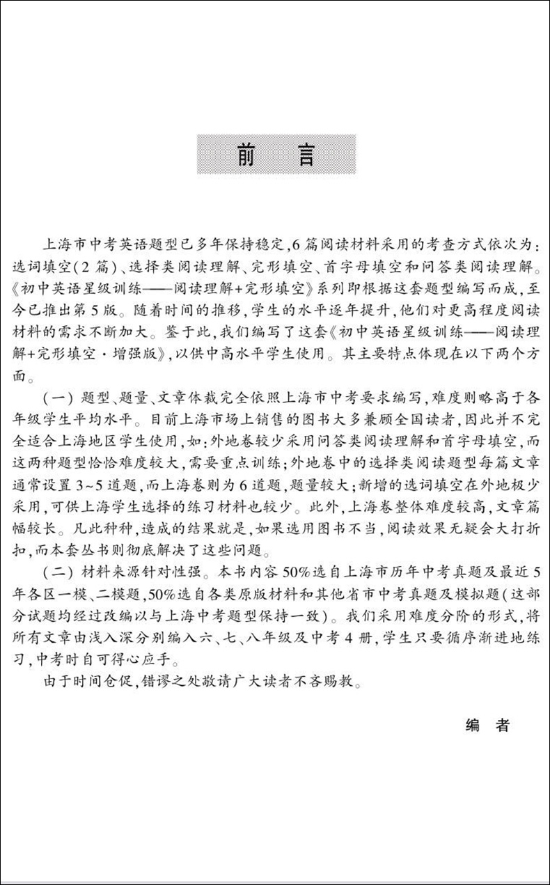 新版 初初中英语星级训练 阅读理解+完形填空 增强版 八年级 各区一模、二模考题 8年级标准化训练 上海交通大学出版社