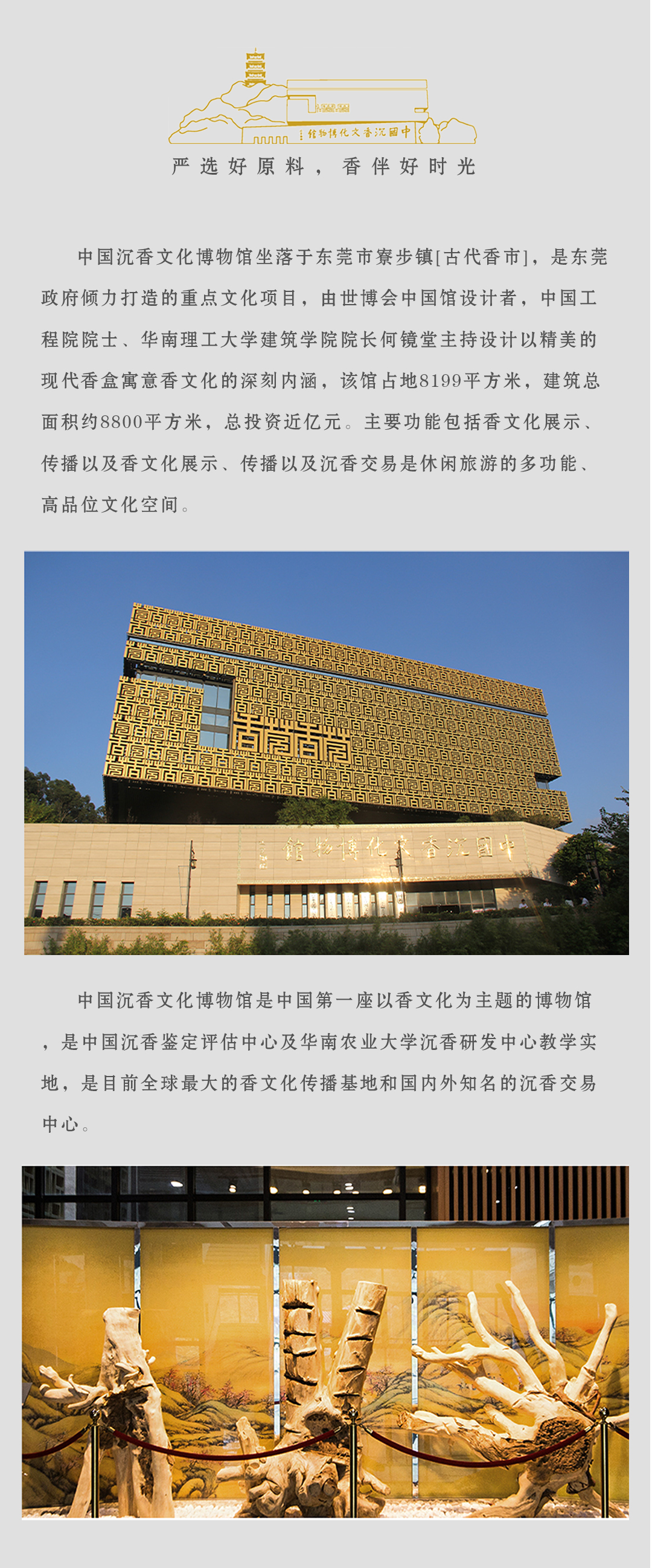 中国沉香文化博物馆坐落于古代[香市]东莞市寮步镇,是东莞政府倾力打造的重点文化项目,由世博会中国馆设计者,中国工程院院士、华南理工大学建筑学院院长何镜堂主持设计,以精美的现代[香盒]寓意香文化的深刻内