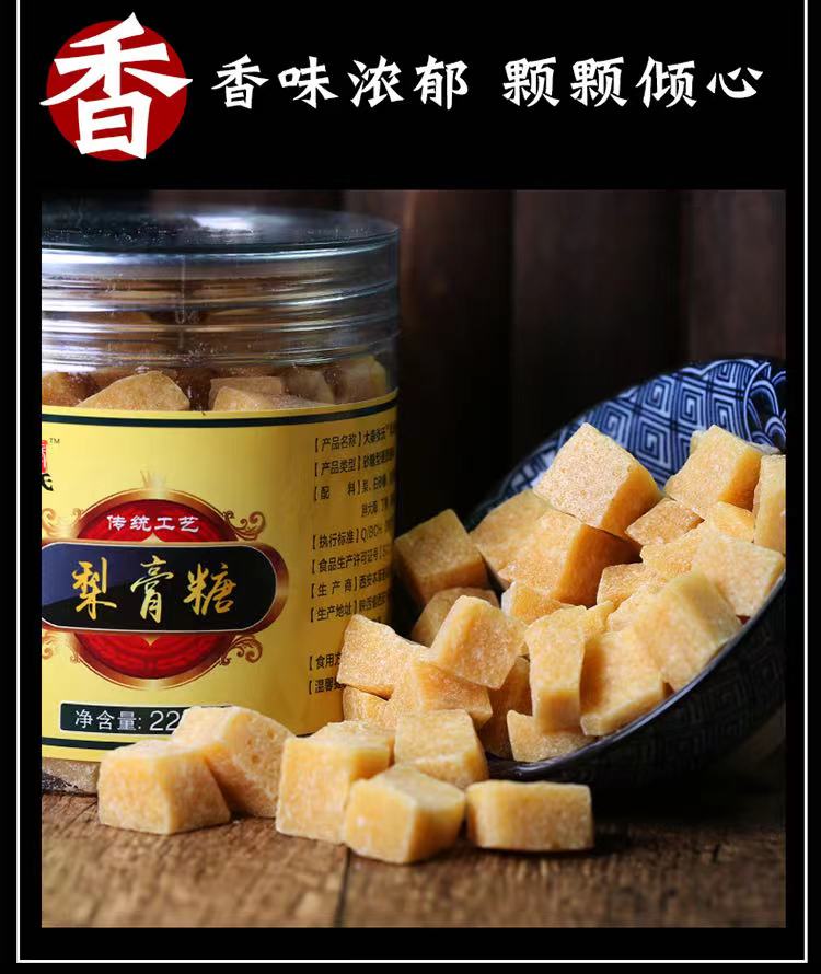 本产品发货时效:48-72小时左右(雨雪天等特殊情况顺延)。温馨提示:孕妇、哺乳期、糖尿病、胃寒者不建议食用,梨膏糖在温度高的情况下会有细小的毛毛状,请勿担心放心食用,这是梨膏糖成分薄荷的结晶体。