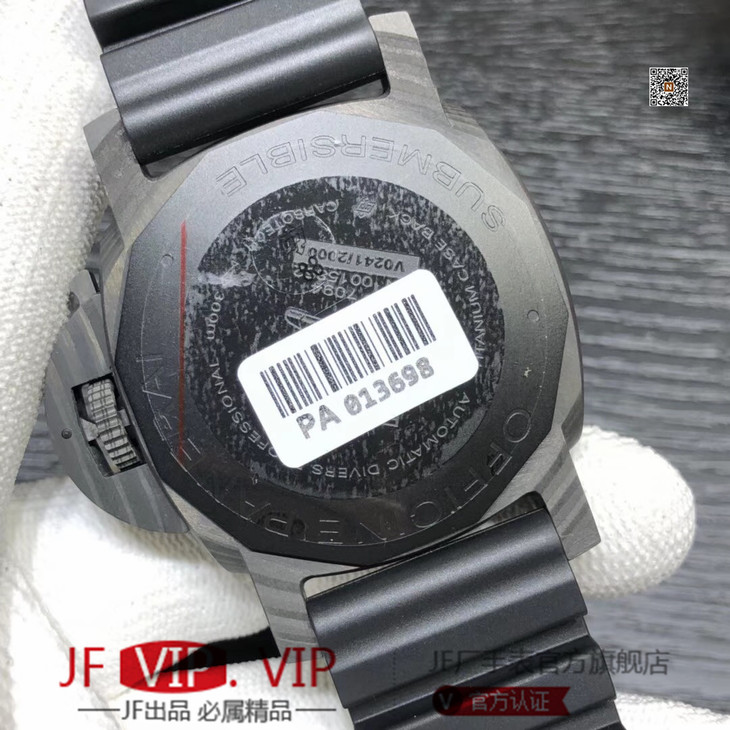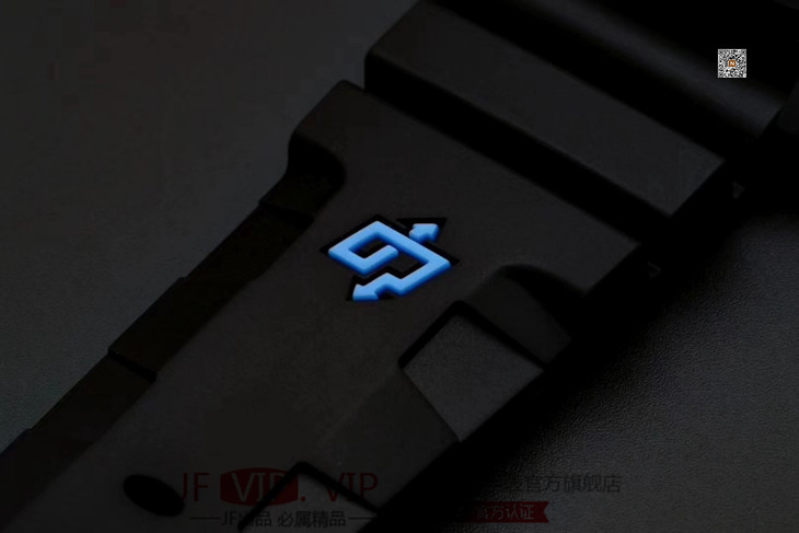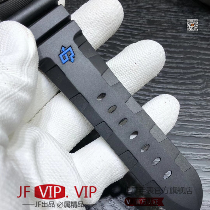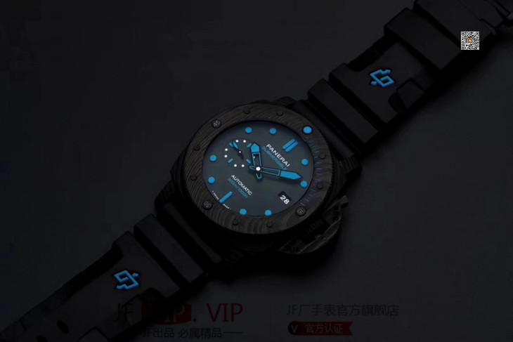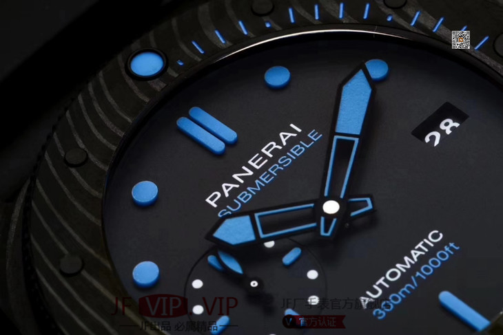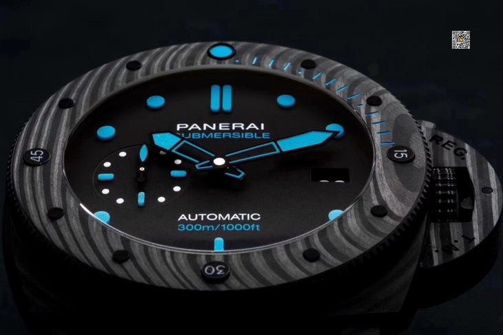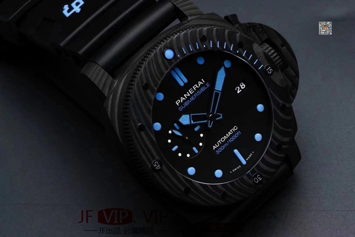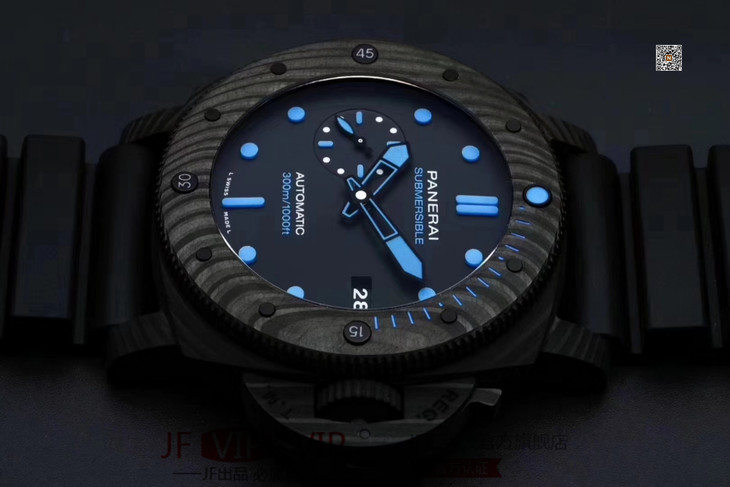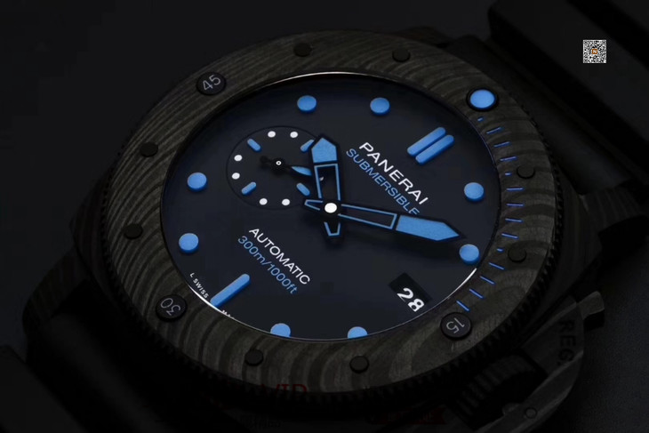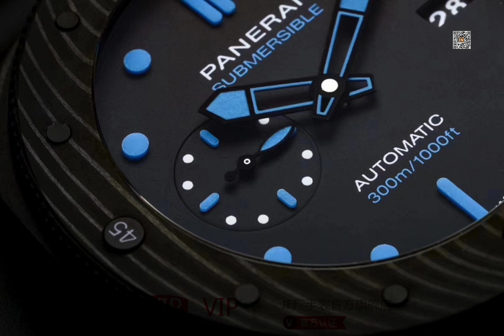 VS沛纳海SUBMERSIBLE系列自动机械潜水腕表 PAM01616 PAM1616 VS1616 1616 CARBOTECH碳纤维表壳 潜水倒计时表圈 表圈上有蓝色刻度线 蓝宝石镜面 保险护桥表冠 雕刻潜水艇图案钛合金PVD黑底盖 黑色表盘 蓝色表针和时标 超强双色夜光 分针和表圈夜光点蓝色夜光用于潜水氧气倒计时 P.9010机芯 时针快调 可逆调日历 潜水伸缩橡胶表带 钛合金PVD黑针扣 直径47mm VS厂出品