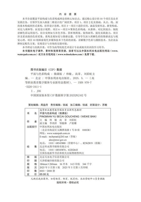 "本书全面覆盖平面构成与色彩构成理论的核心知识点,通过精心设计的10个项目及众多实践任务,引领学生深入探索二维设计的广阔世界。项目1、2扎实基础,从点、线、面的基本构成到形式重构,培养设计思维。项目3~5进阶应用,涵盖发射形态、渐变构成、对比与调和等,拓宽设计视野。项目6~9聚焦色彩构成,从推移、对比到混合,细致讲解色彩运用技巧,结合实例如互补色书鉴、茶杯垫图案、装饰画等,强化实践能力,项目涉及更高级的色彩采集、重构及视知觉与情感议题,引导学生深入理解色彩的情感表达与视觉心理。项目10则探索现代多媒体技术下的色彩表现,讲解数字色彩与摄影技术,为企业品牌制定配色方案,实现设计与市场的无缝对接。