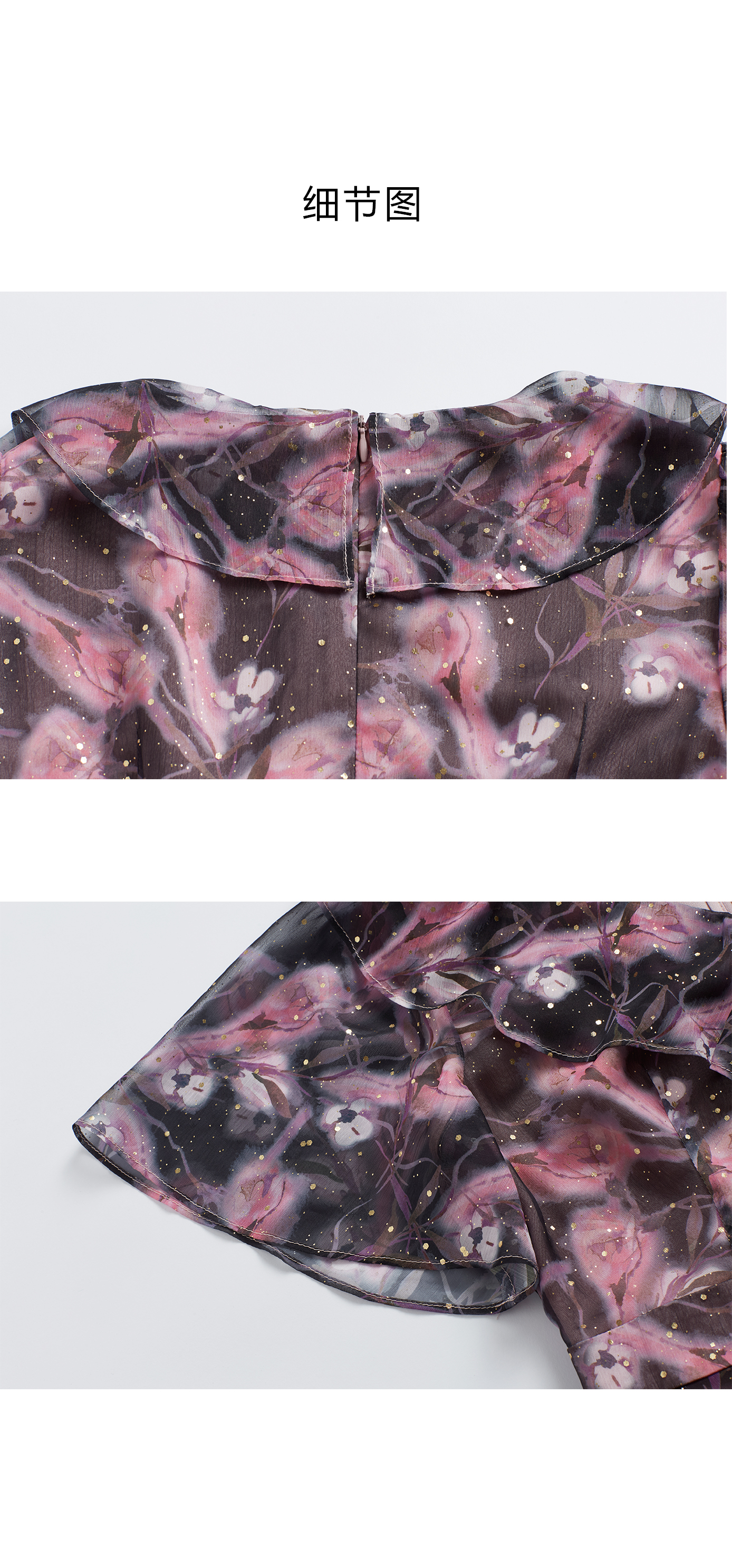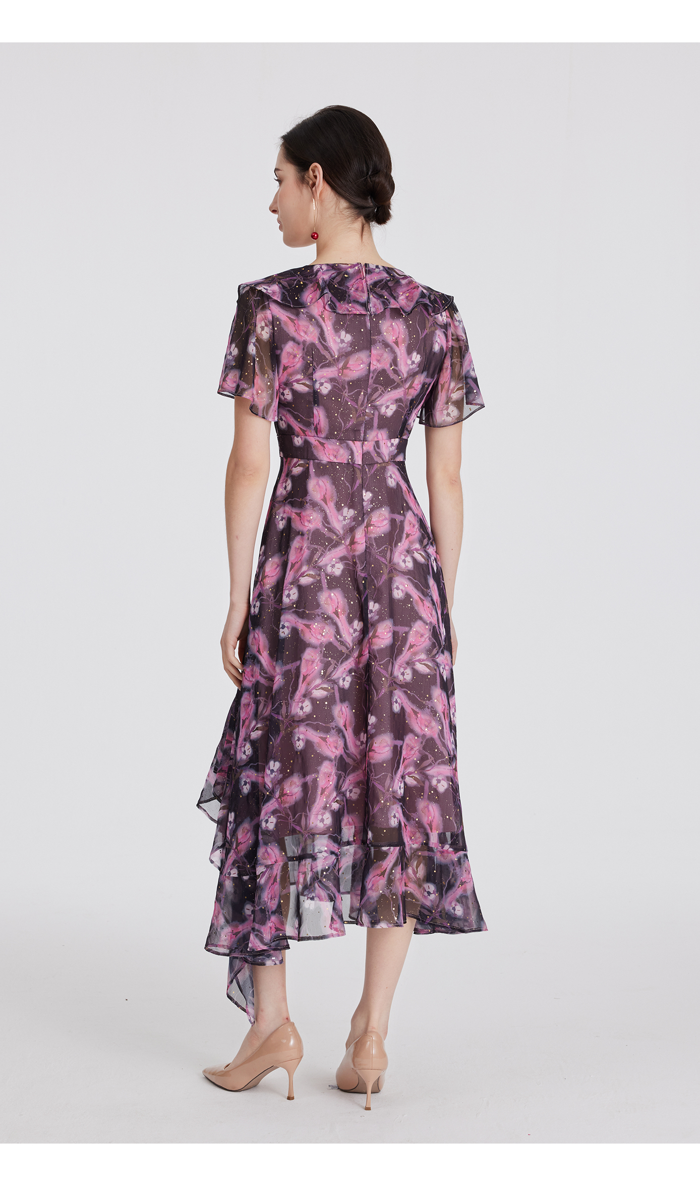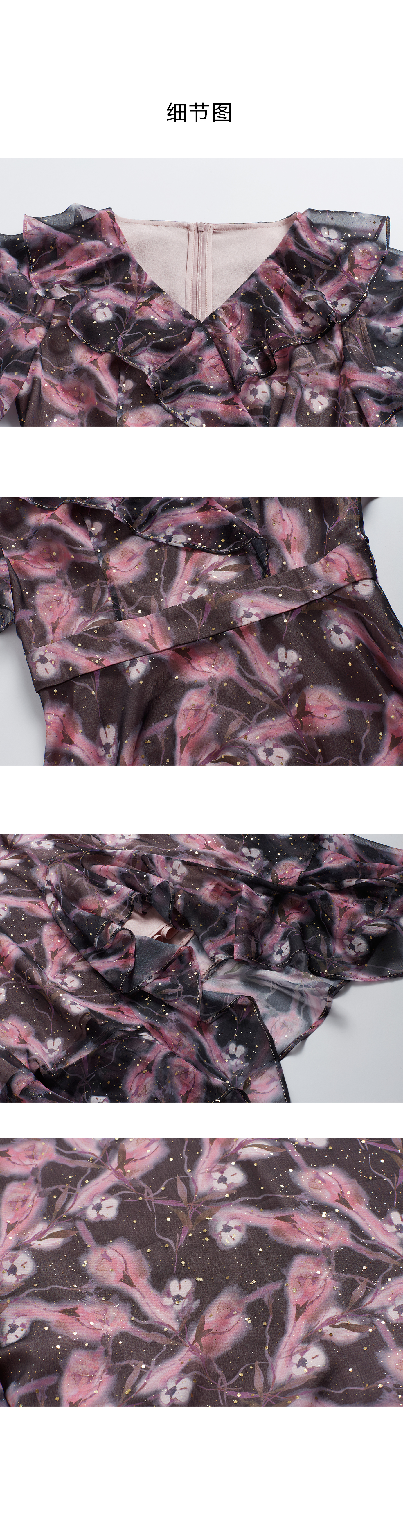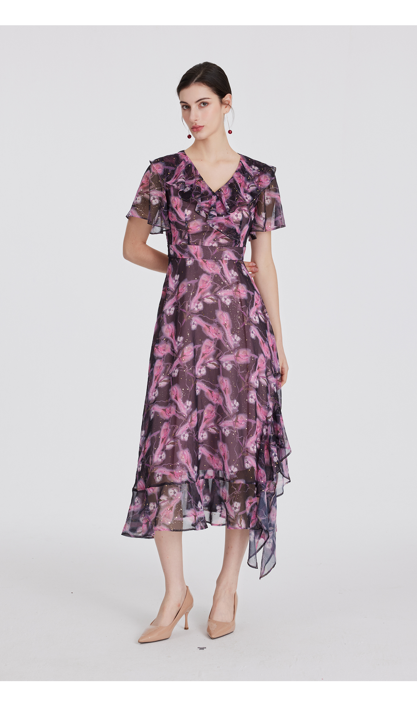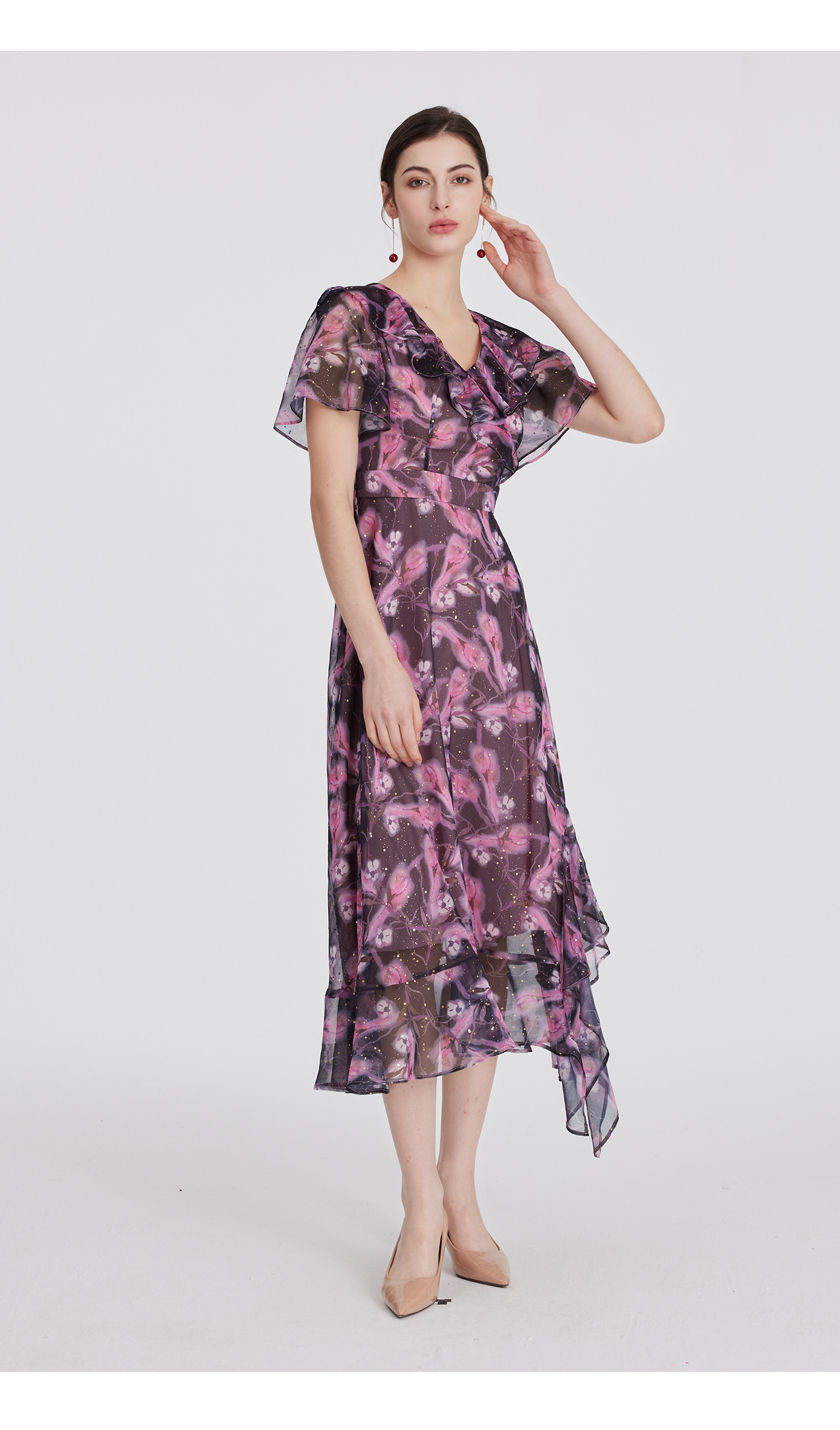 司歌雪纺v领短袖不规则连衣裙A891081X