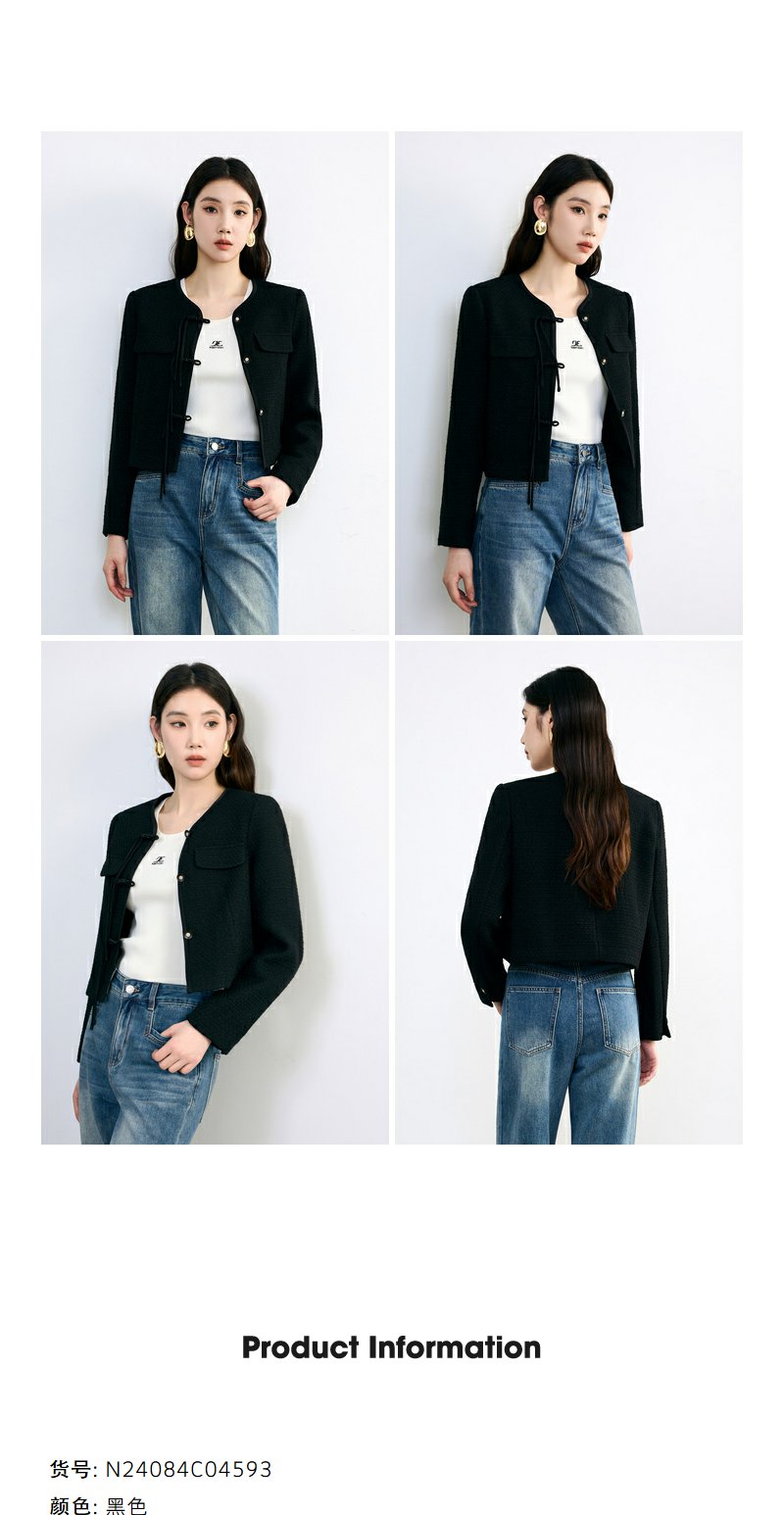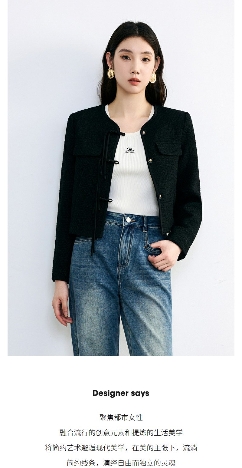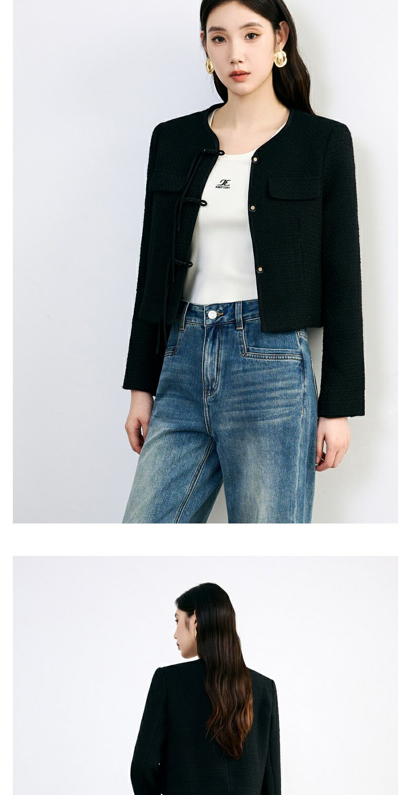 NEELLY纳俪2024秋商场同款新中式盘扣黑色短外套羊毛混纺女新款N24084C04593