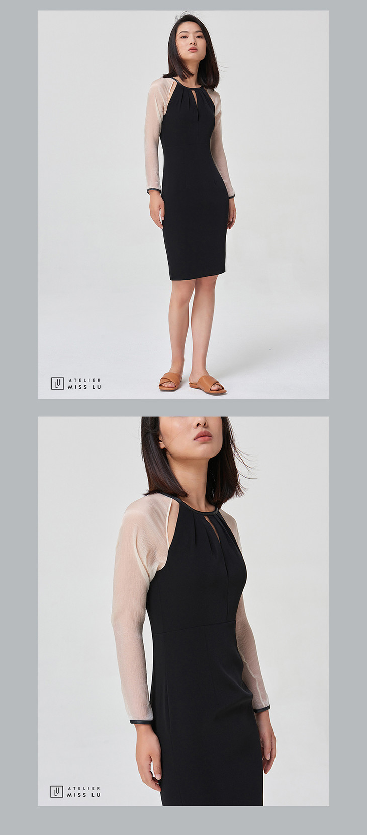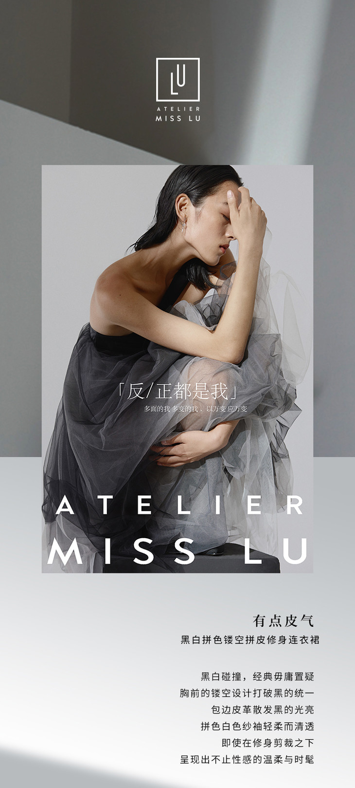 【有点皮气】黑白拼色镂空拼皮修身连衣裙