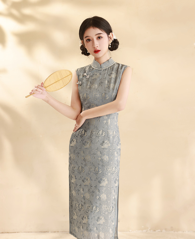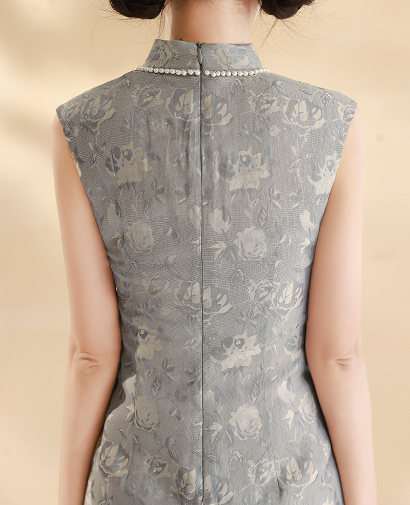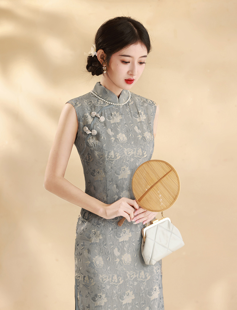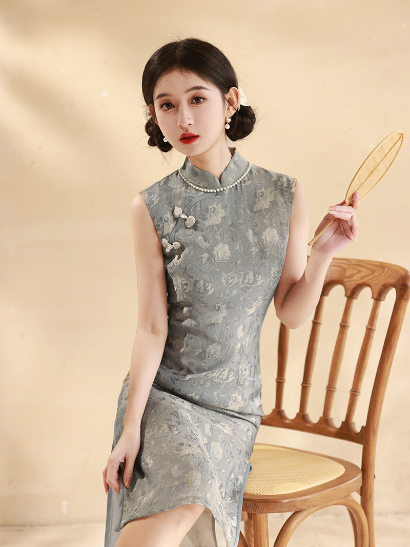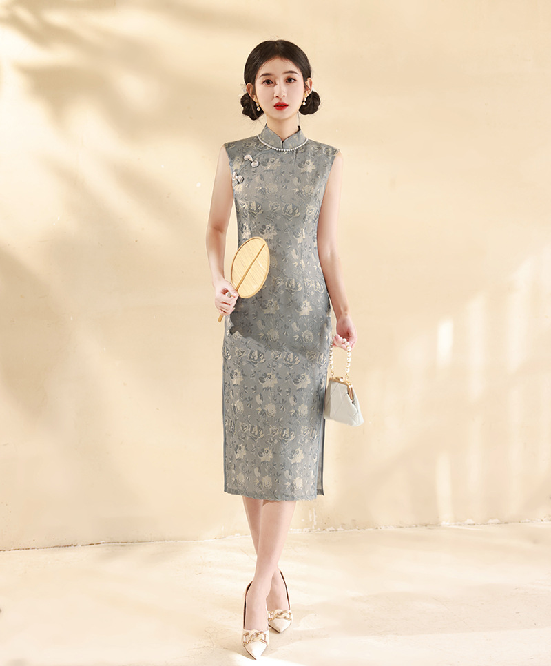 春夏新款,改良旗袍无袖气质年轻款灰色中长款旗袍XL-24006