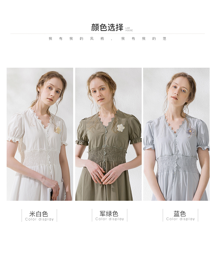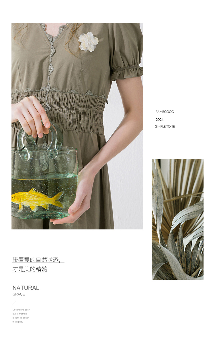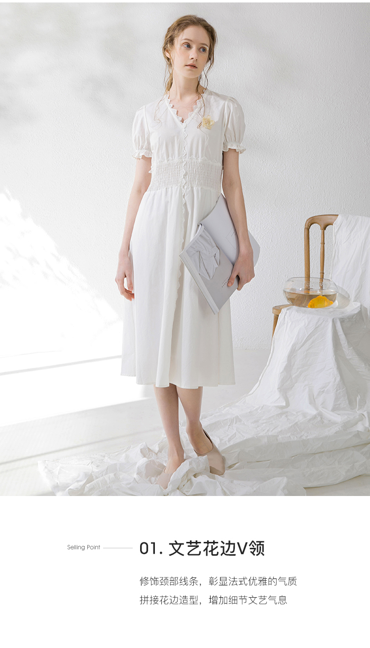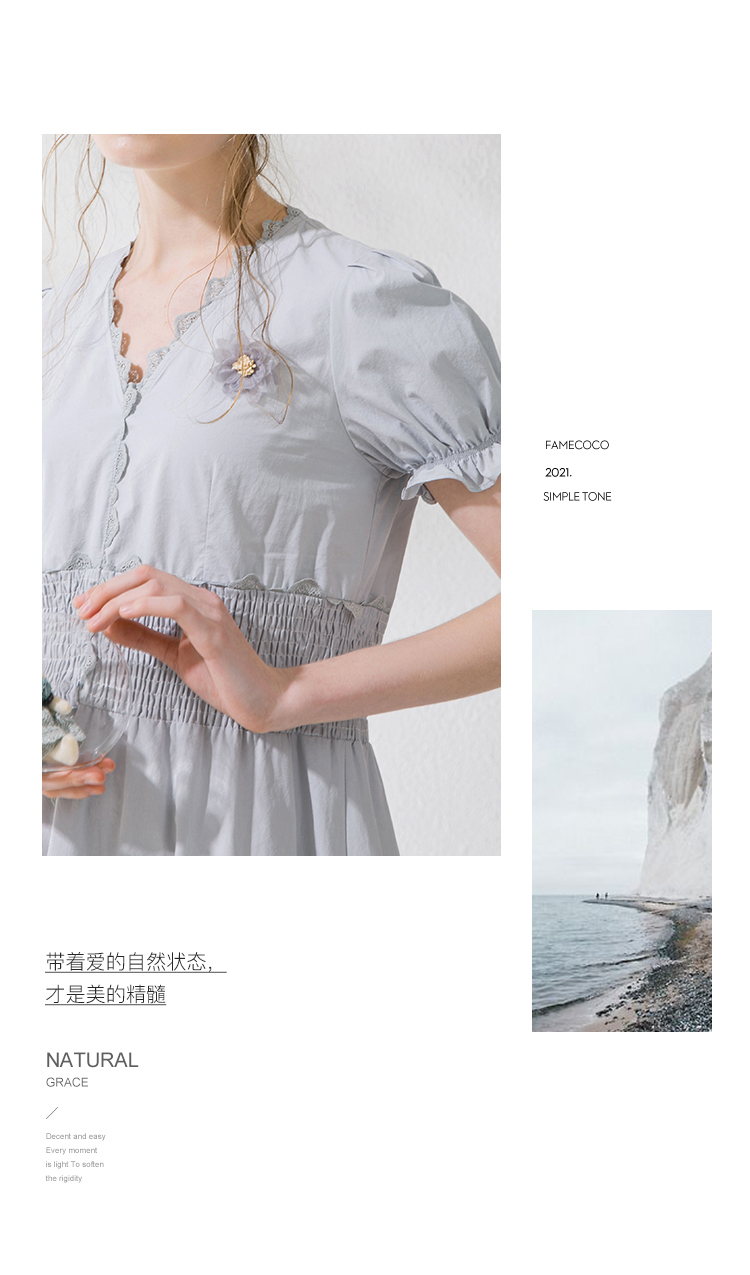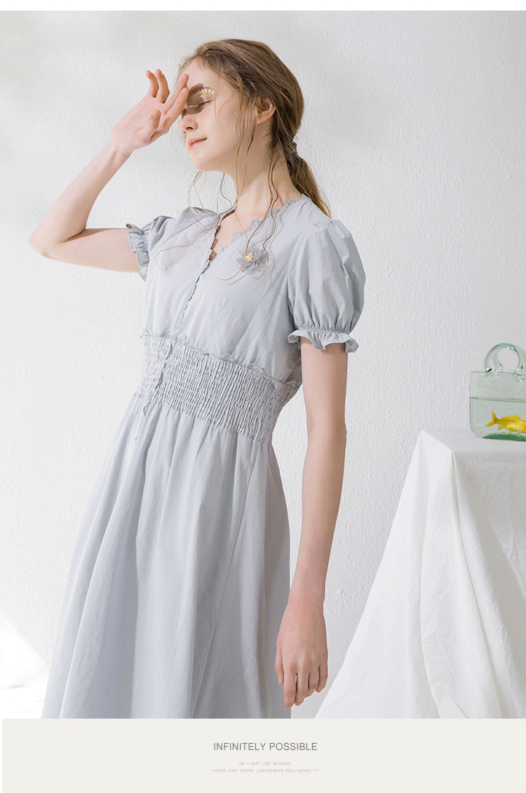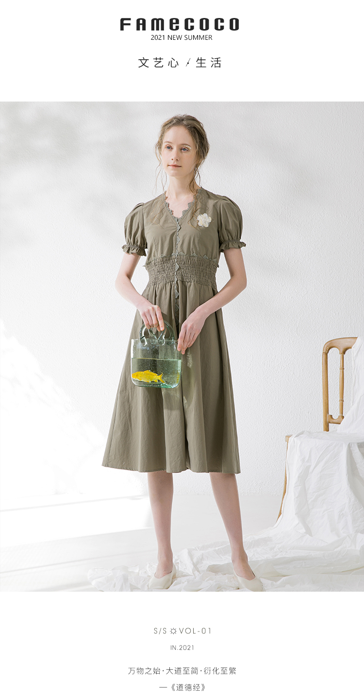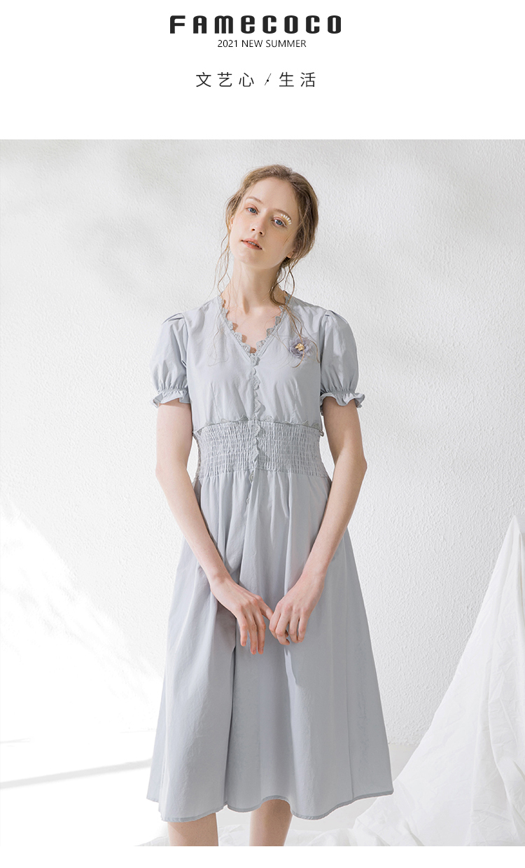 famecoco范可儿法式连衣裙女夏季v领泡泡袖长裙F213FA037