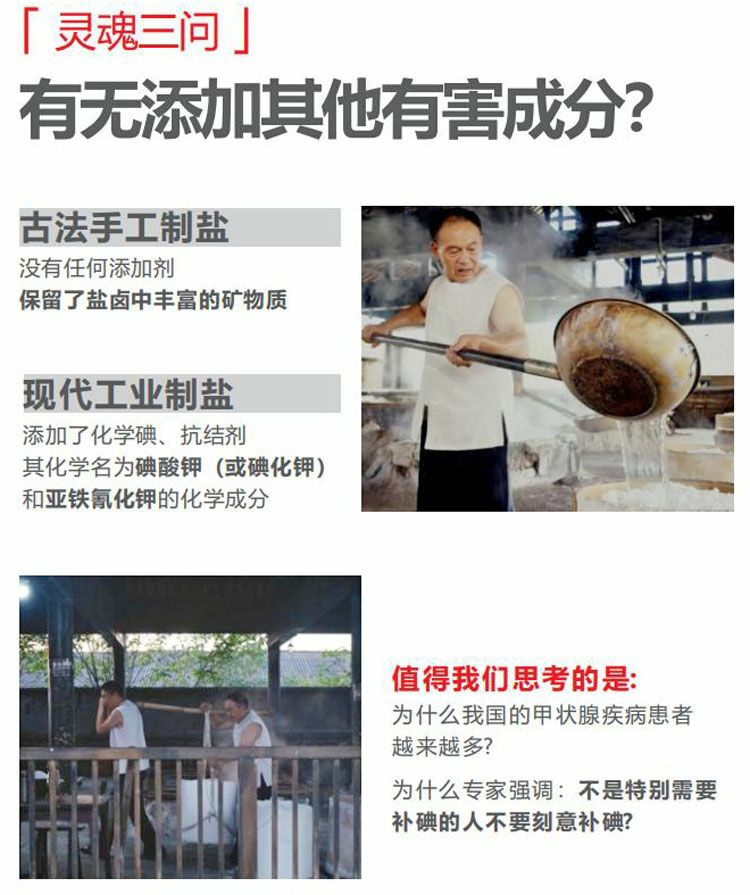 盐卤水采自1000多米深的井下,2.5亿年前形成的古海洋盐矿层,用传承千年的古老煮盐技艺,16道古法工艺熬制而成。