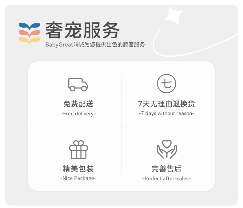 - BG母婴旗下两大品牌:babygo和babygreat,有自己的产品研发团队,完善的仓库系统和发货人员,优秀的服务团队和售后系统。安全成长,安心守护。