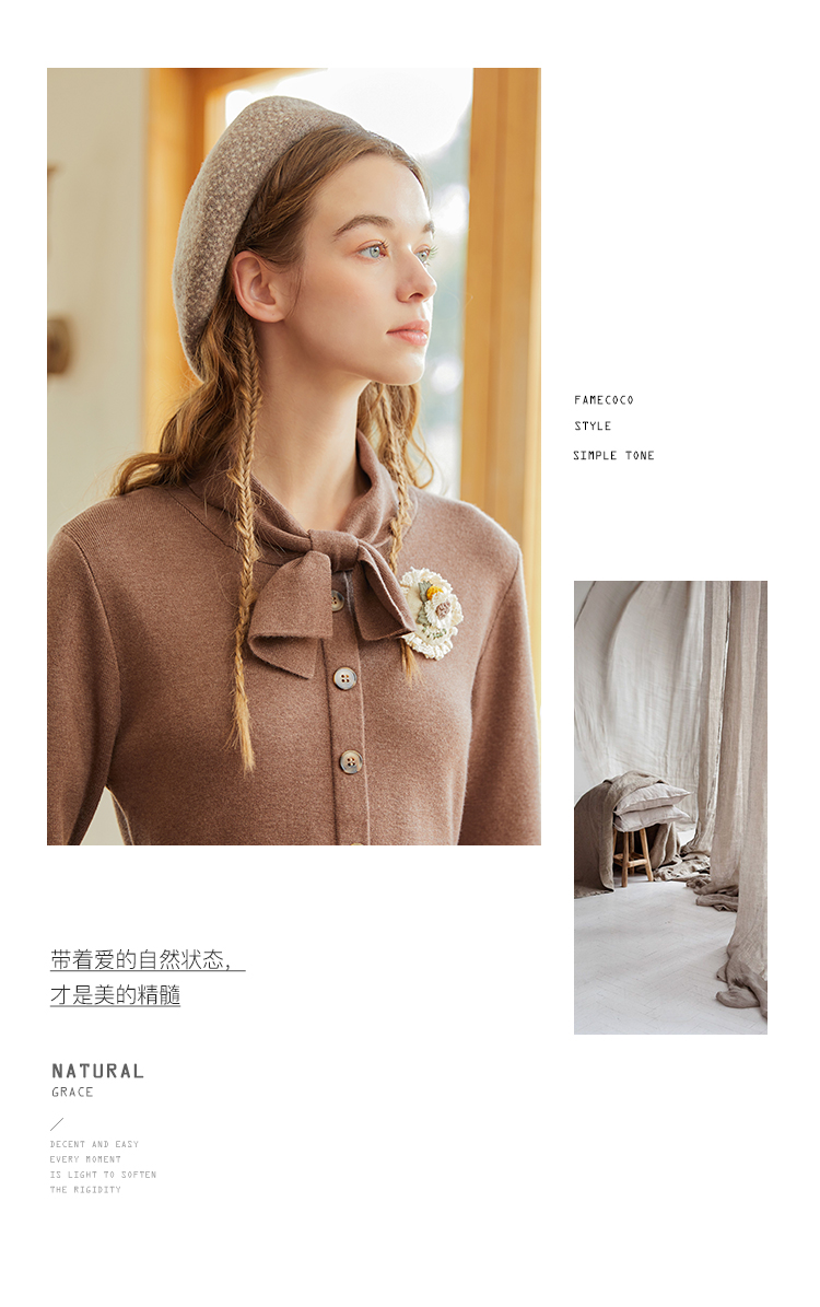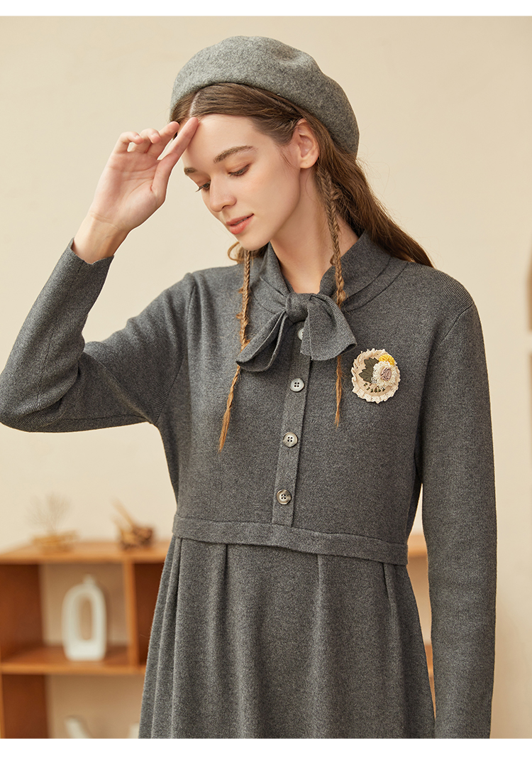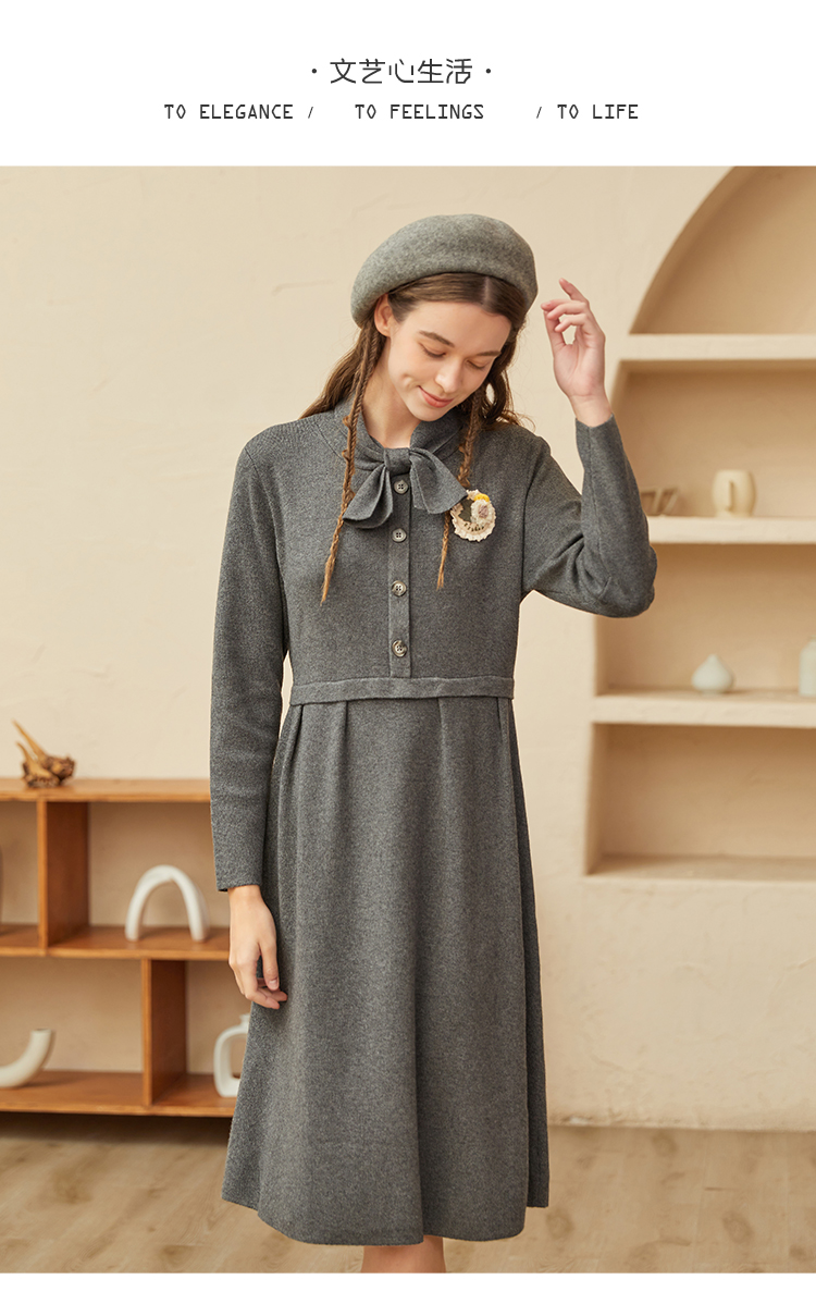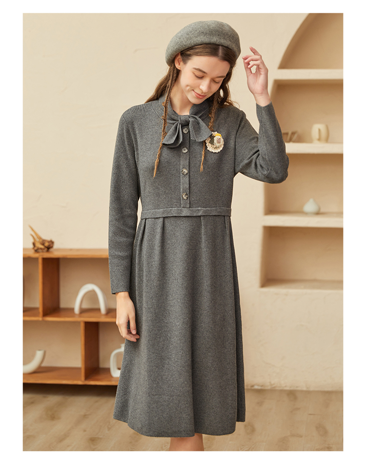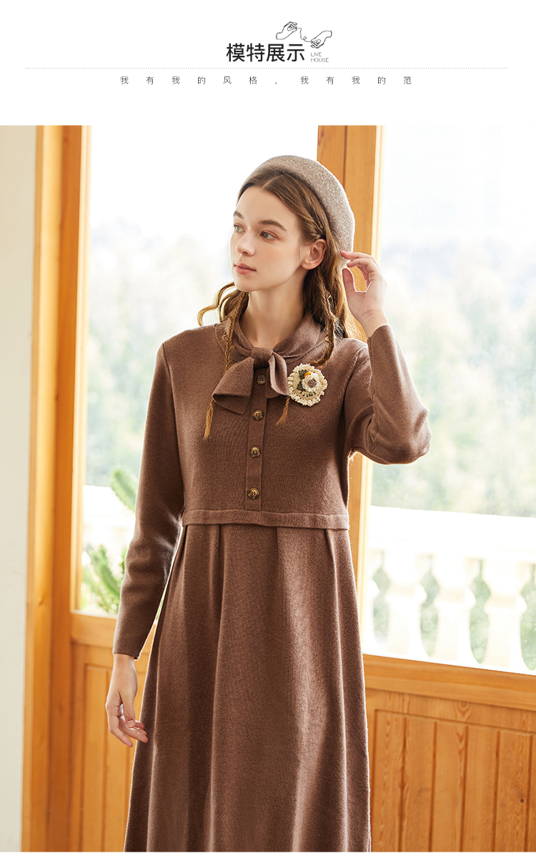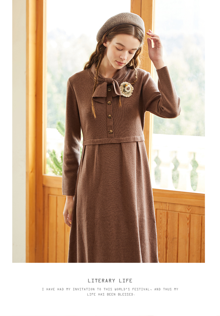 Famecoco范可儿蝴蝶结系带连衣裙秋冬款过膝长款高腰毛衣裙F228FA003