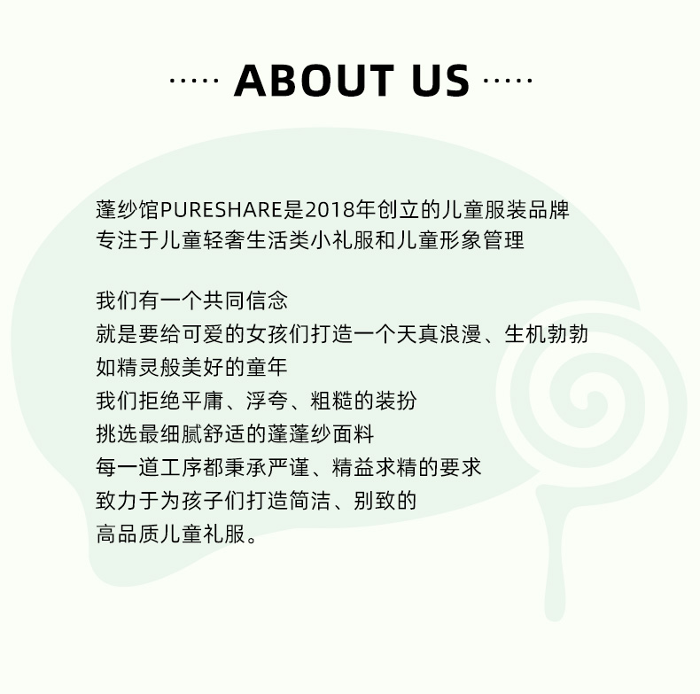 PureShare蓬纱馆,2018年创立的儿童服装品牌,专注于儿童轻奢生活类小礼服,主张“让孩子做最独特的自己”的品牌理念,为孩子们提供时尚简洁、优雅而又不失童真的生活类礼服。