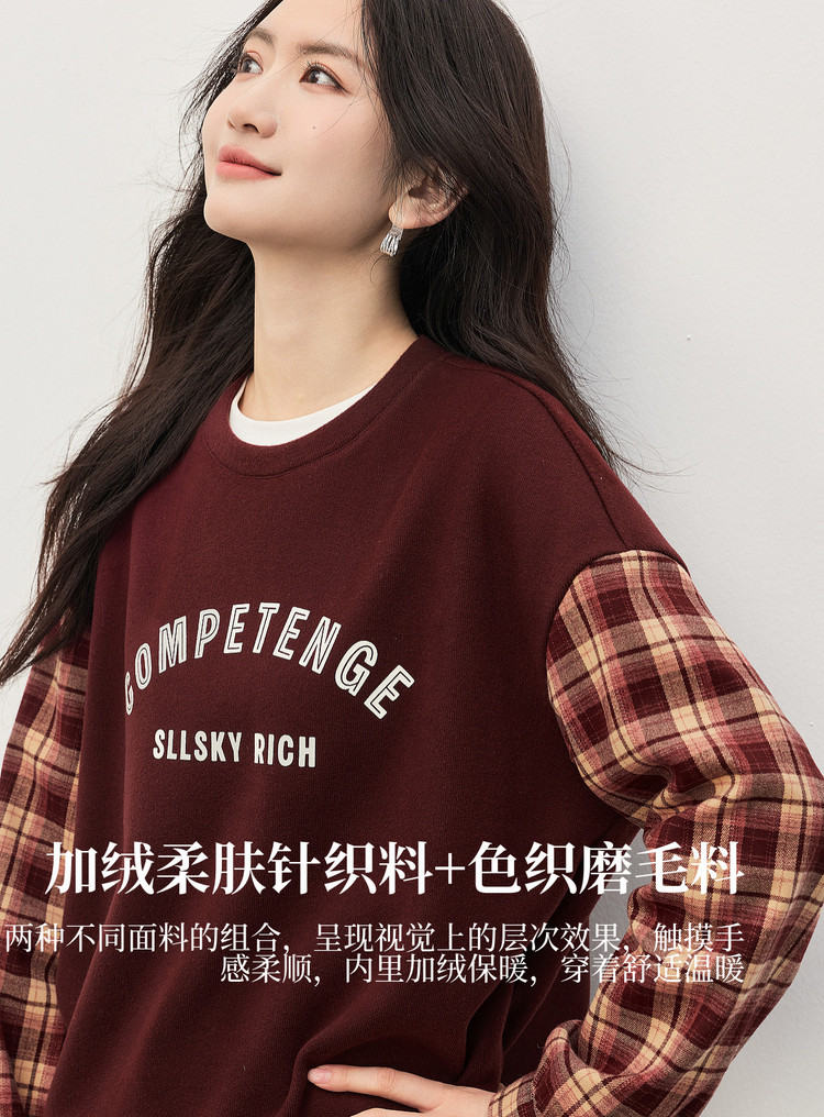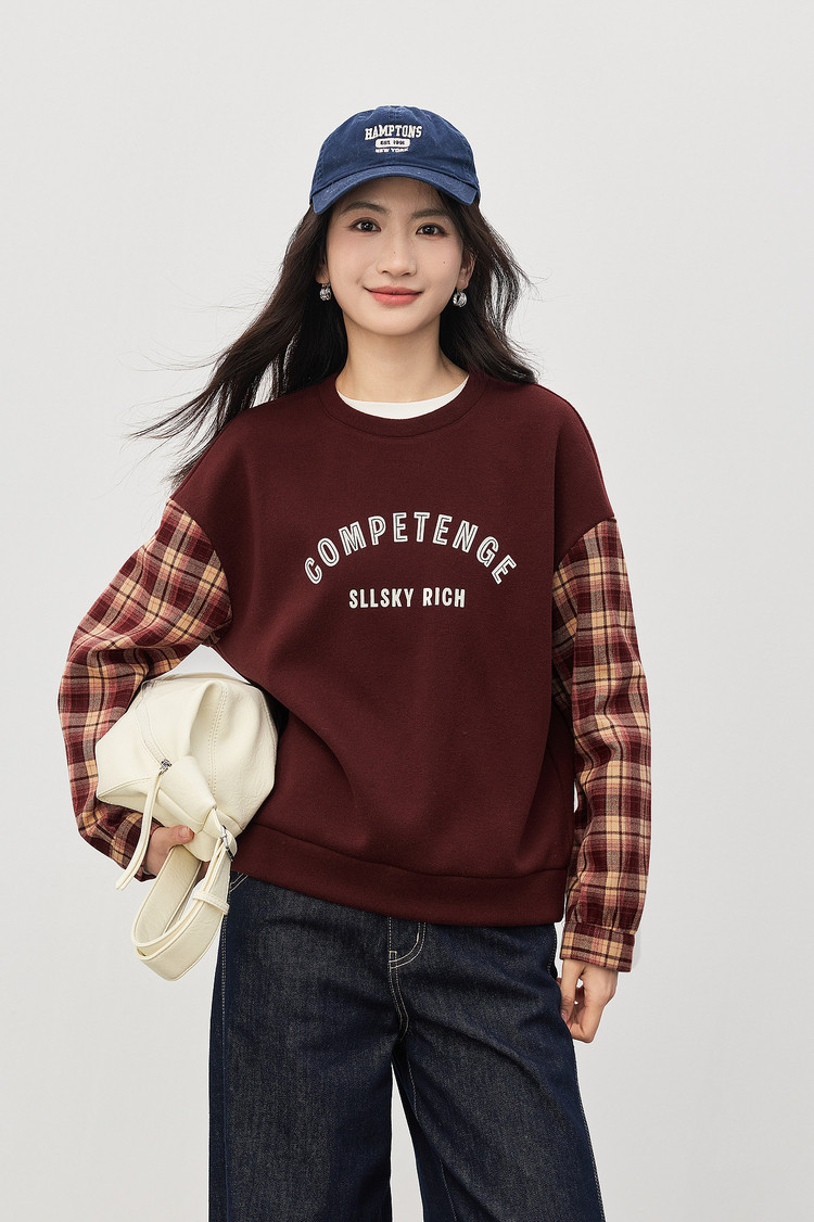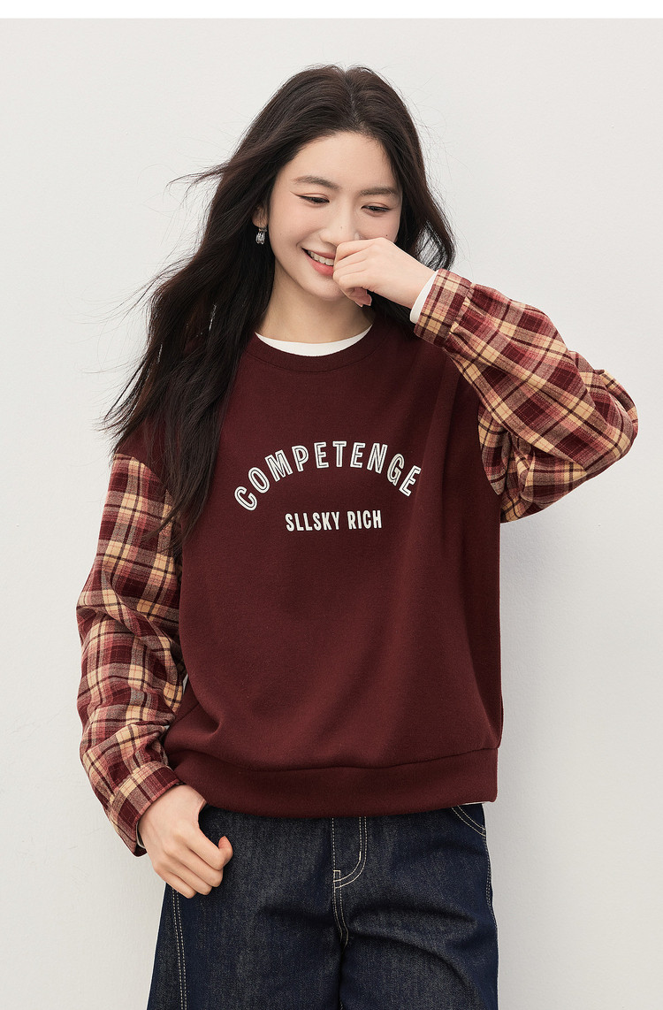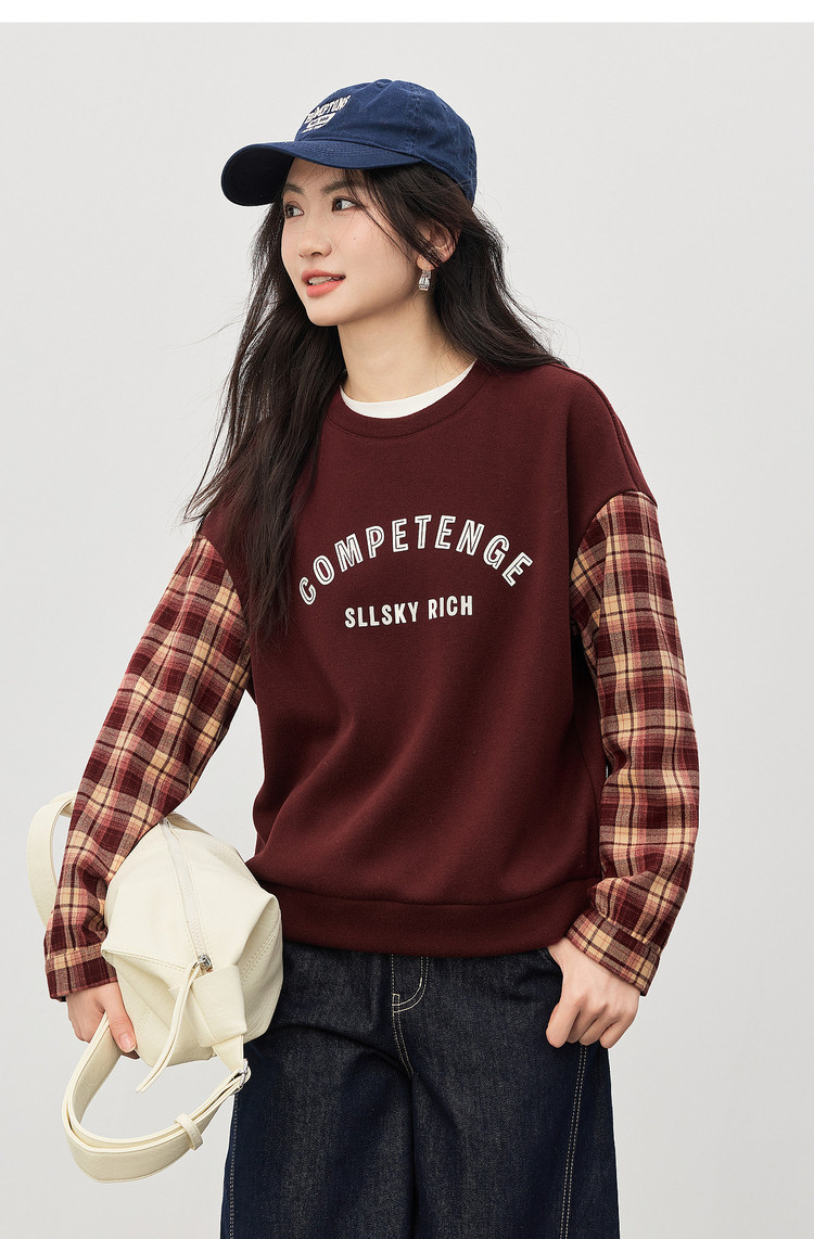 【1/21新品】熙世界美式复古加绒卫衣女宽松慵懒秋冬格纹长袖拼接字母印花上衣