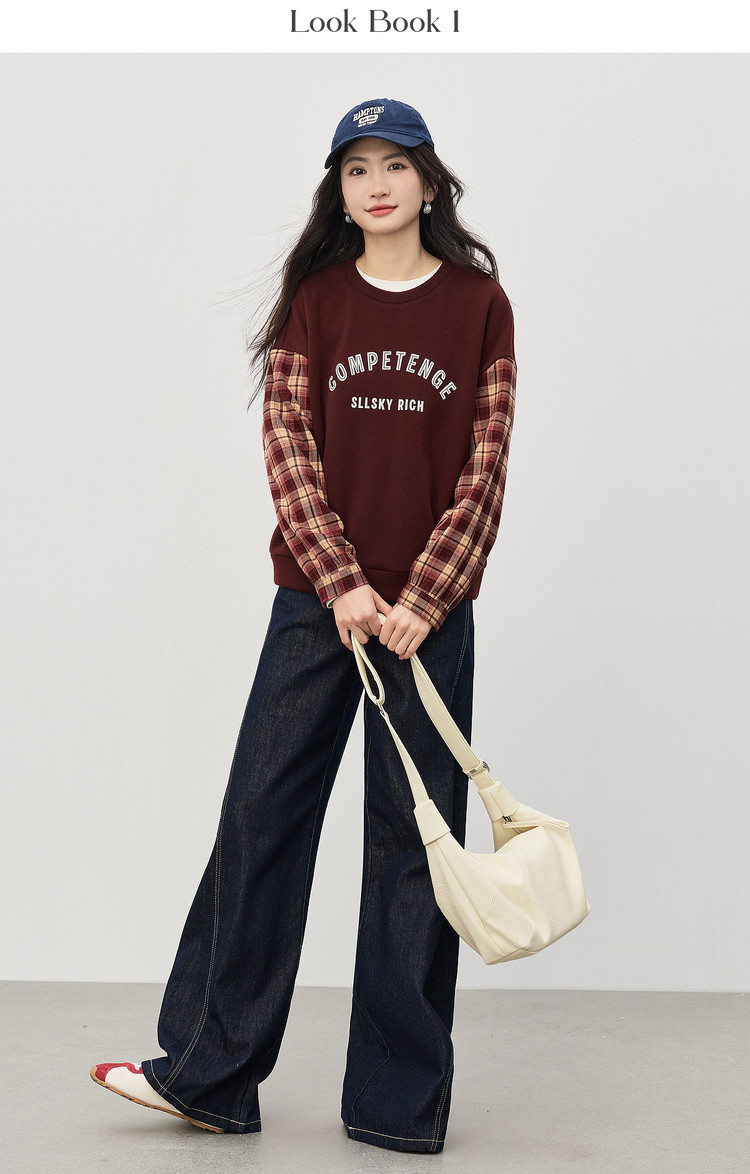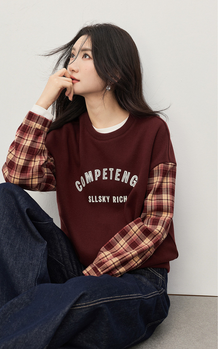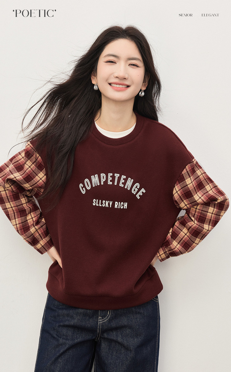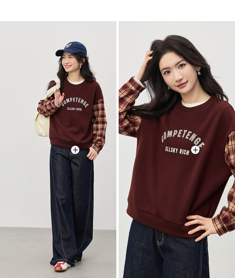 【1/21新品】熙世界美式复古加绒卫衣女宽松慵懒秋冬格纹长袖拼接字母印花上衣