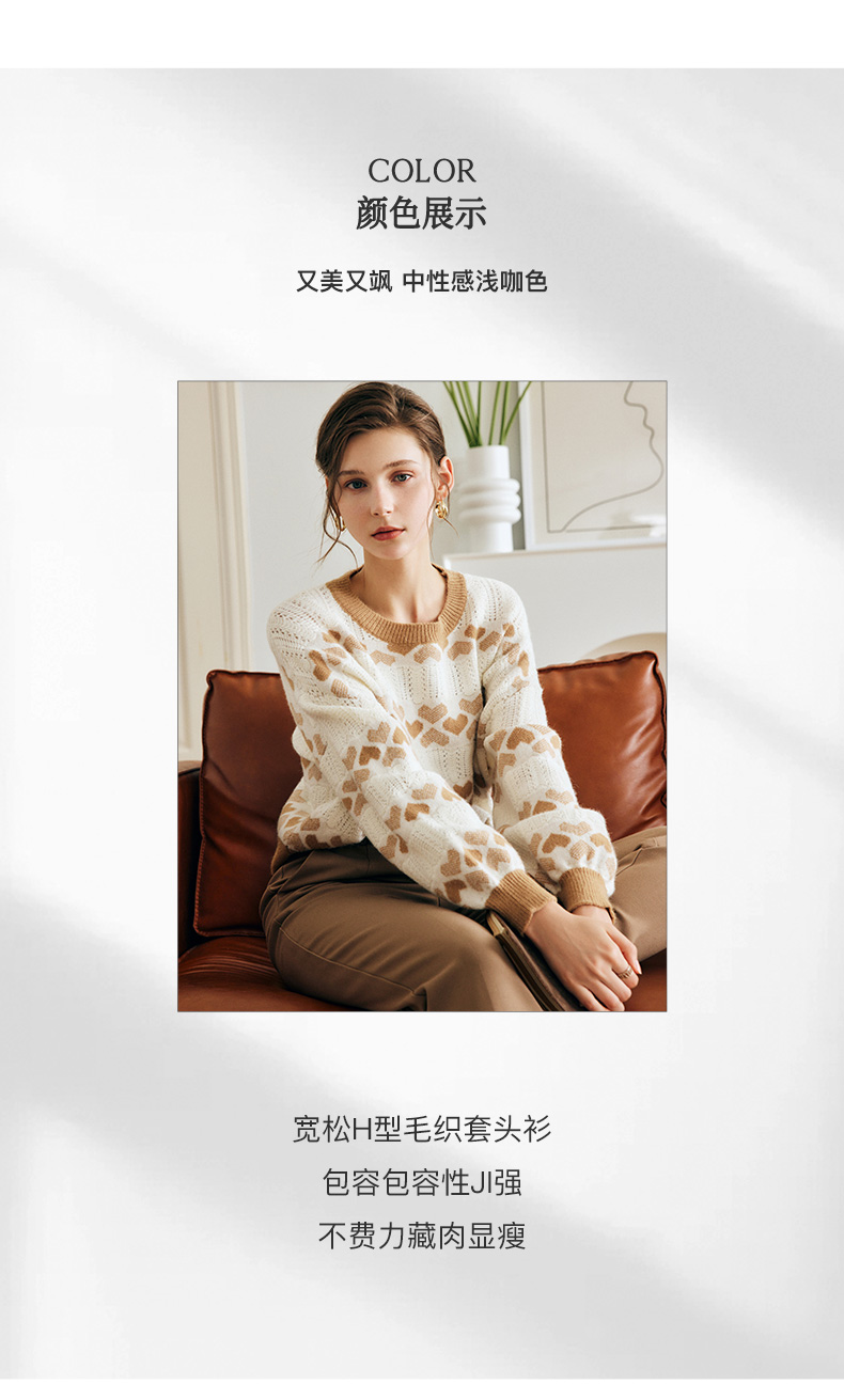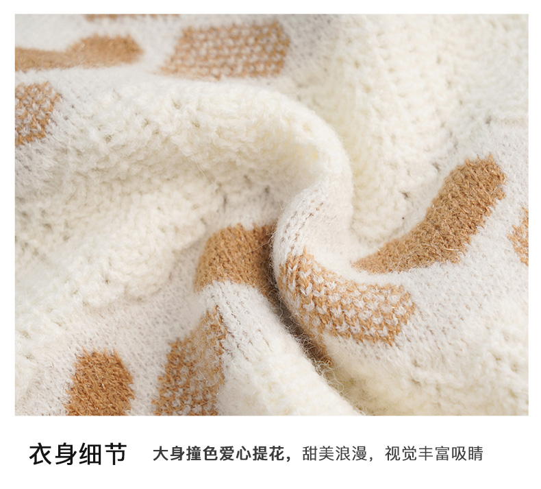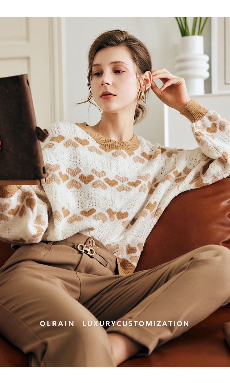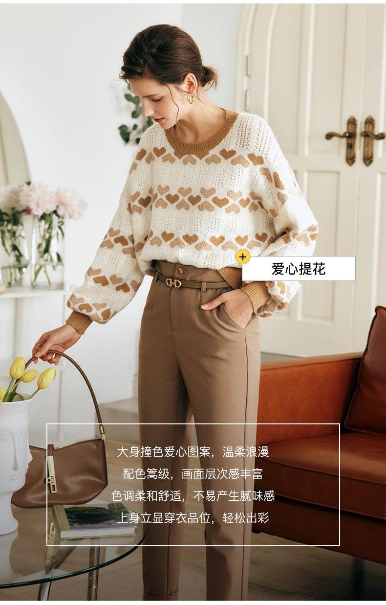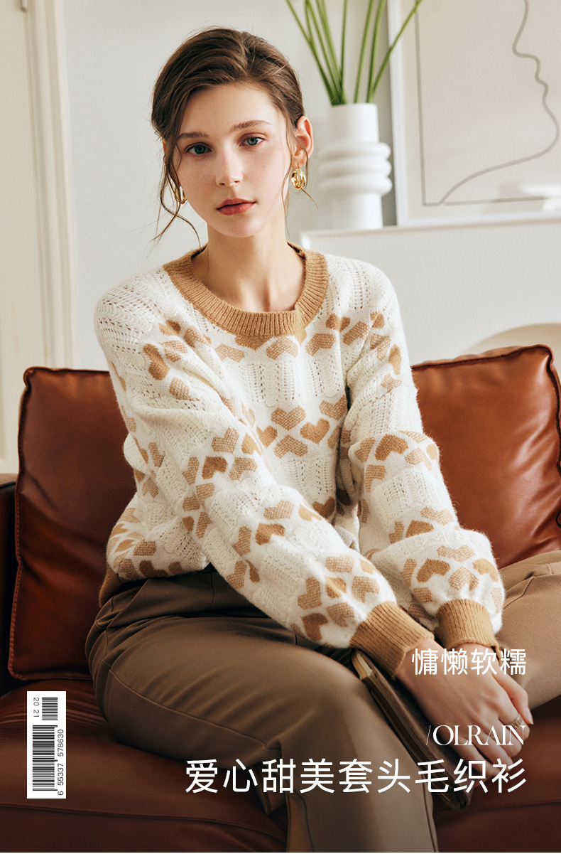 OLrain欧芮儿法式咖色提花毛衣女秋冬2022新款宽松爱心撞色针织衫