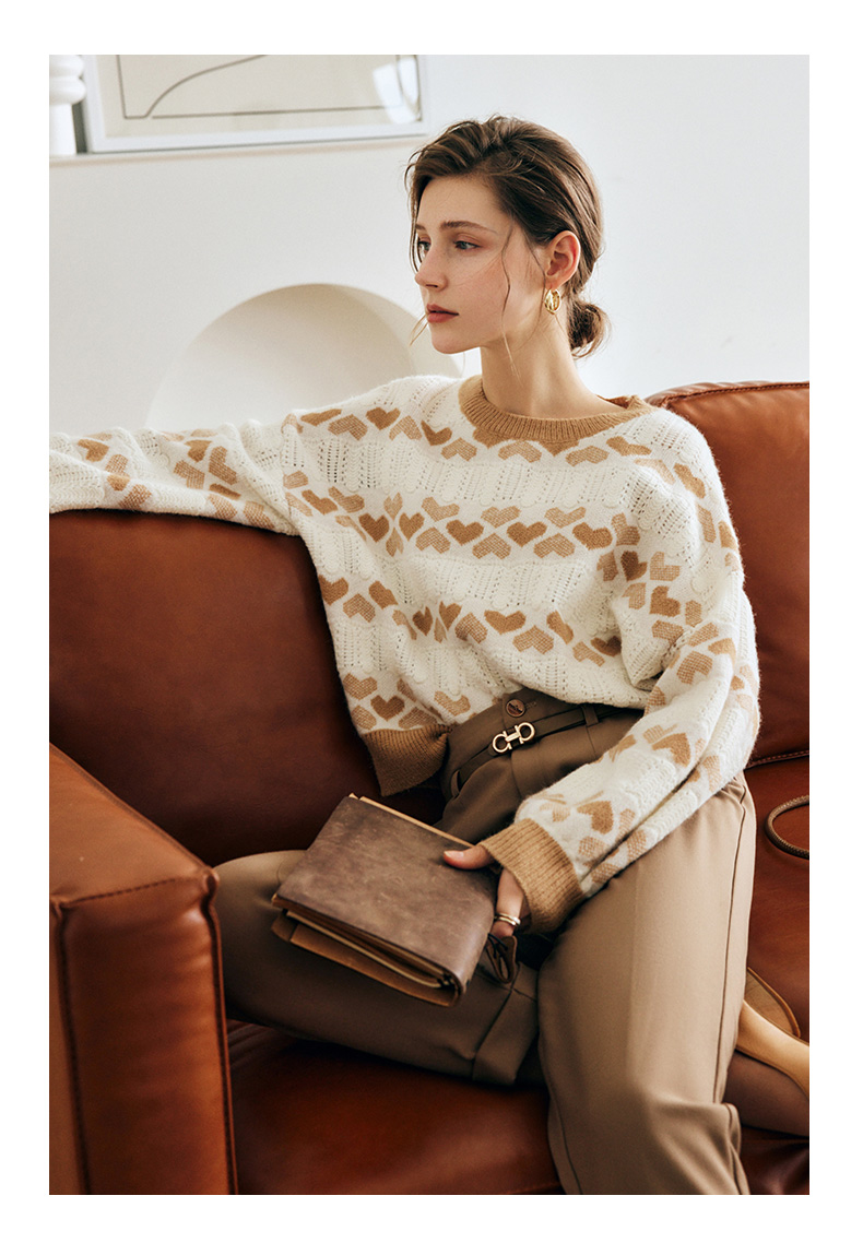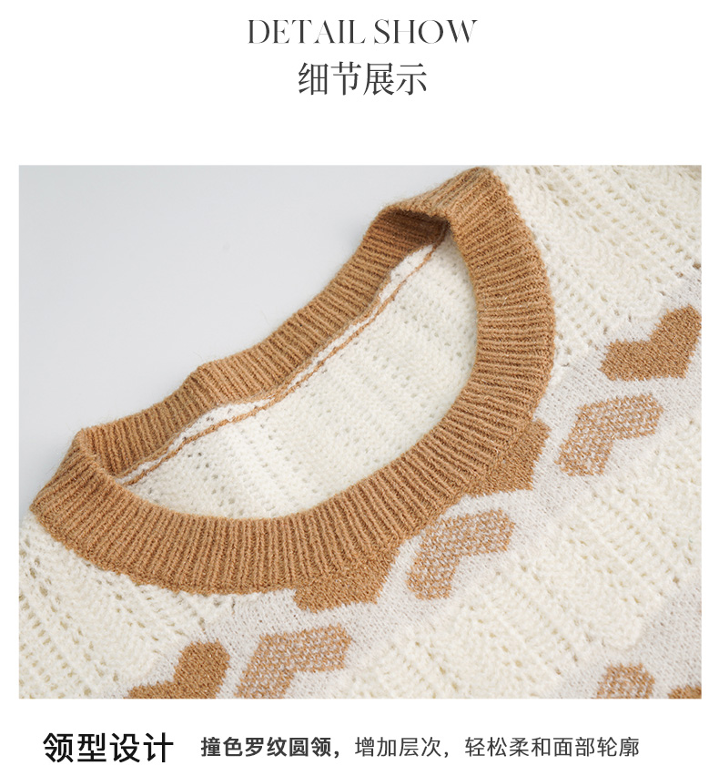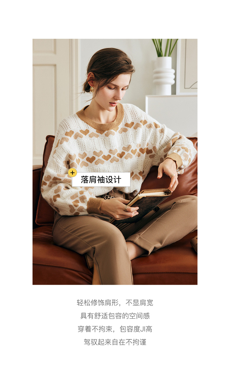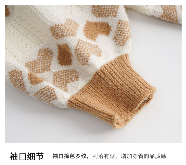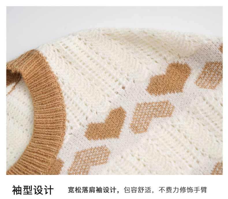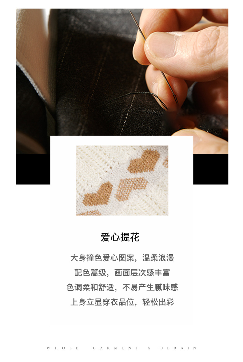 OLrain欧芮儿法式咖色提花毛衣女秋冬2022新款宽松爱心撞色针织衫